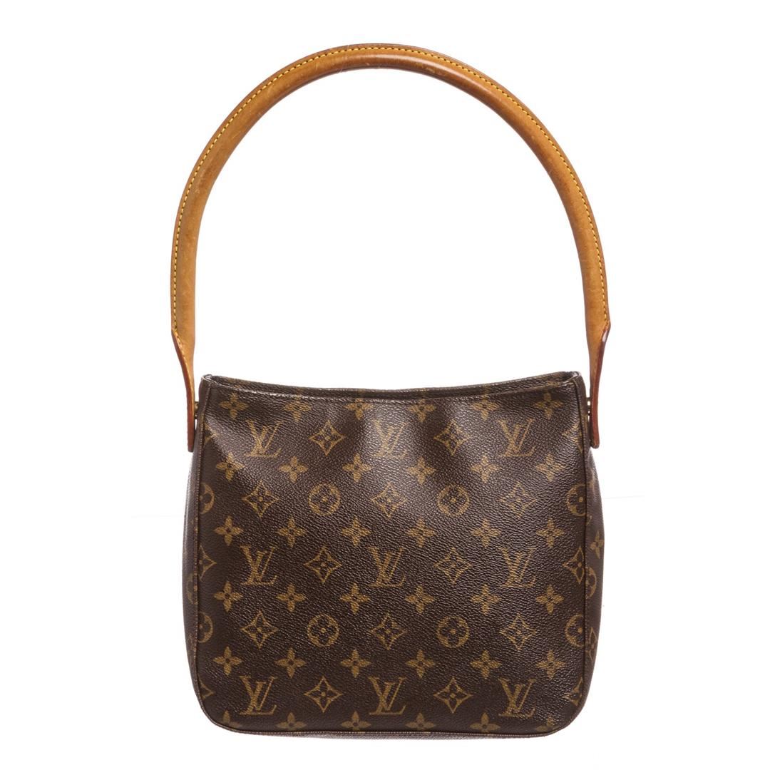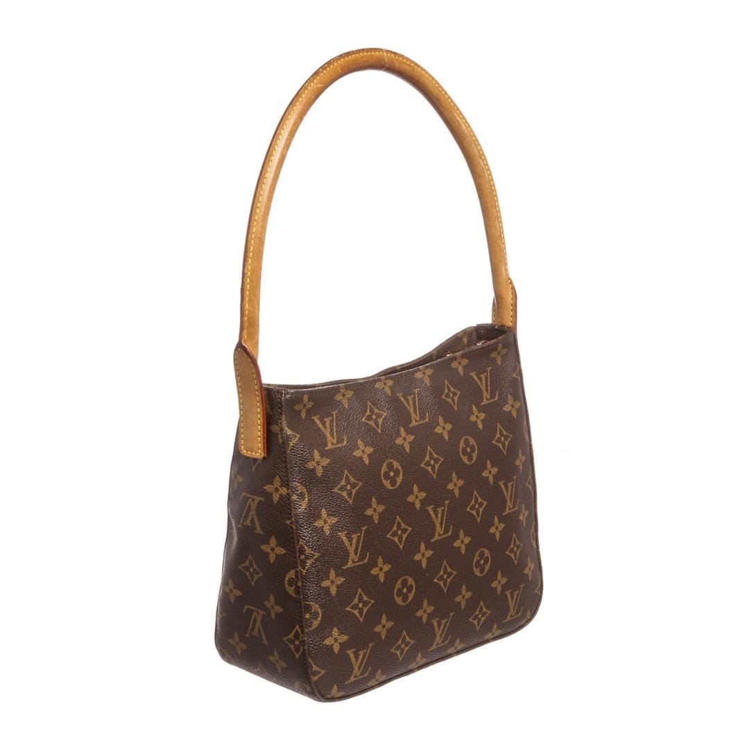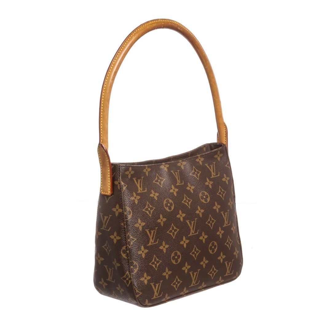 Brown and tan monogram coated canvas Louis Vuitton Looping MM with brass hardware, tan vachetta leather trim, single rolled shoulder strap, creme Alcantara lining, dual pockets at interior wall; one with zip closure and zip closure at top. Item is pre-own