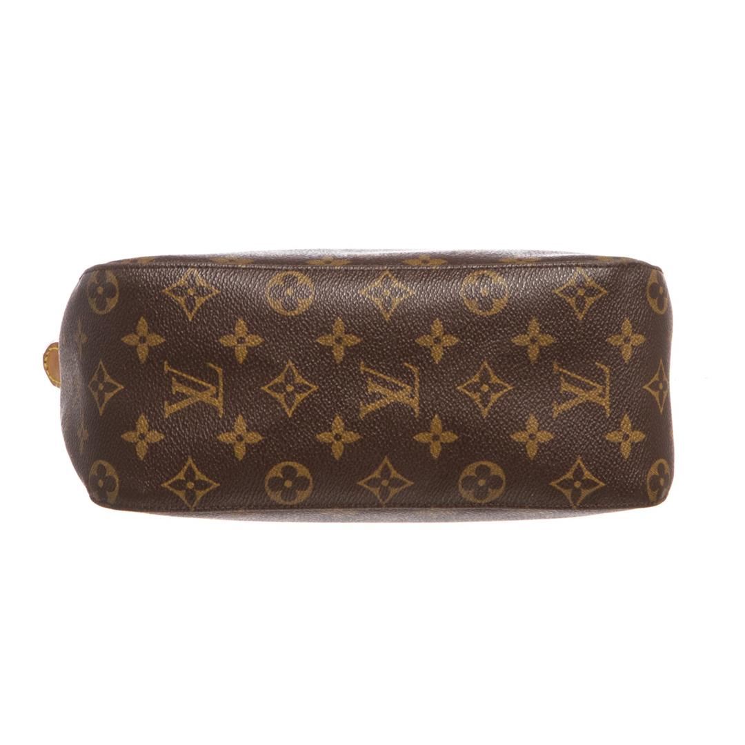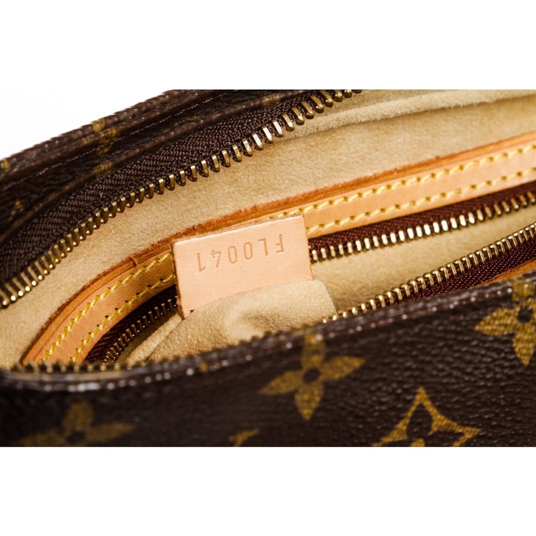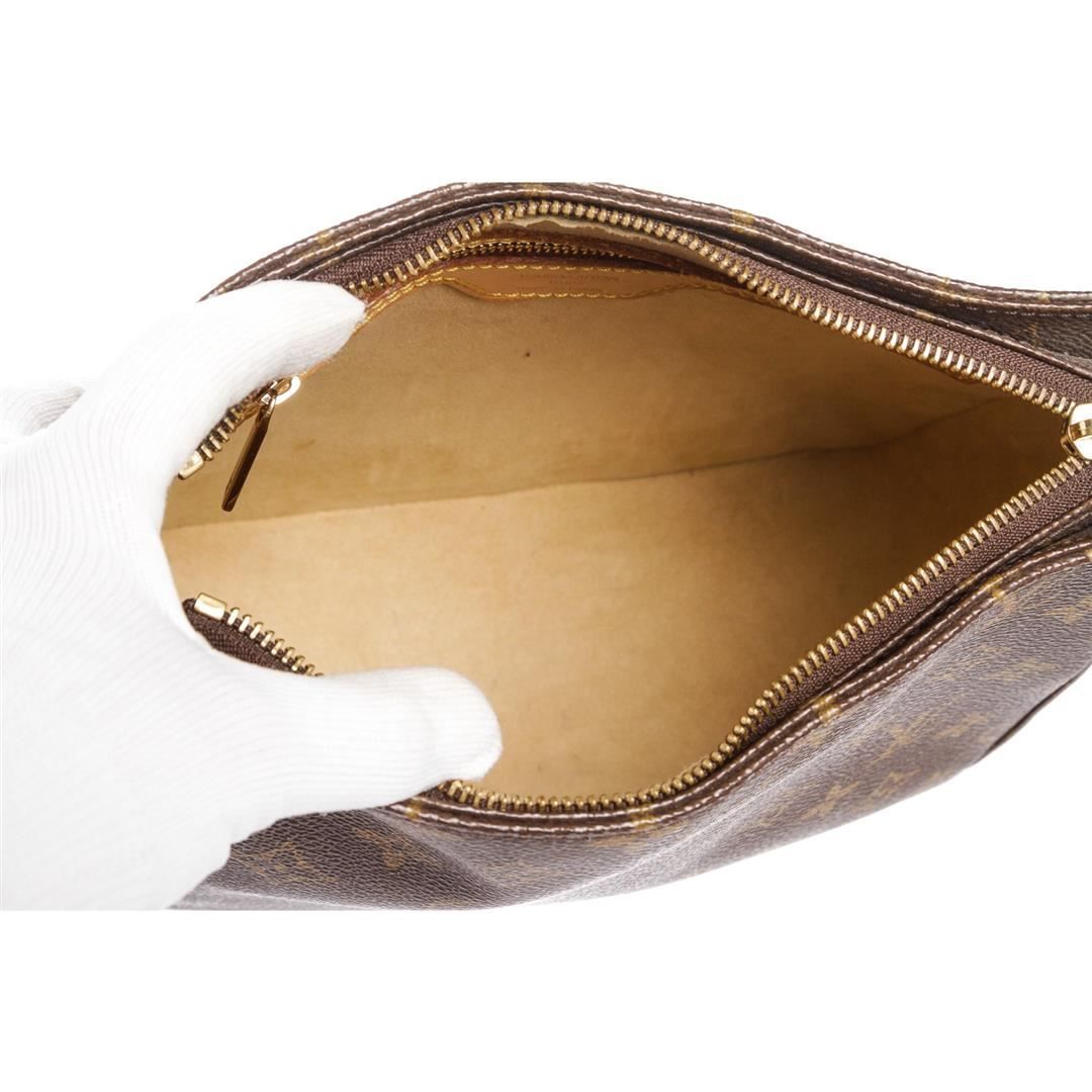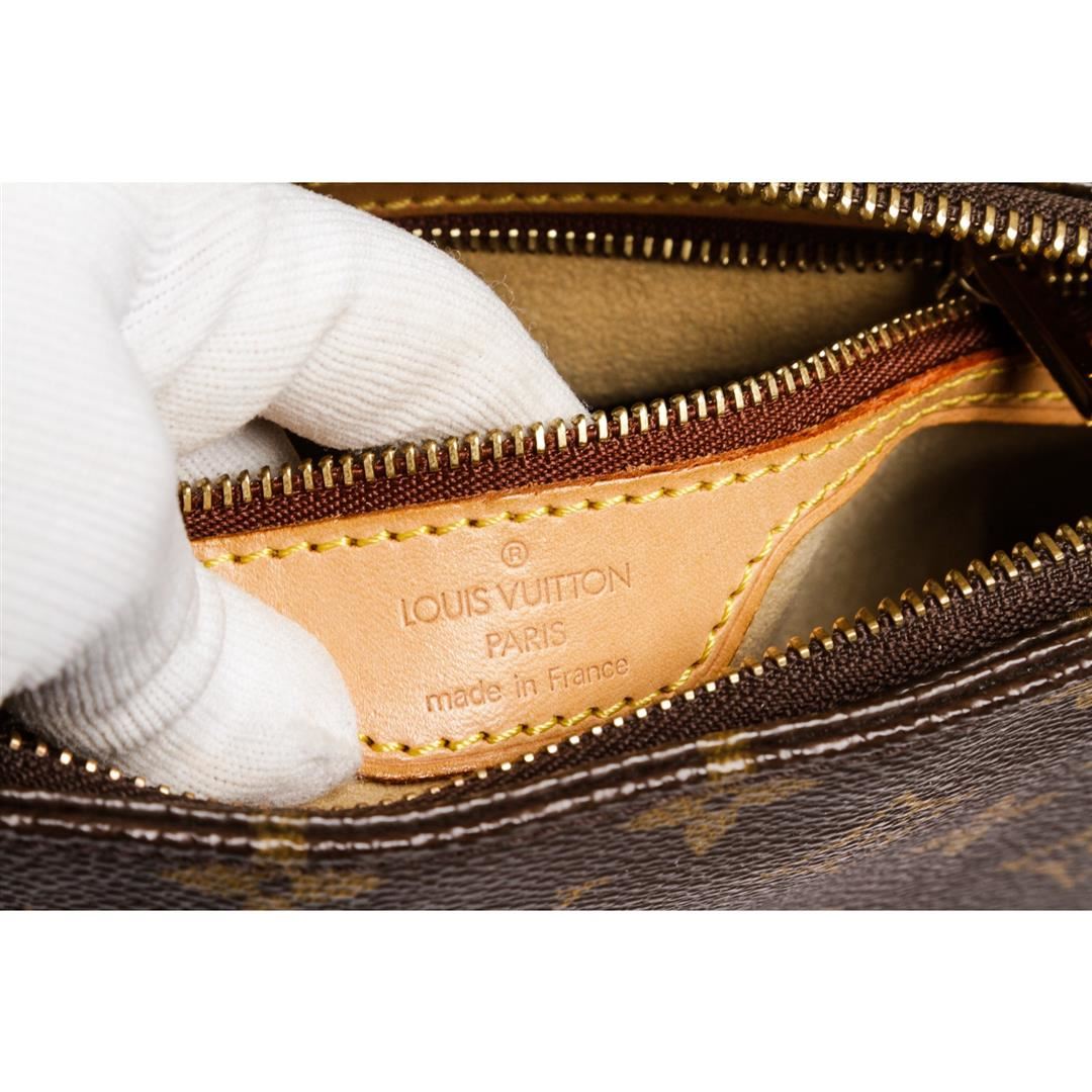 Brown and tan monogram coated canvas Louis Vuitton Looping MM with brass hardware, tan vachetta leather trim, single rolled shoulder strap, creme Alcantara lining, dual pockets at interior wall; one with zip closure and zip closure at top. Item is pre-own
