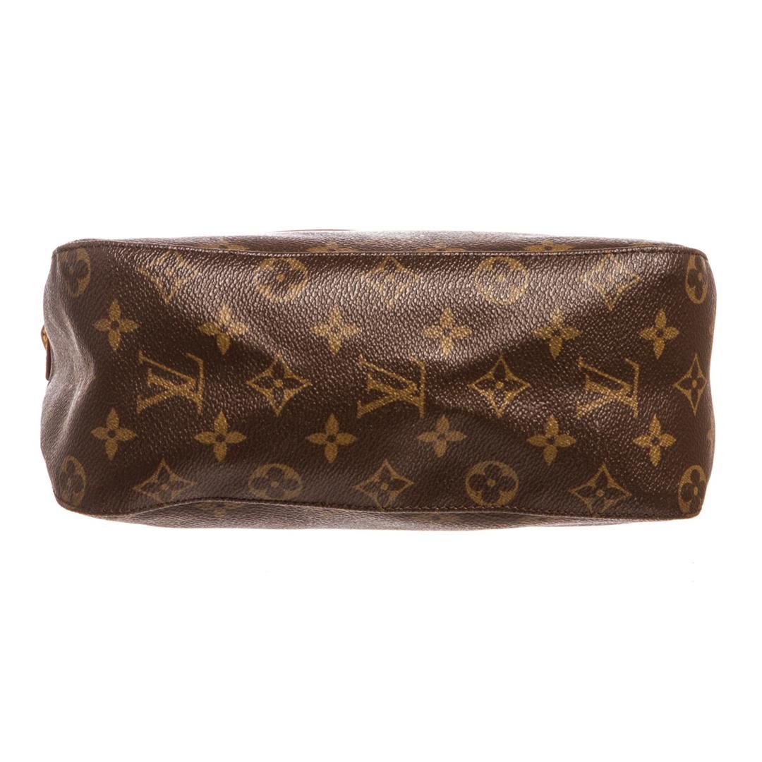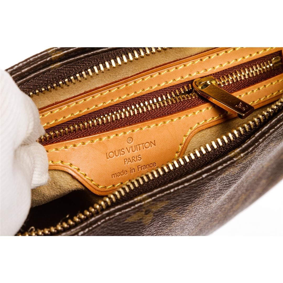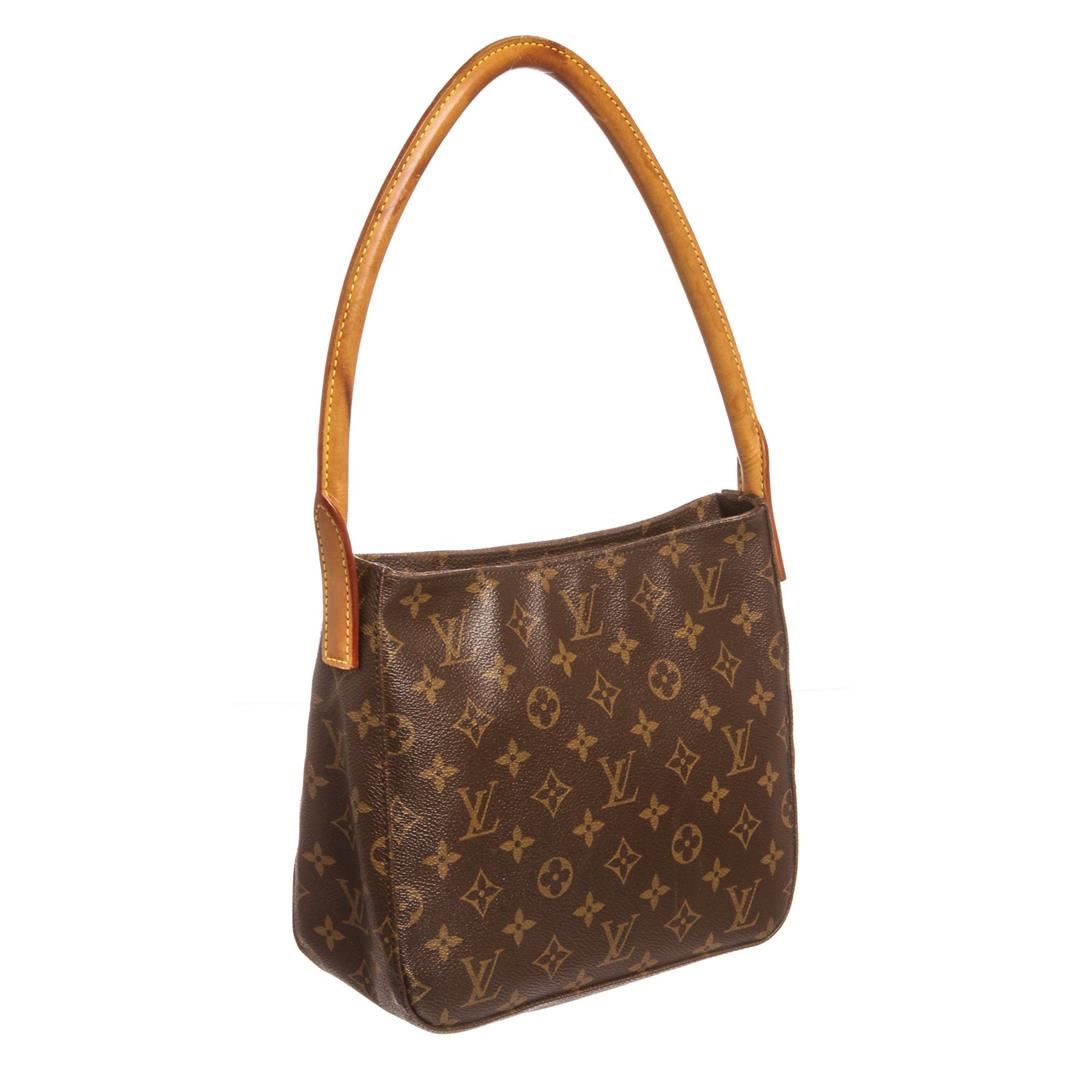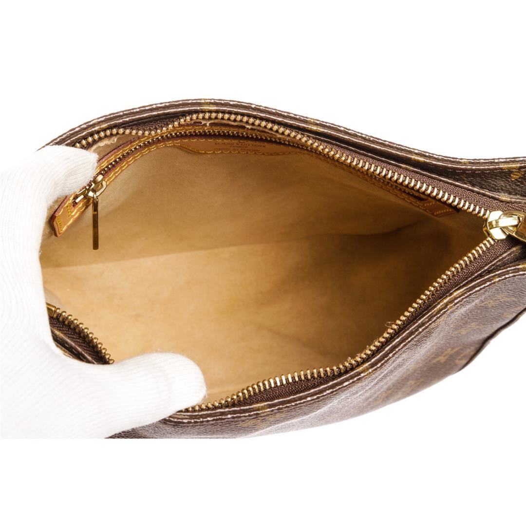 Brown and tan monogram coated canvas Louis Vuitton Looping MM with brass hardware, tan vachetta leather trim, single rolled shoulder strap, creme Alcantara lining, dual pockets at interior wall; one with zip closure and zip closure at top. Item is pre-owned. Item Dimensions: 9.5"x3.5"x8.25"xStrap Drop:8"/24.1cmx8.8cmx20.9cmx20.3cm.