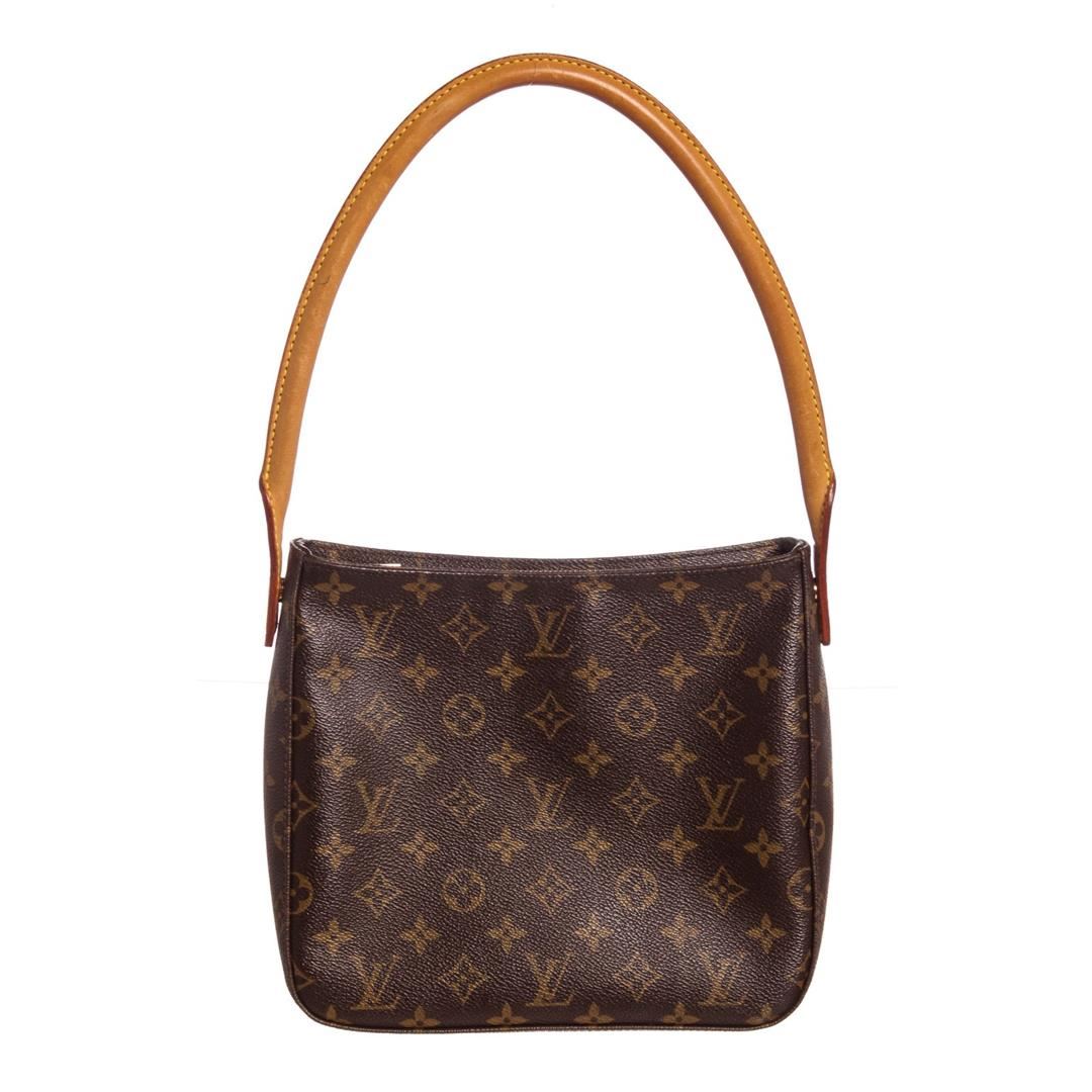 Brown and tan monogram coated canvas Louis Vuitton Looping MM with brass hardware, tan vachetta leather trim, single rolled shoulder strap, creme Alcantara lining, dual pockets at interior wall; one with zip closure and zip closure at top. Dimensions = 9.5"x3.5"x8.25"xStrap Drop:8"/24.1cmx8.8cmx20.9cmx20.3cm. Item is pre-owned.