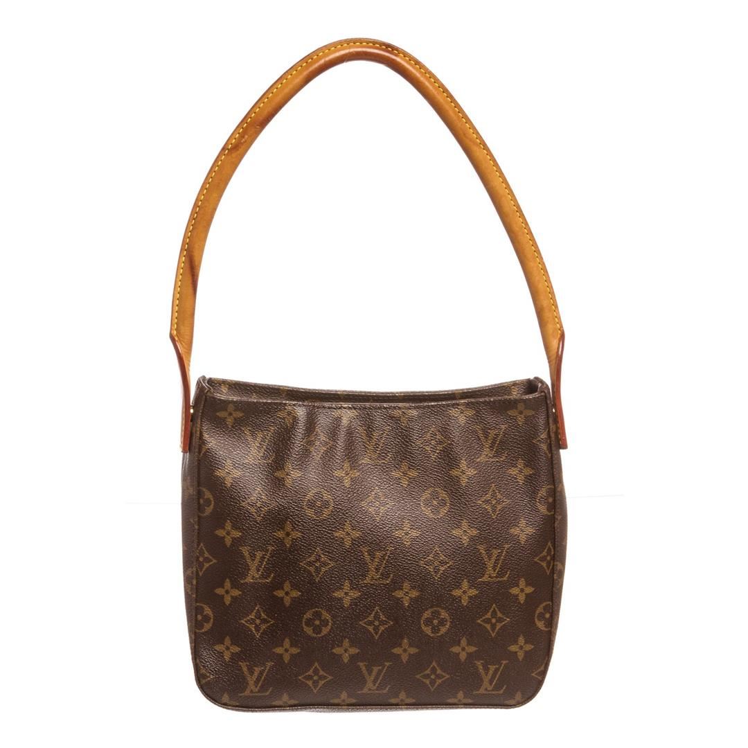 Brown and tan monogram coated canvas Louis Vuitton Looping MM with brass hardware, tan vachetta leather trim, single rolled shoulder strap, creme Alcantara lining, dual pockets at interior wall; one with zip closure and zip closure at top. Item is pre-owned. Item Dimensions: 9.5"x3.5"x8.25"xStrap Drop:8"/24.1cmx8.8cmx20.9cmx20.3cm.