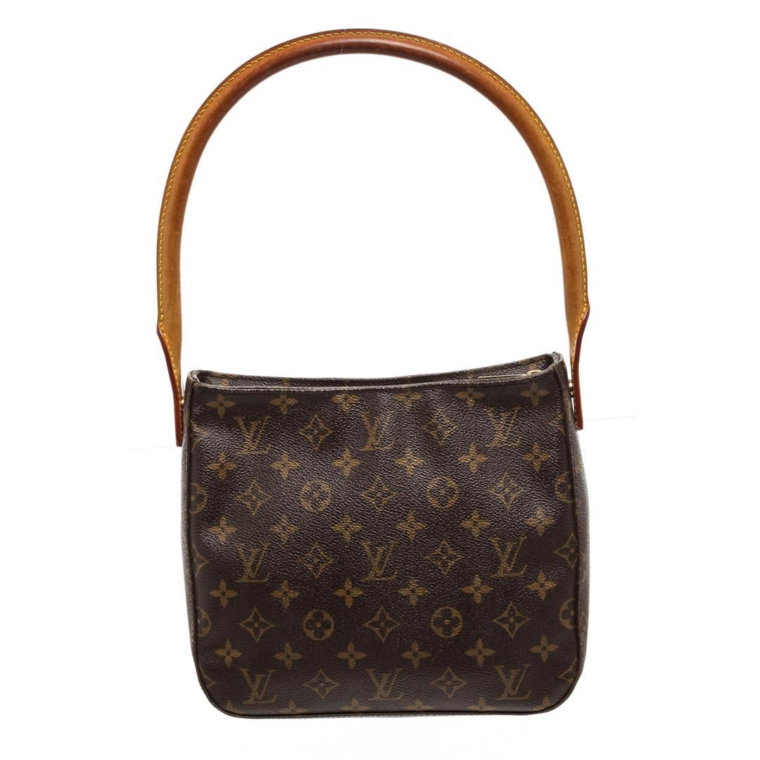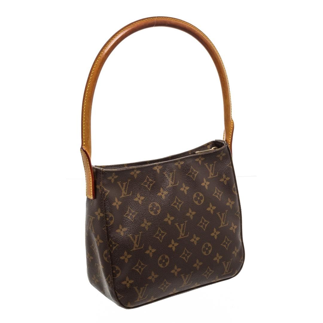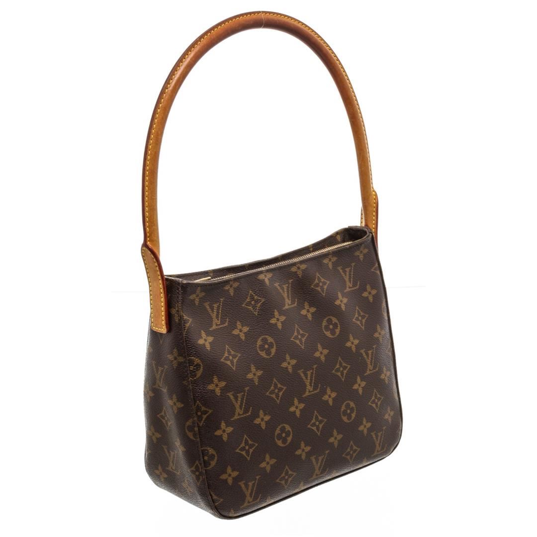 Brown and tan monogram coated canvas Louis Vuitton Looping MM with brass hardware, tan vachetta leather trim, single rolled shoulder strap, creme Alcantara lining, dual pockets at interior wall; one with zip closure and zip closure at top.