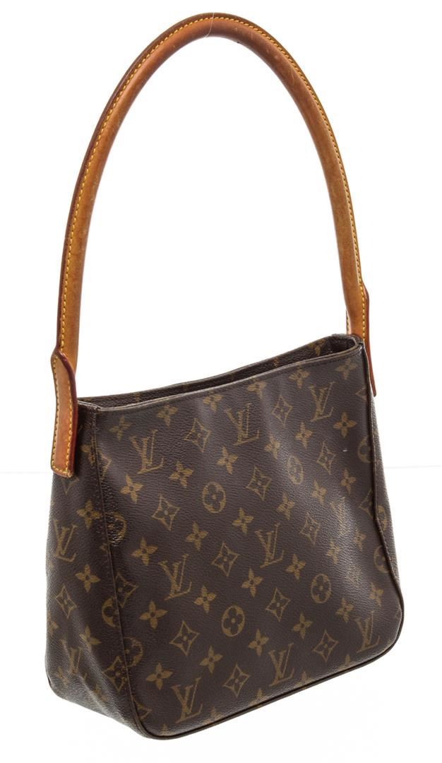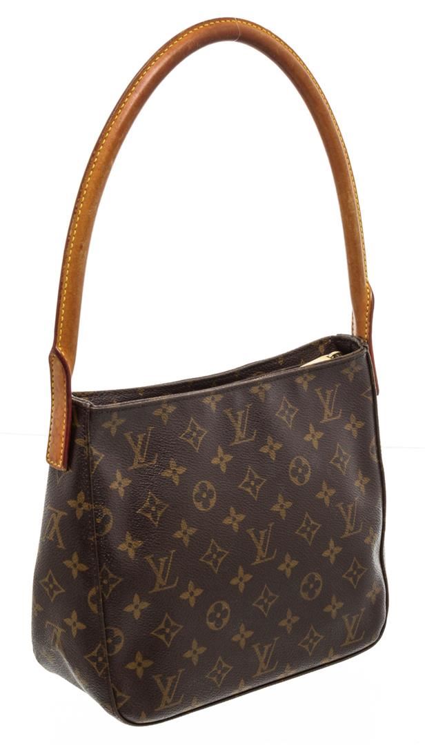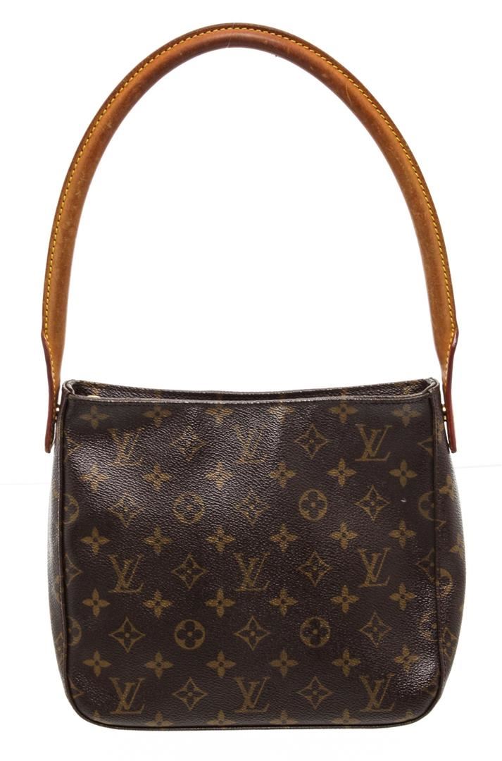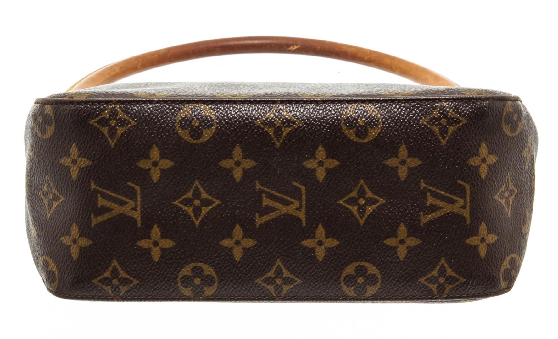 Brown and tan monogram coated canvas Louis Vuitton Looping MM with brass hardware, tan vachetta leather trim, single rolled shoulder strap, creme Alcantara lining, dual pockets at interior wall; one with zip closure and zip closure at top.
