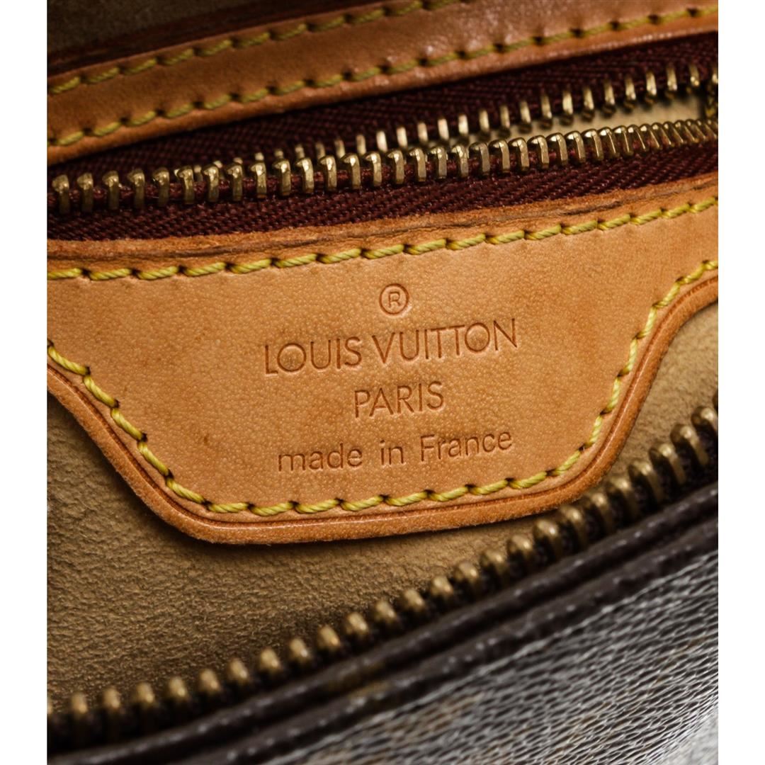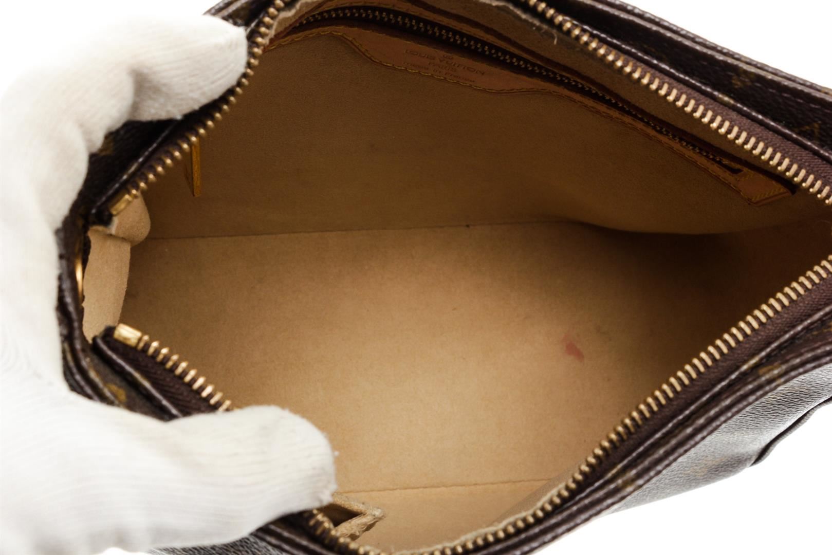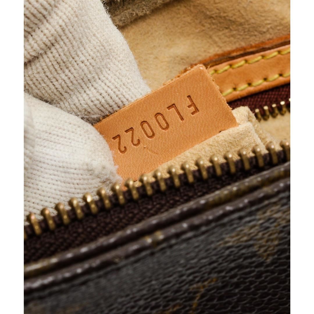 Brown and tan monogram coated canvas Louis Vuitton Looping MM with brass hardware, tan vachetta leather trim, single rolled shoulder strap, creme Alcantara lining, dual pockets at interior wall; one with zip closure and zip closure at top.