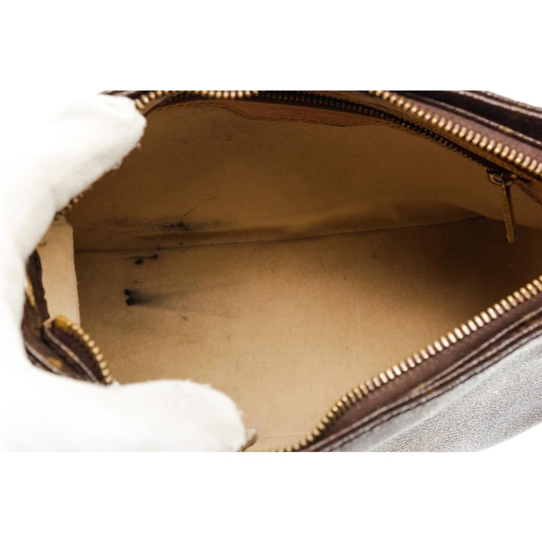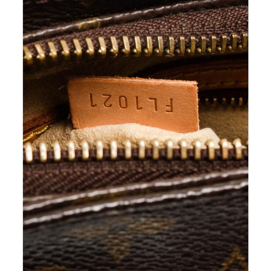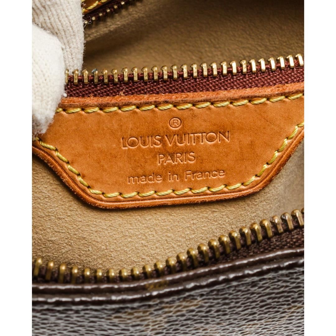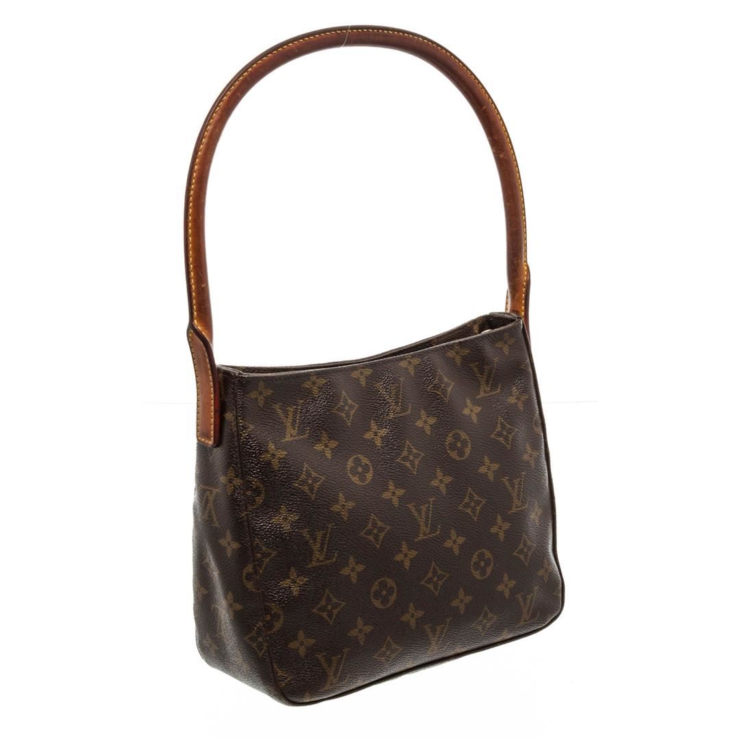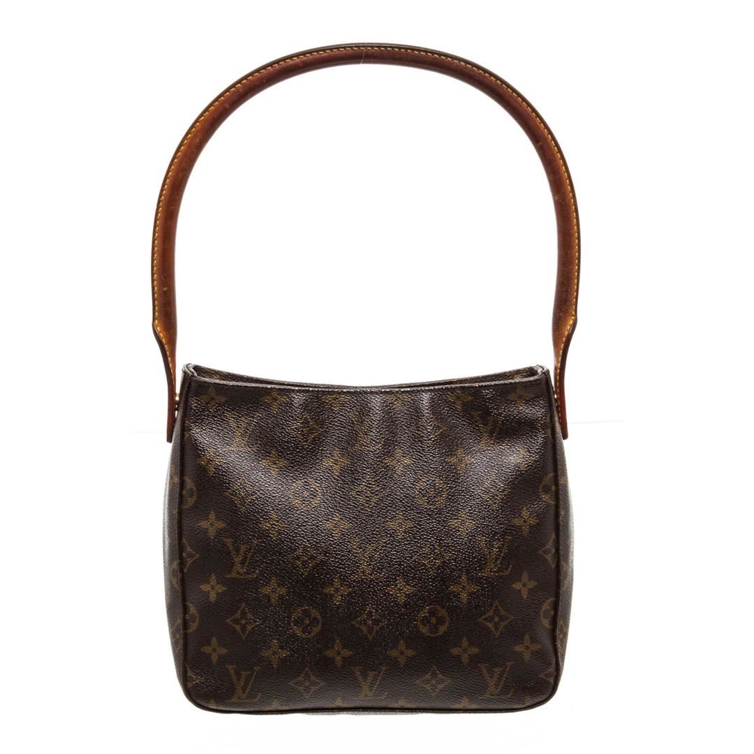 Brown and tan monogram coated canvas Louis Vuitton Looping MM with brass hardware, tan vachetta leather trim, single rolled shoulder strap, creme Alcantara lining, dual pockets at interior wall; one with zip closure and zip closure at top.