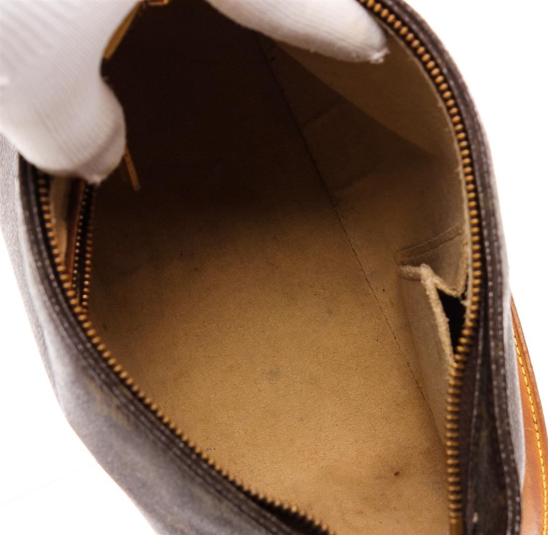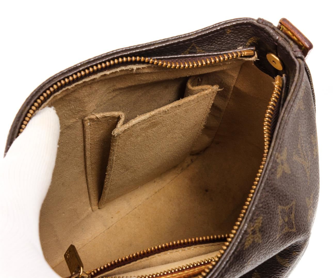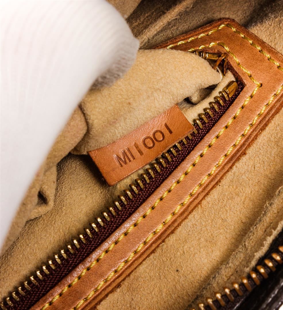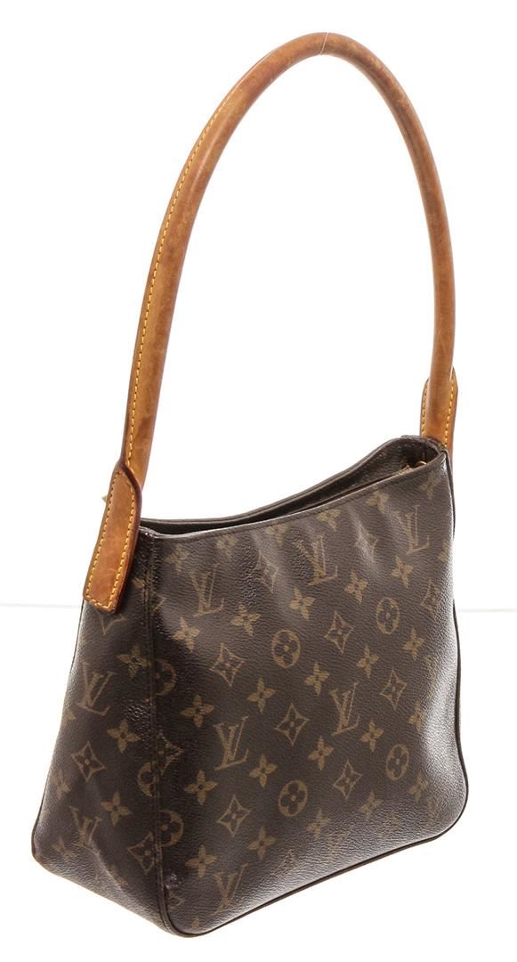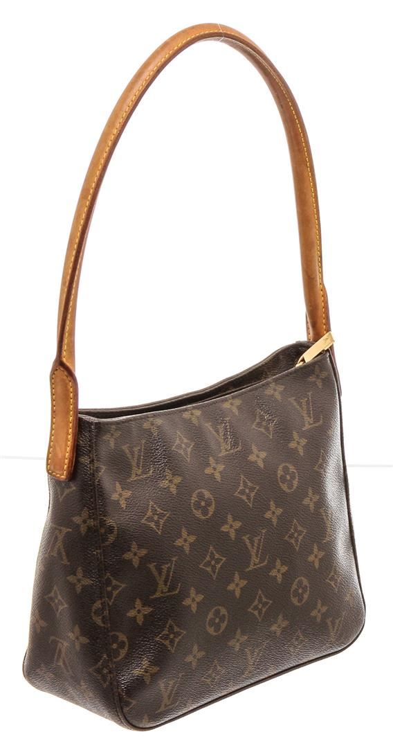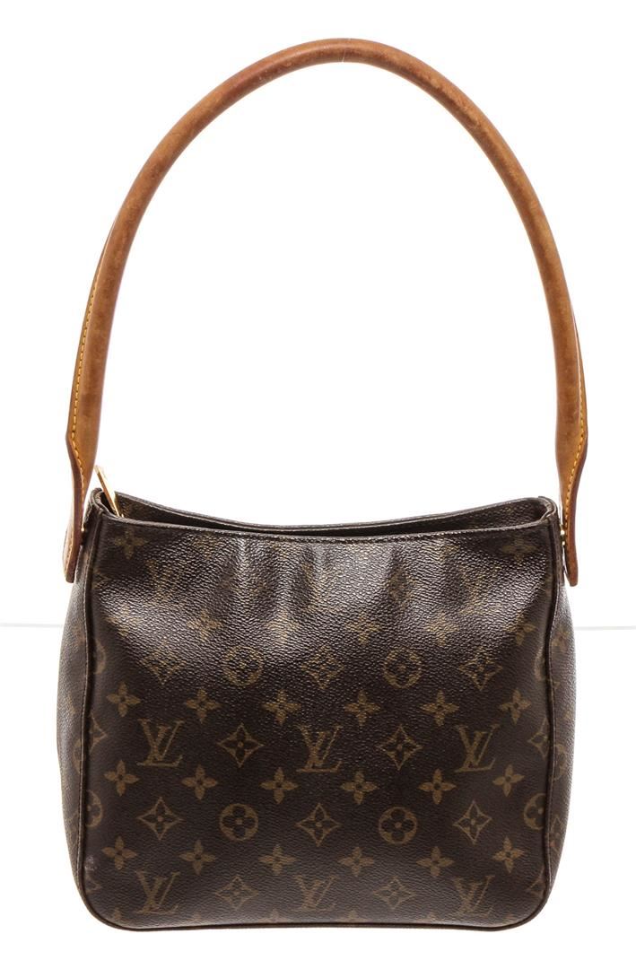 One Louis Vuitton Monogram Canvas Leather Looping MM Shoulder Bag. Brown and tan monogram coated canvas Louis Vuitton Looping MM with brass hardware, tan vachetta leather trim, single rolled shoulder strap, creme Alcantara lining, dual pockets at interior wall; one with zip closure and zip closure at top.