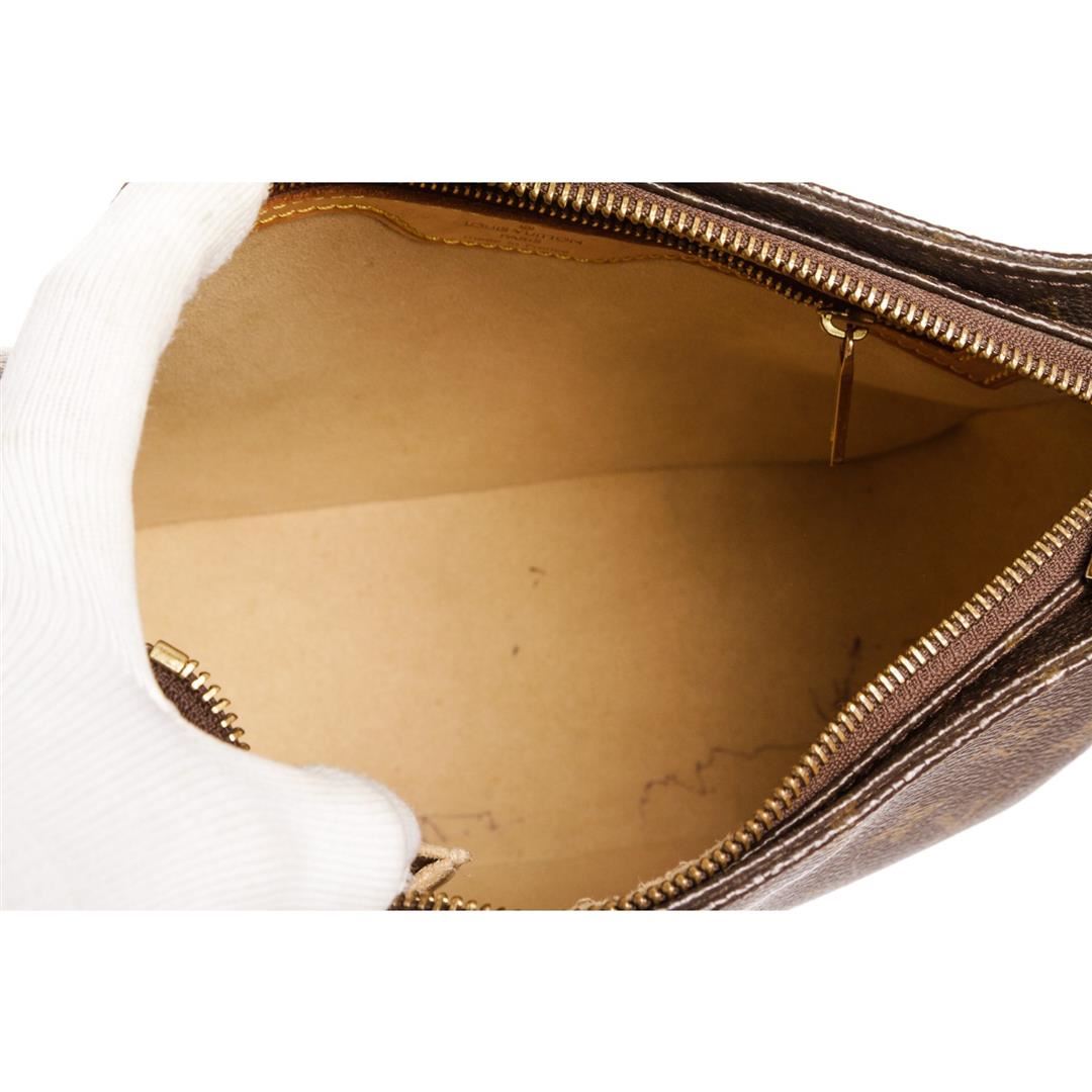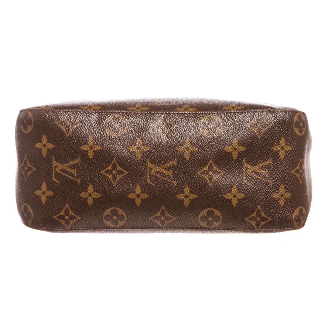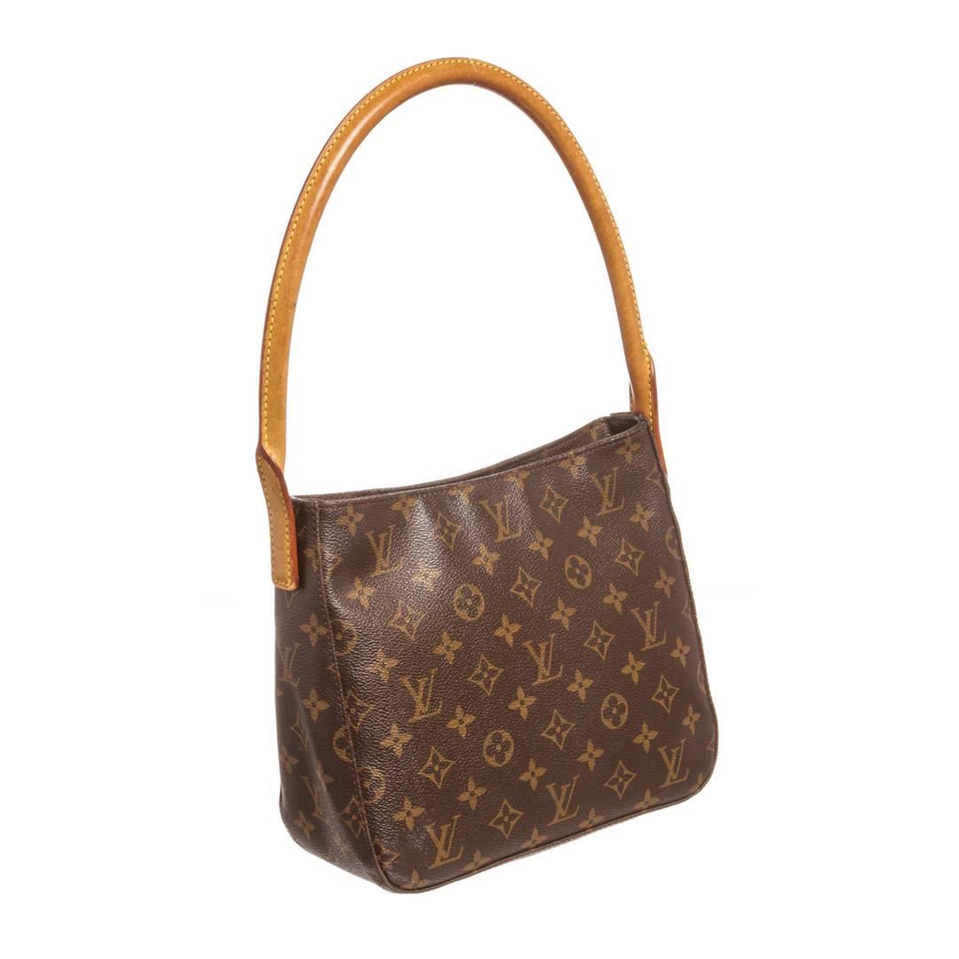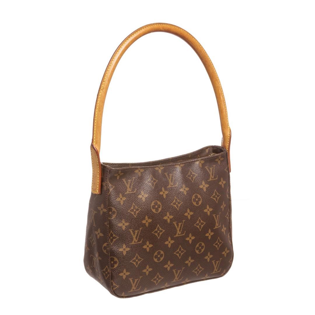Brown and tan monogram coated canvas Louis Vuitton Looping PM with brass hardware, tan vachetta leather trim, single rolled top handle, tonal canvas lining, single interior wall pocket with zip closure and magnetic snap closure at front flap. Item is pre-