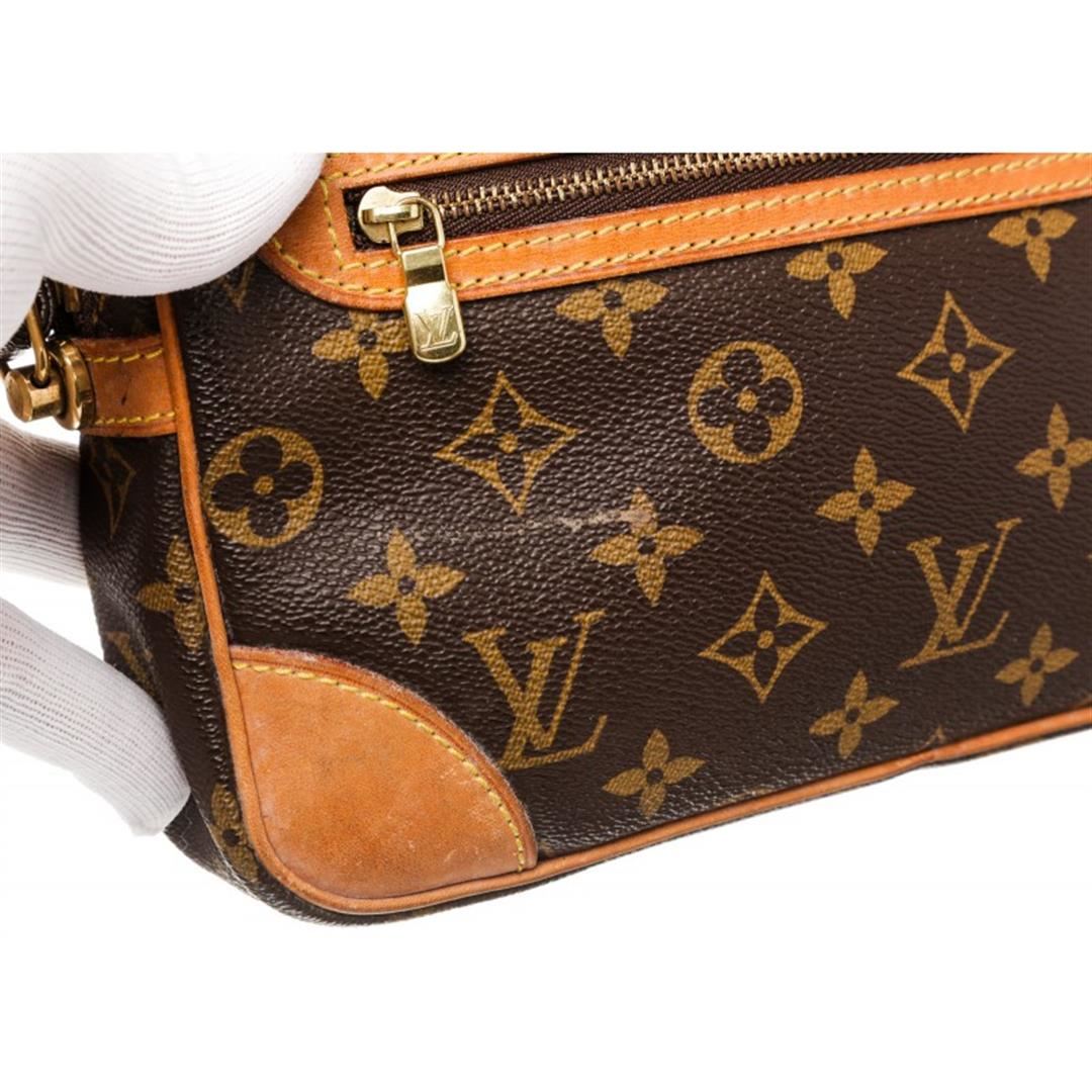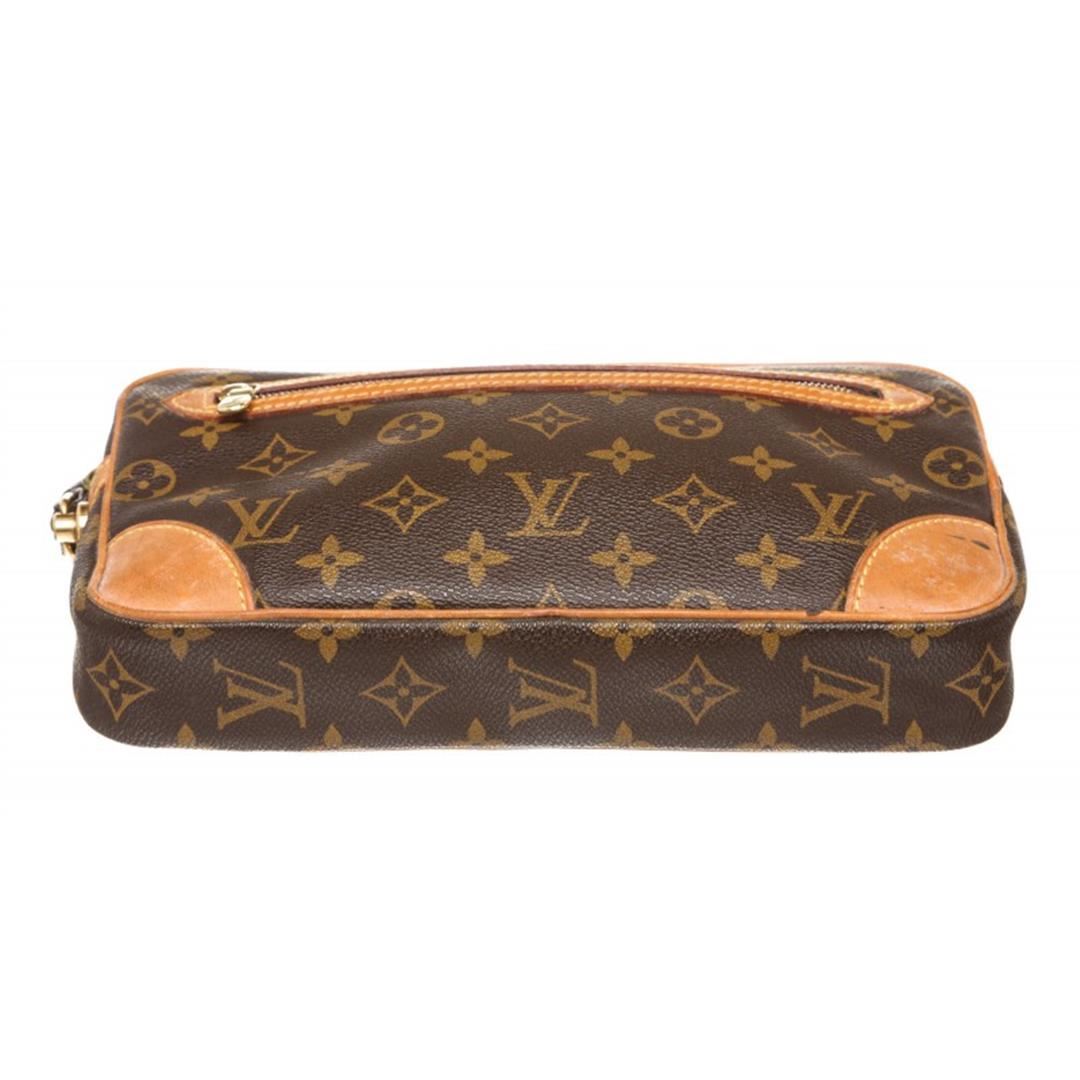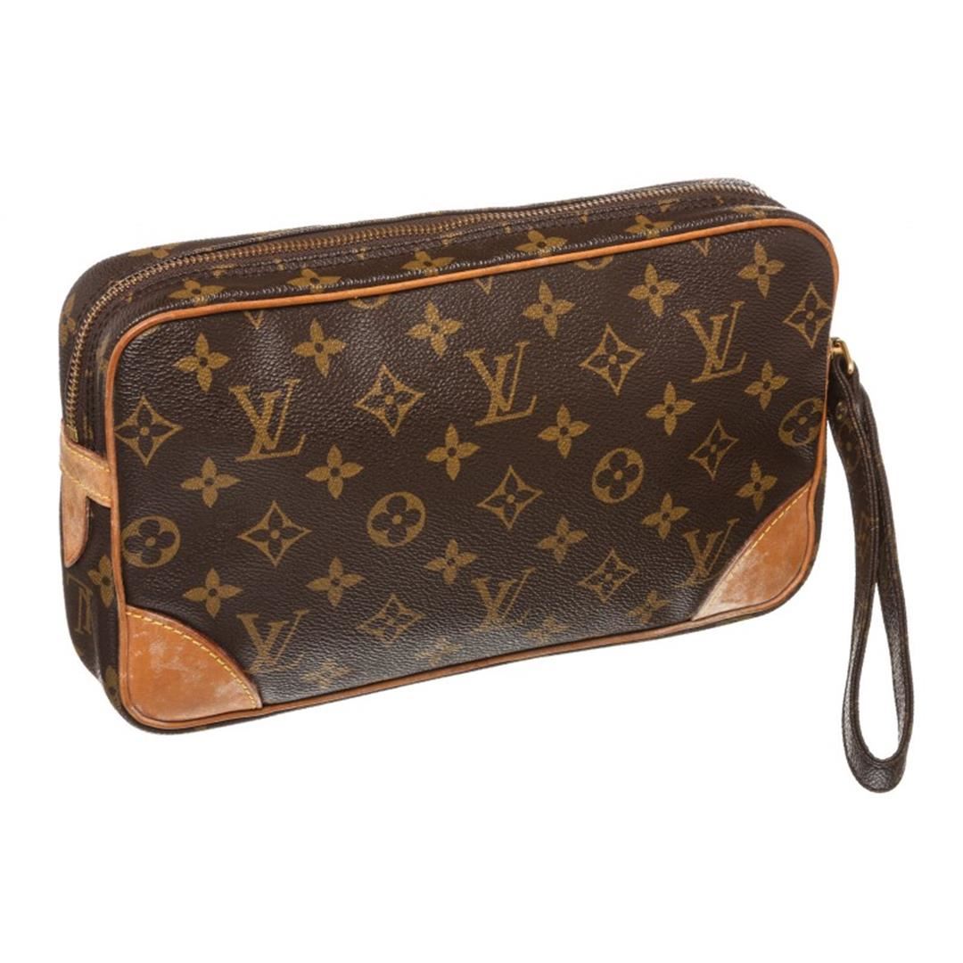 Brown and tan monogram coated canvas Louis Vuitton Marly Dragonne GM with brass hardware, tan vachetta leather trim, single zip pocket at front, single flat wristlet strap, brown Taiga lining, single zip pocket at interior wall and zip closure at top. Item is pre-owned.