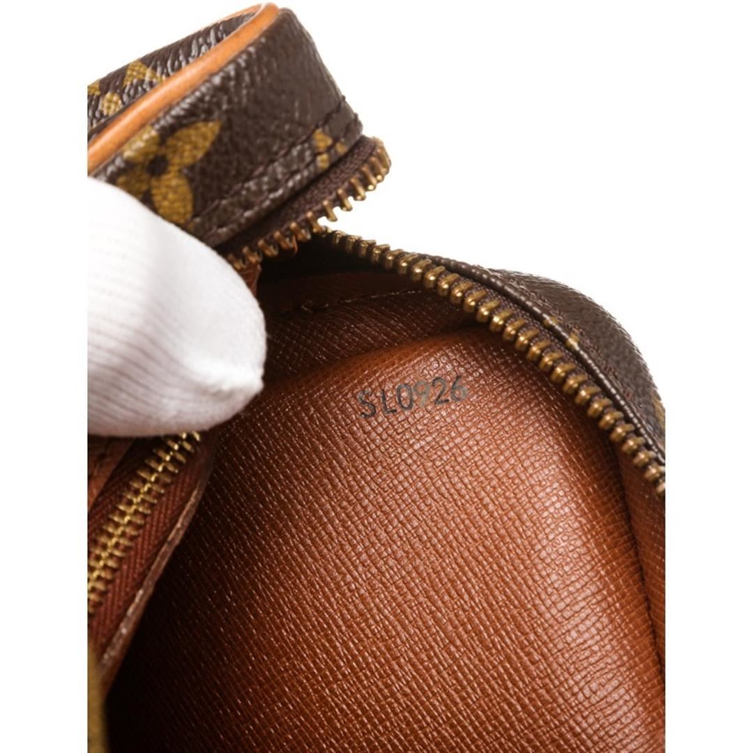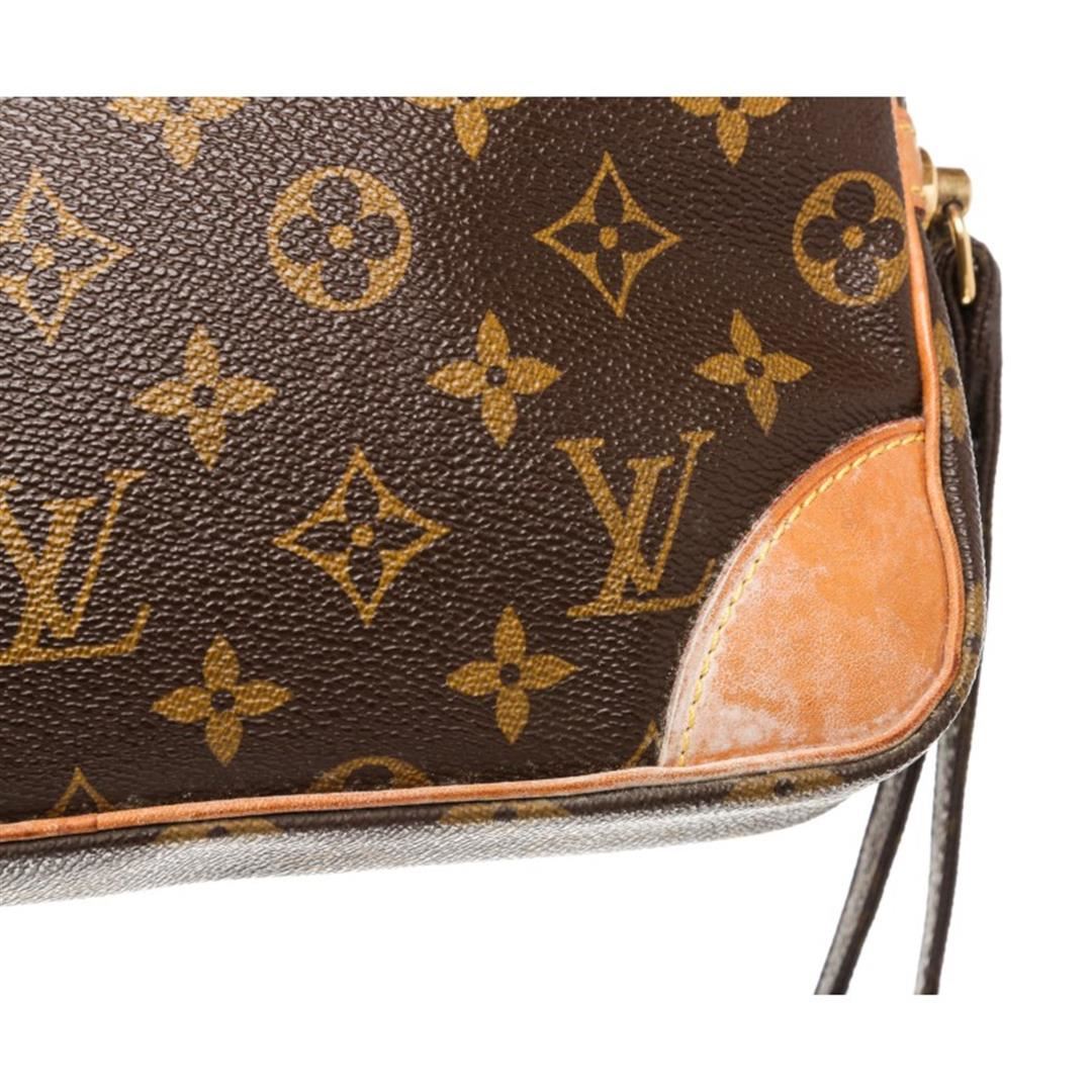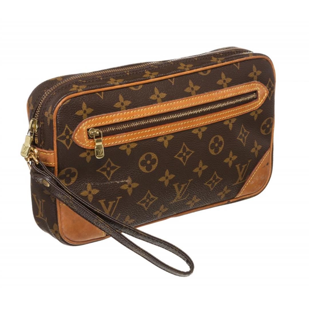 Brown and tan monogram coated canvas Louis Vuitton Marly Dragonne GM with brass hardware, tan vachetta leather trim, single zip pocket at front, single flat wristlet strap, brown Taiga lining, single zip pocket at interior wall and zip closure at top. Item is pre-owned.