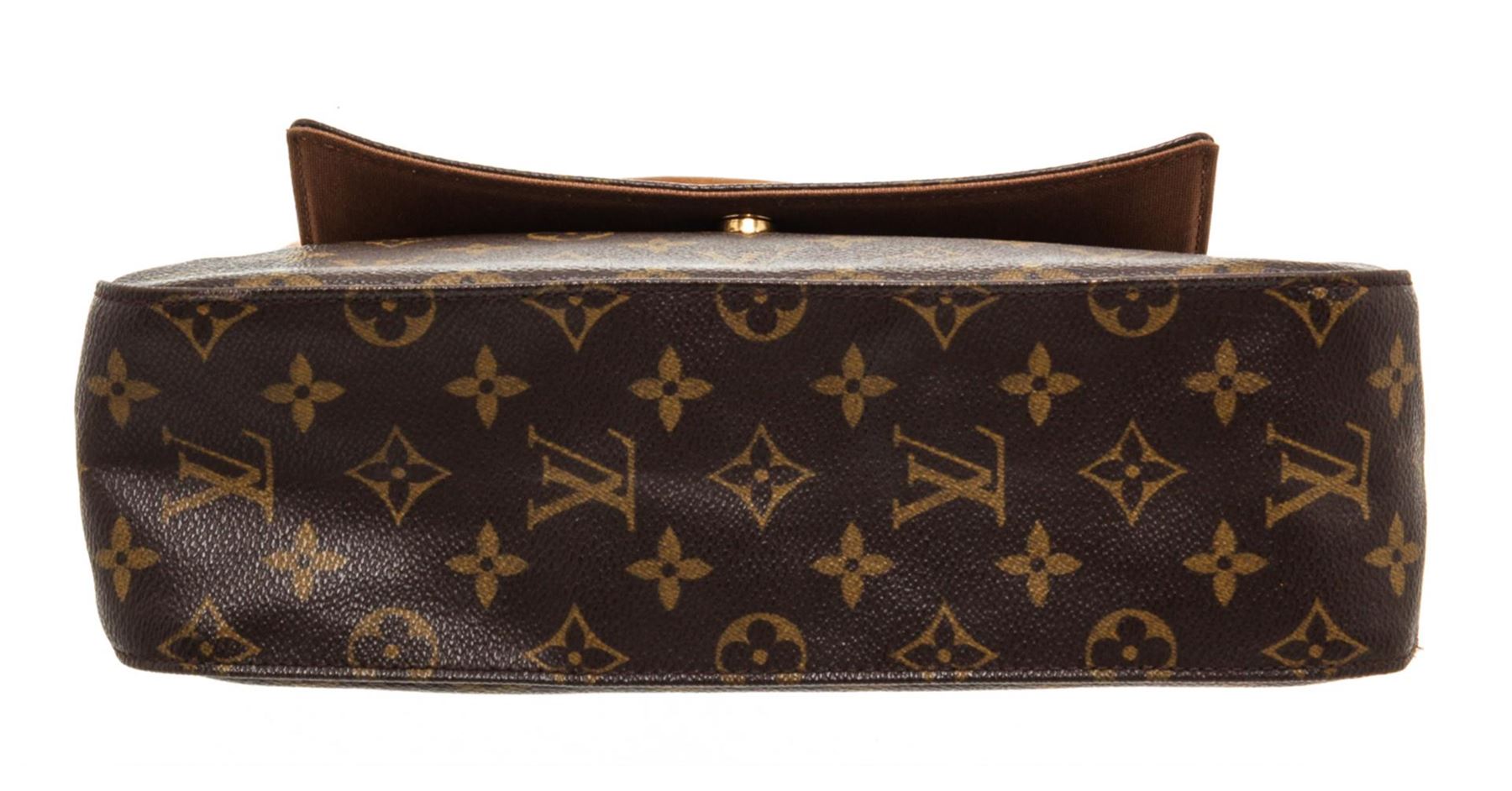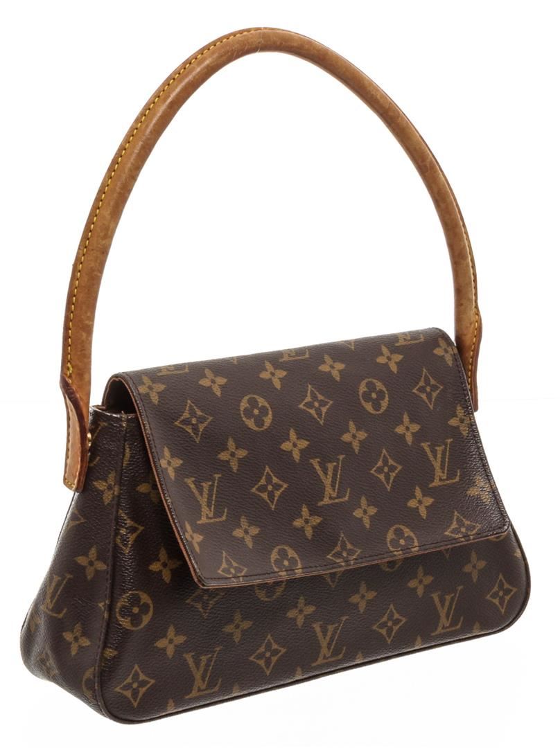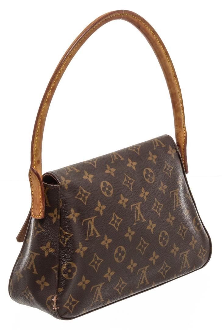 Brown and tan monogram coated canvas Louis Vuitton Mini Looping Bag with brass hardware, tan vachetta leather trim, single rolled handle, brown woven lining, single zip pocket at interior wall and snap closure at front flap. Authentic.