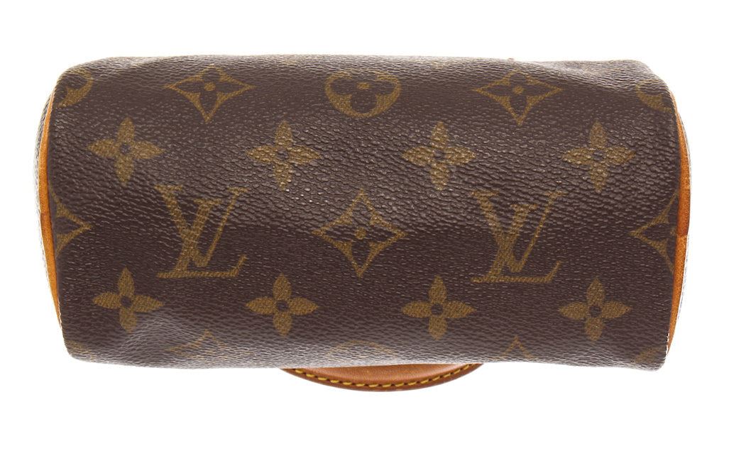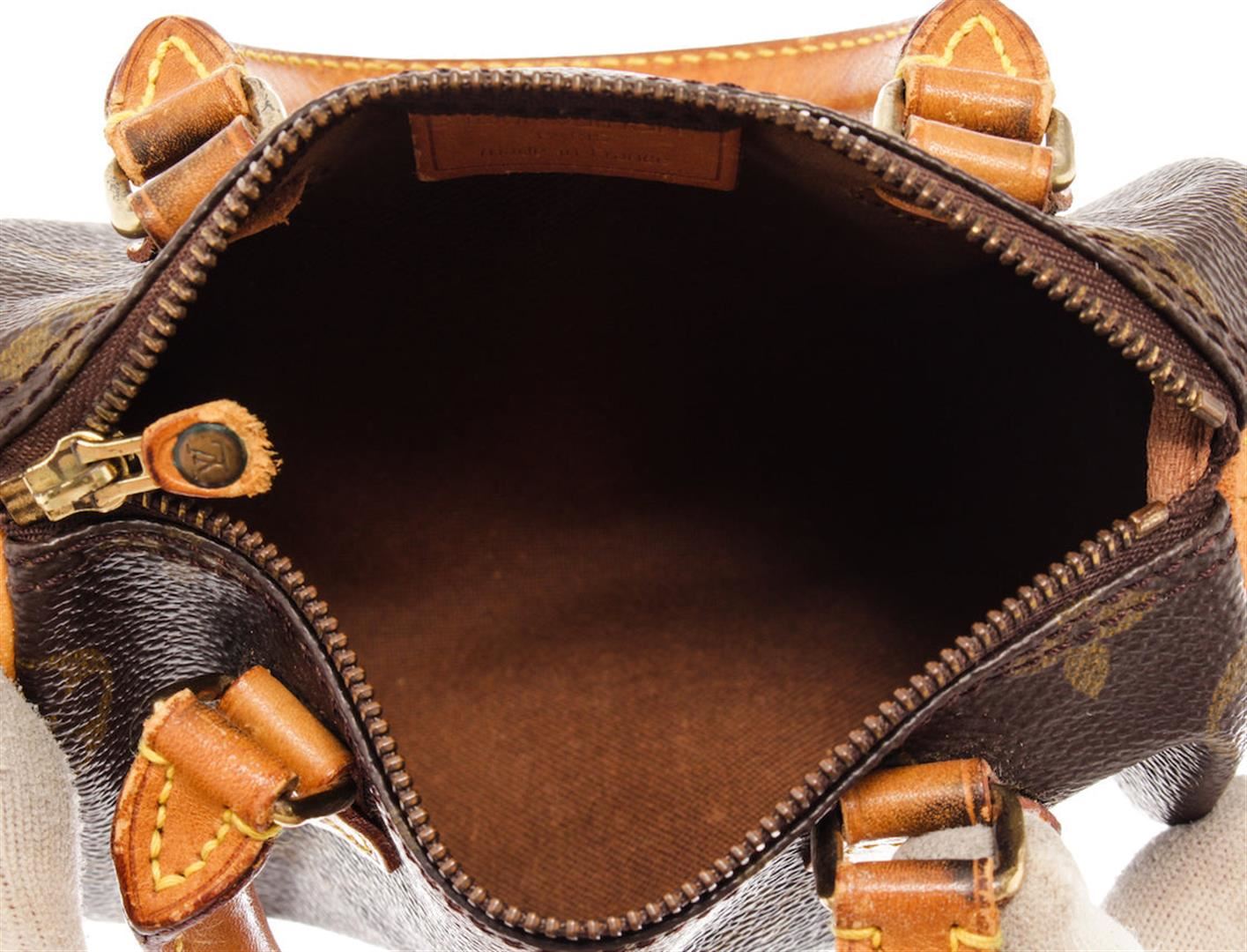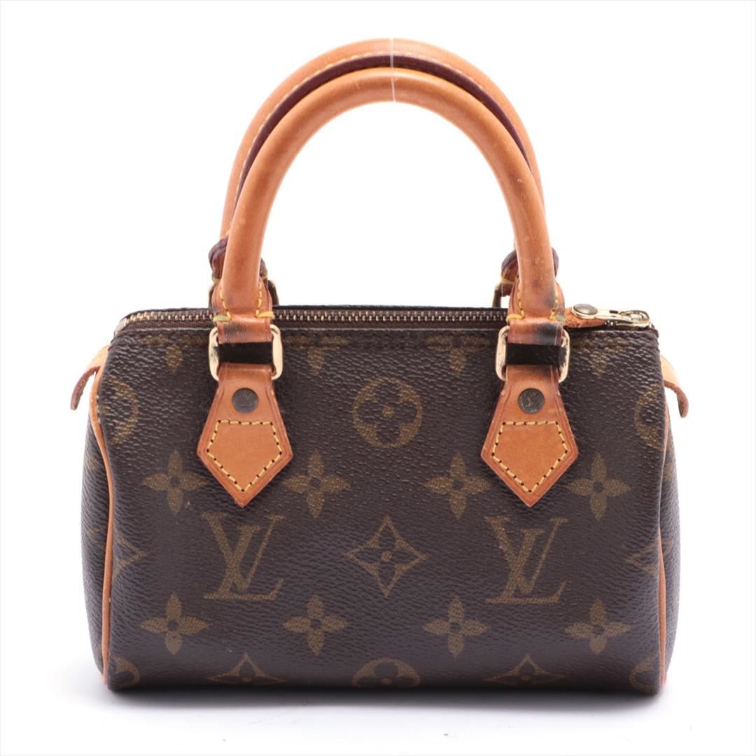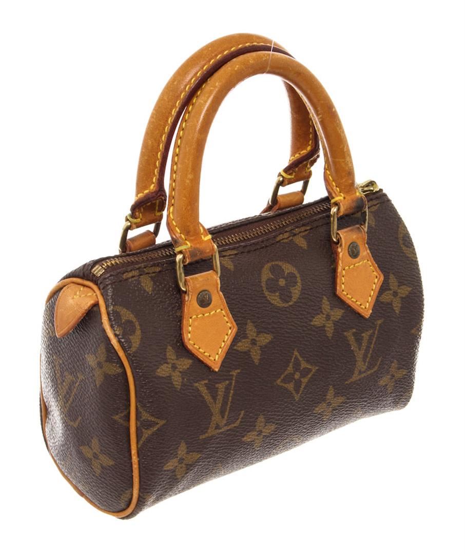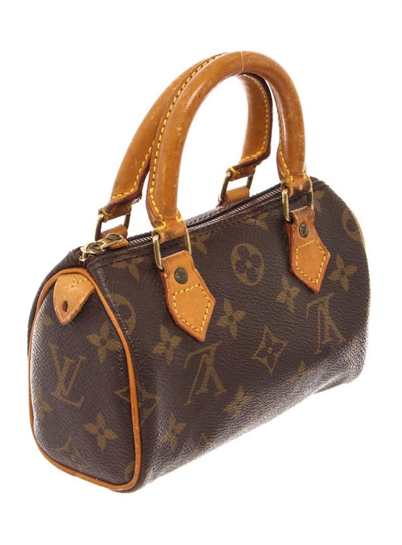 Brown and tan monogram coated canvas Louis Vuitton Mini Speedy with brass hardware, tan vachetta leather trim, dual rolled top handles, brown canvas lining and zip closure at top. 6"x3"x4"xHandle Drop:3"/15.2cmx7.6cmx10.1cmxBag Drop:7.6cm