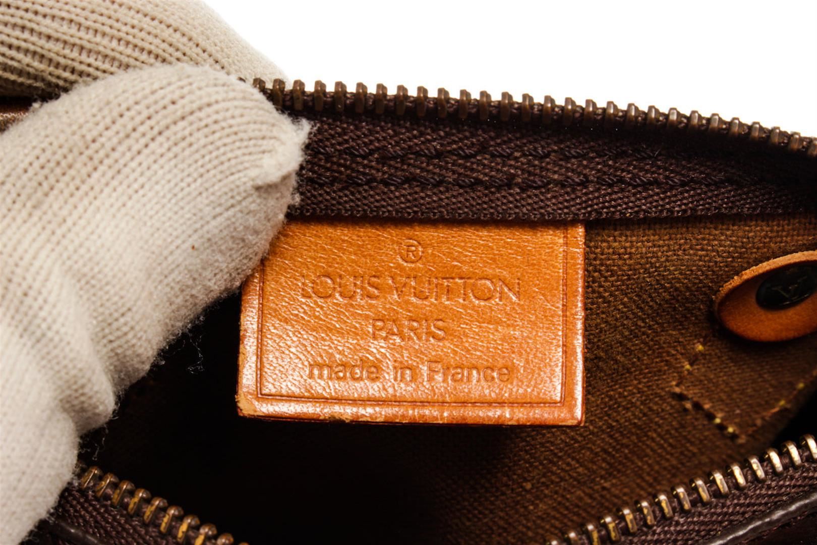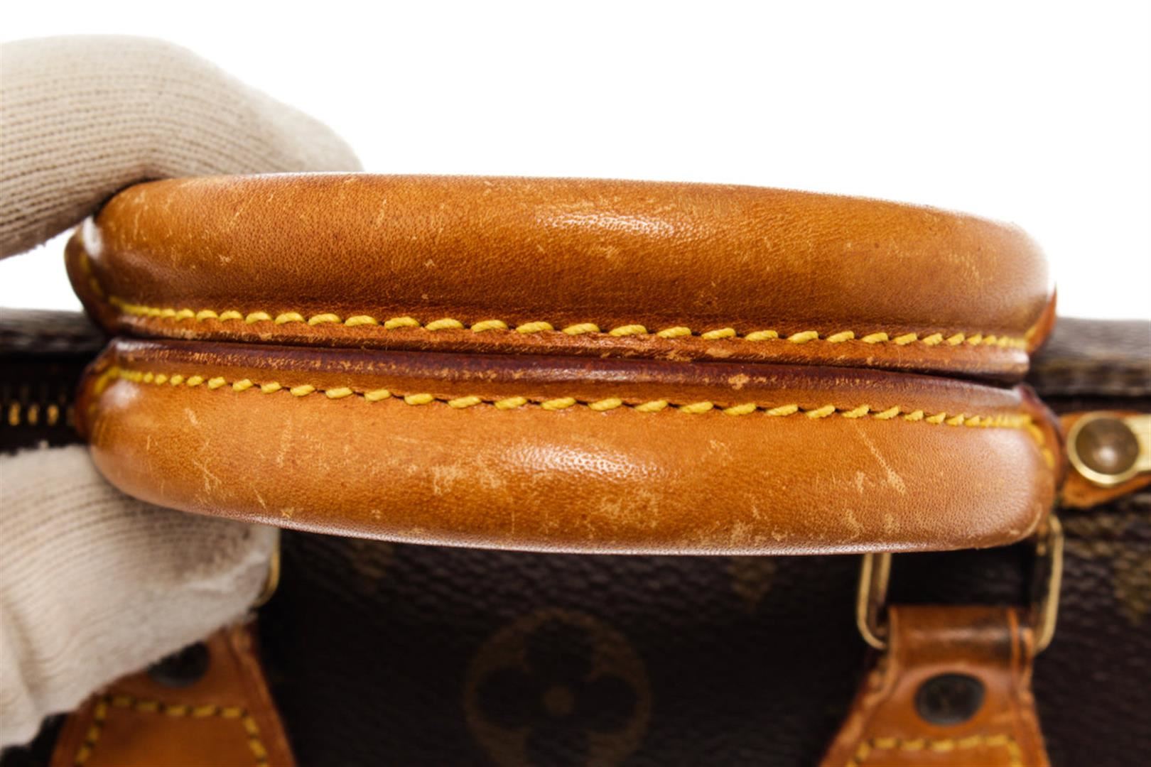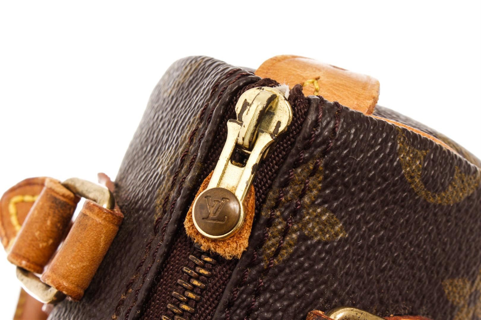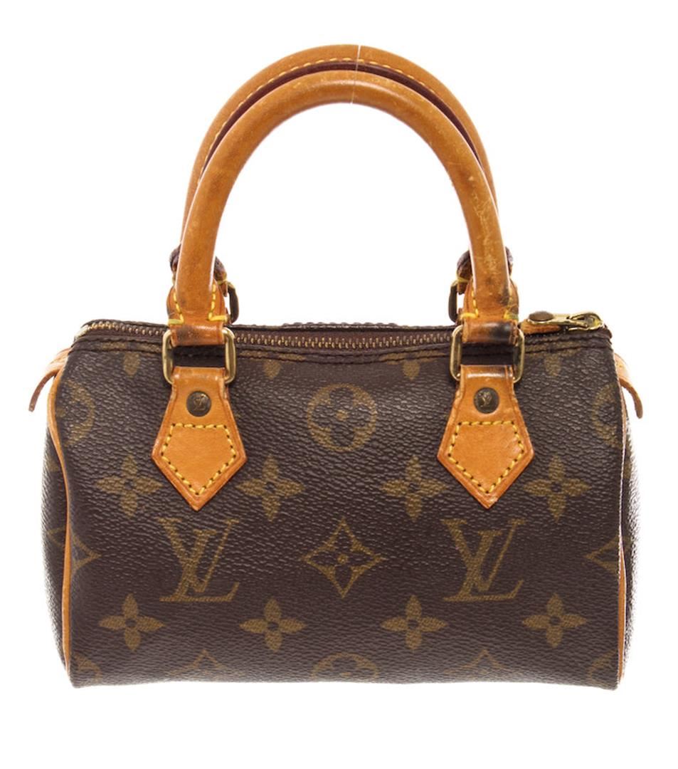 Brown and tan monogram coated canvas Louis Vuitton Mini Speedy with brass hardware, tan vachetta leather trim, dual rolled top handles, brown canvas lining and zip closure at top. 6"x3"x4"xHandle Drop:3"/15.2cmx7.6cmx10.1cmxBag Drop:7.6cm