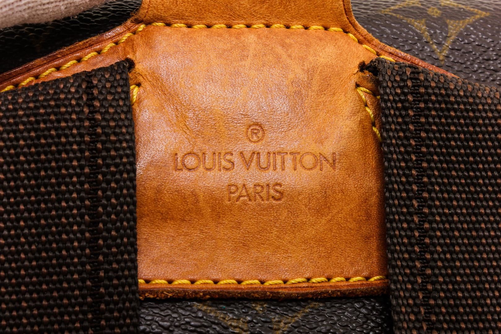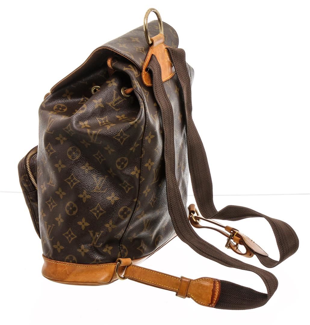 One Louis Vuitton Monogram Canvas Leather Montsouris GM Backpack Bag. Brown and tan monogram coated canvas Louis Vuitton Montsouris GM with brass hardware, tan vachetta leather accents, dual adjustable shoulder straps, zip pocket at front, brown canvas lining, single slit pocket at interior wall, drawstring closure at top and additional buckle closure at front.