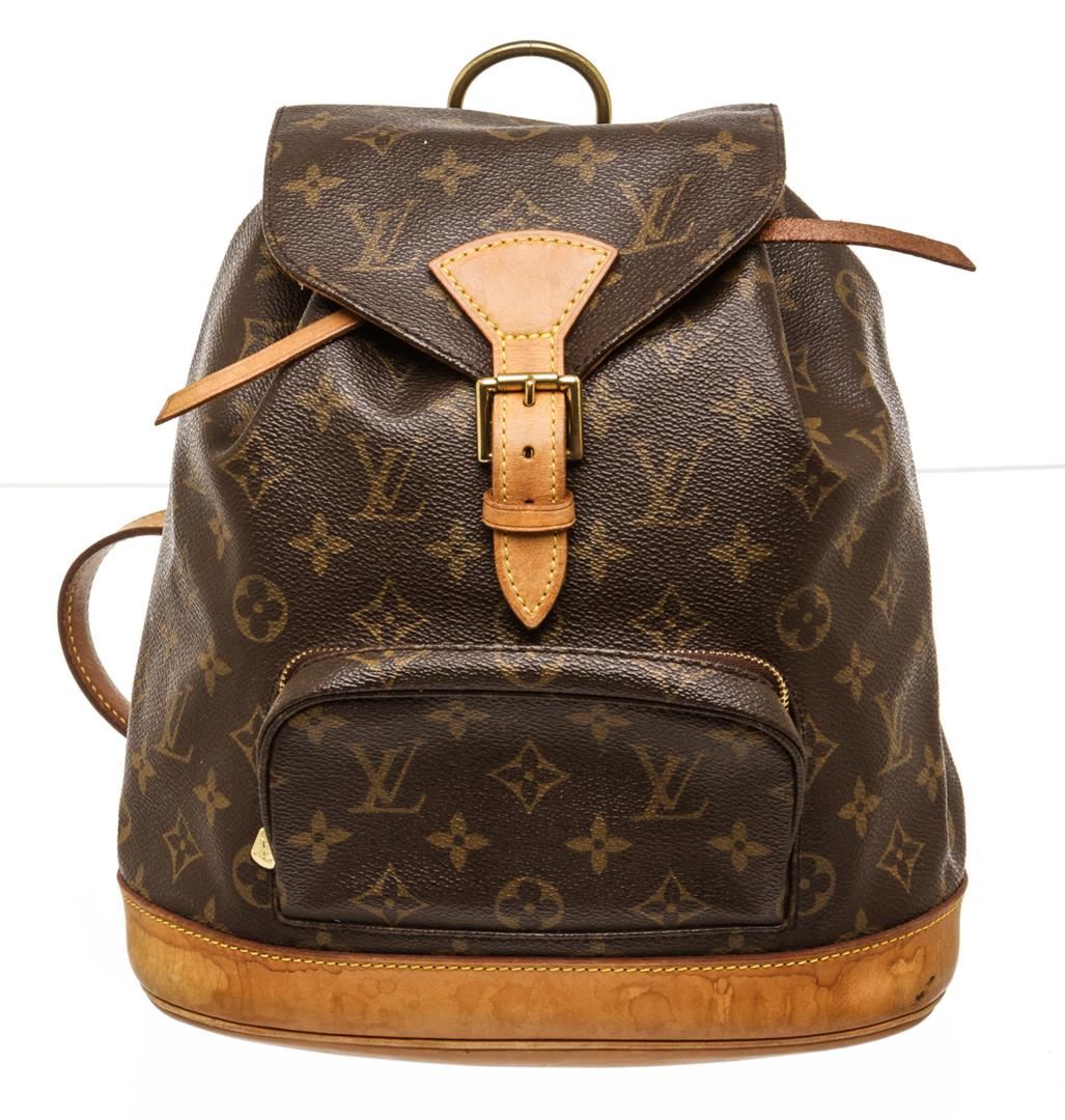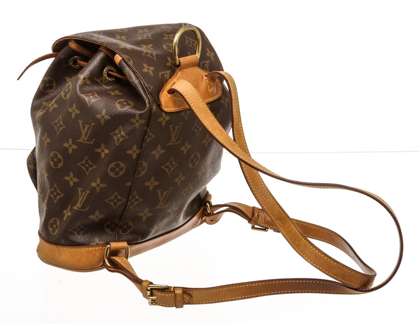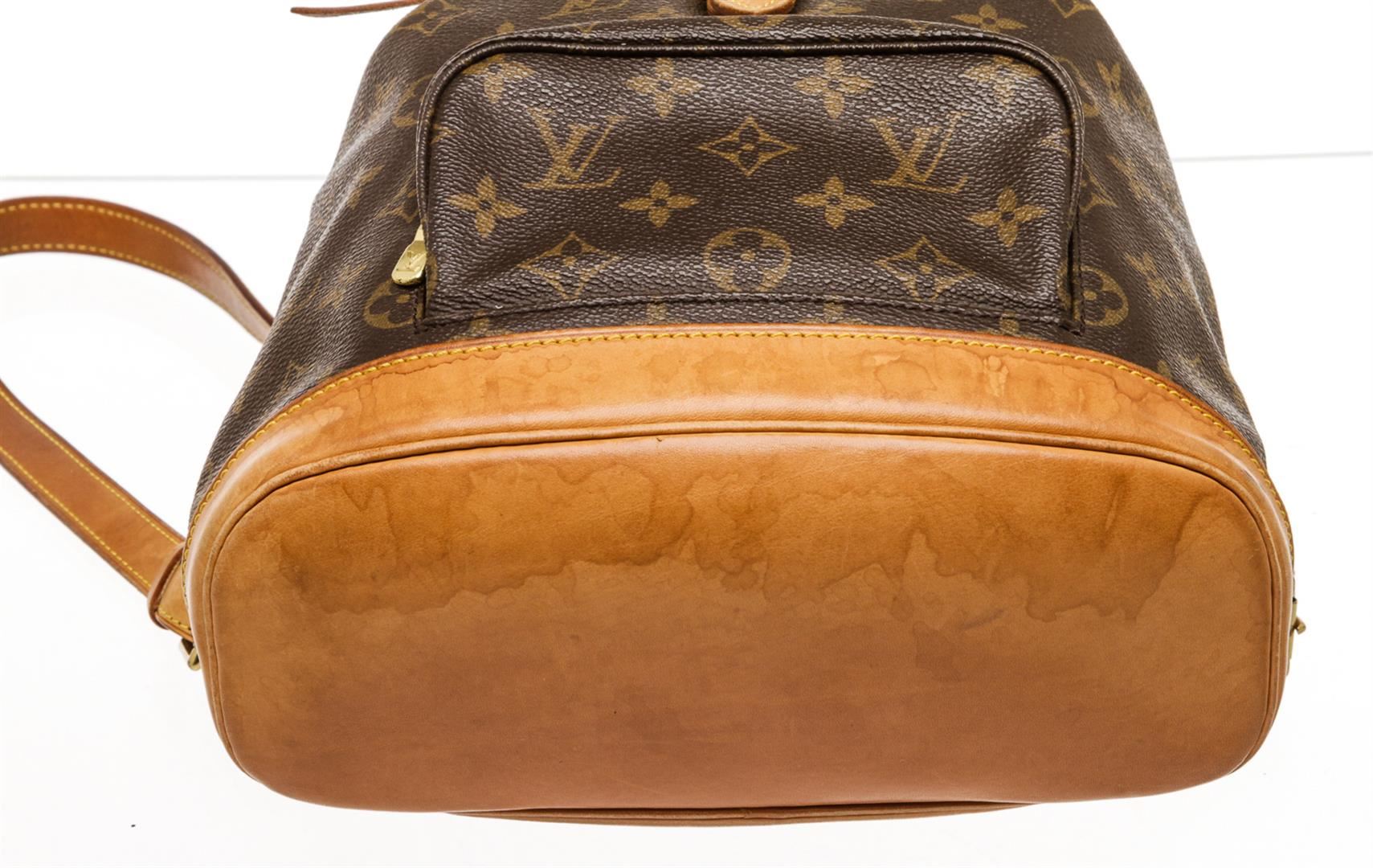 Brown and tan monogram coated canvas Louis Vuitton Montsouris MM with brass hardware, tan vachetta leather trim, dual adjustable shoulder straps, single pocket at exterior with zip closure, brown canvas lining, single slit pocket at interior wall, drawstring closure at top and flap with buckle closure at front.