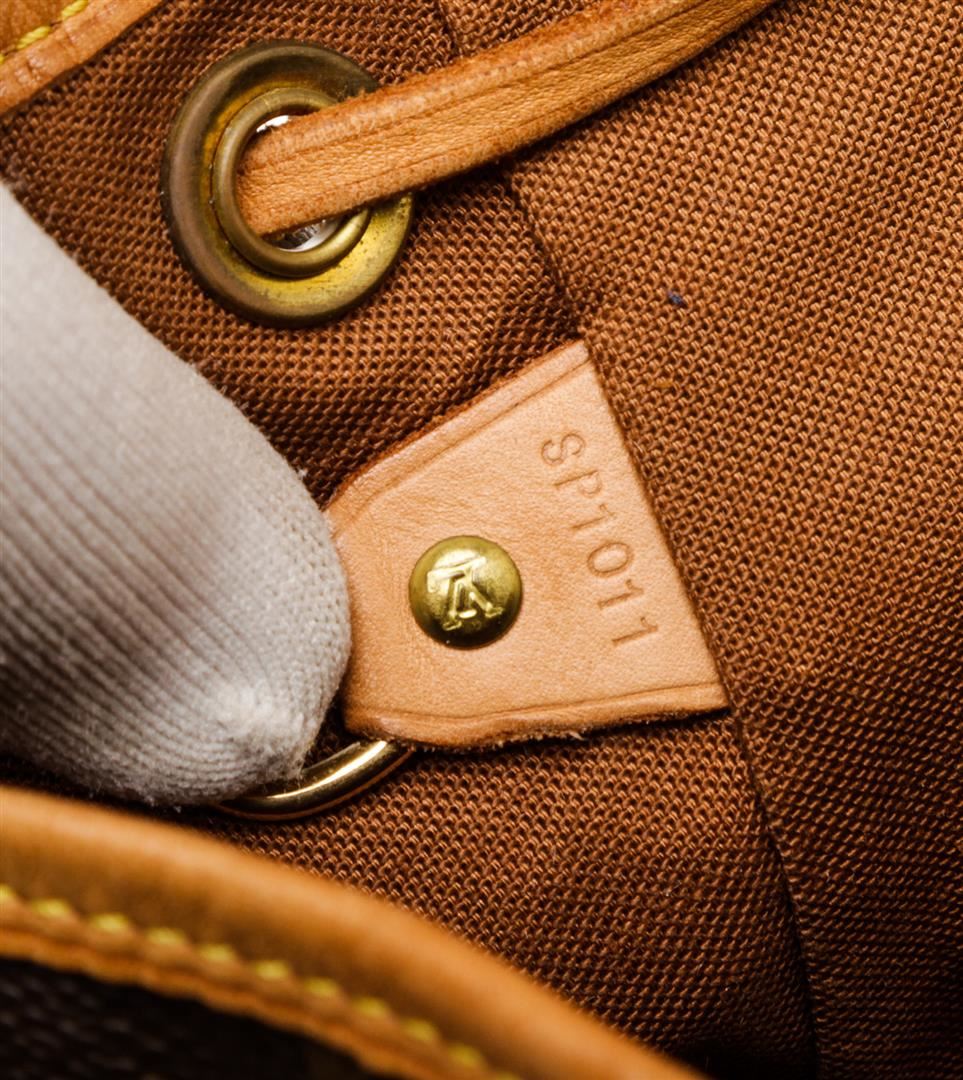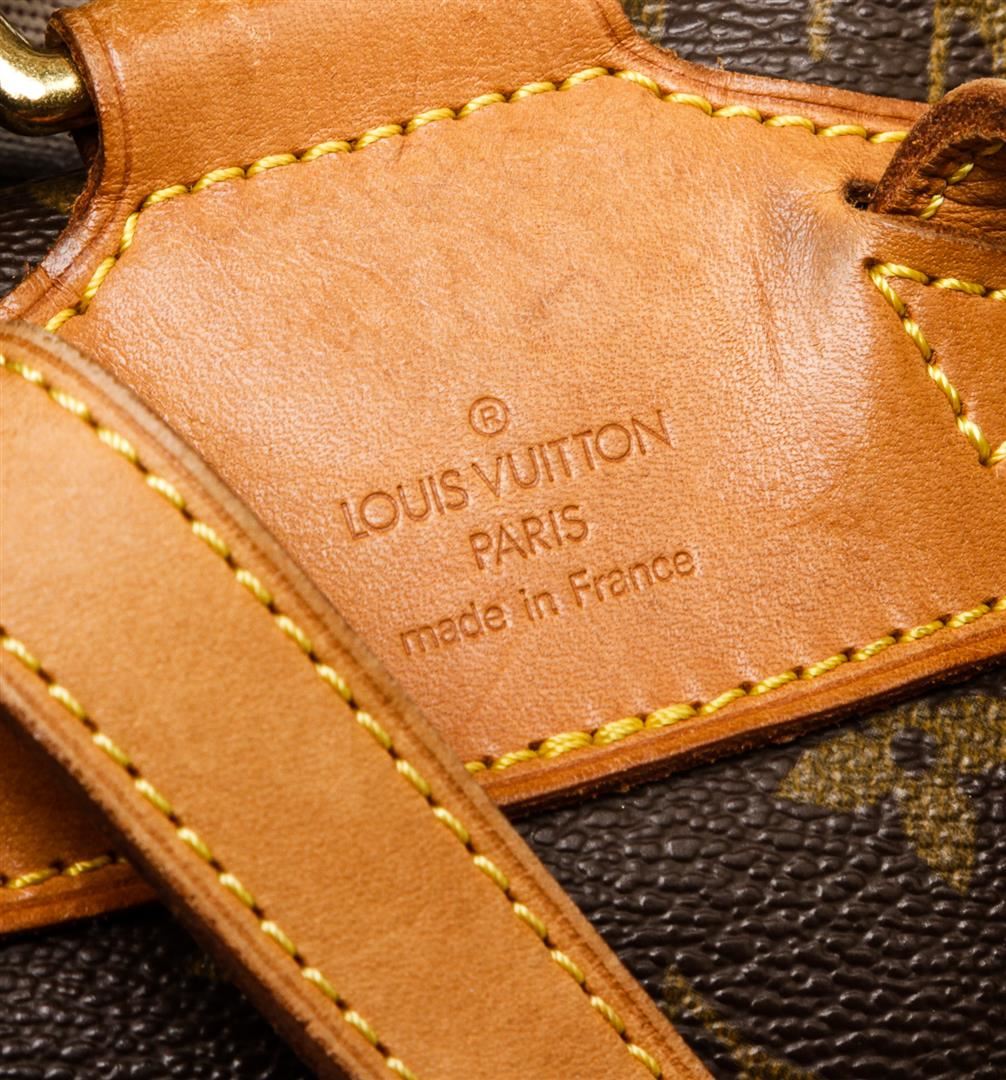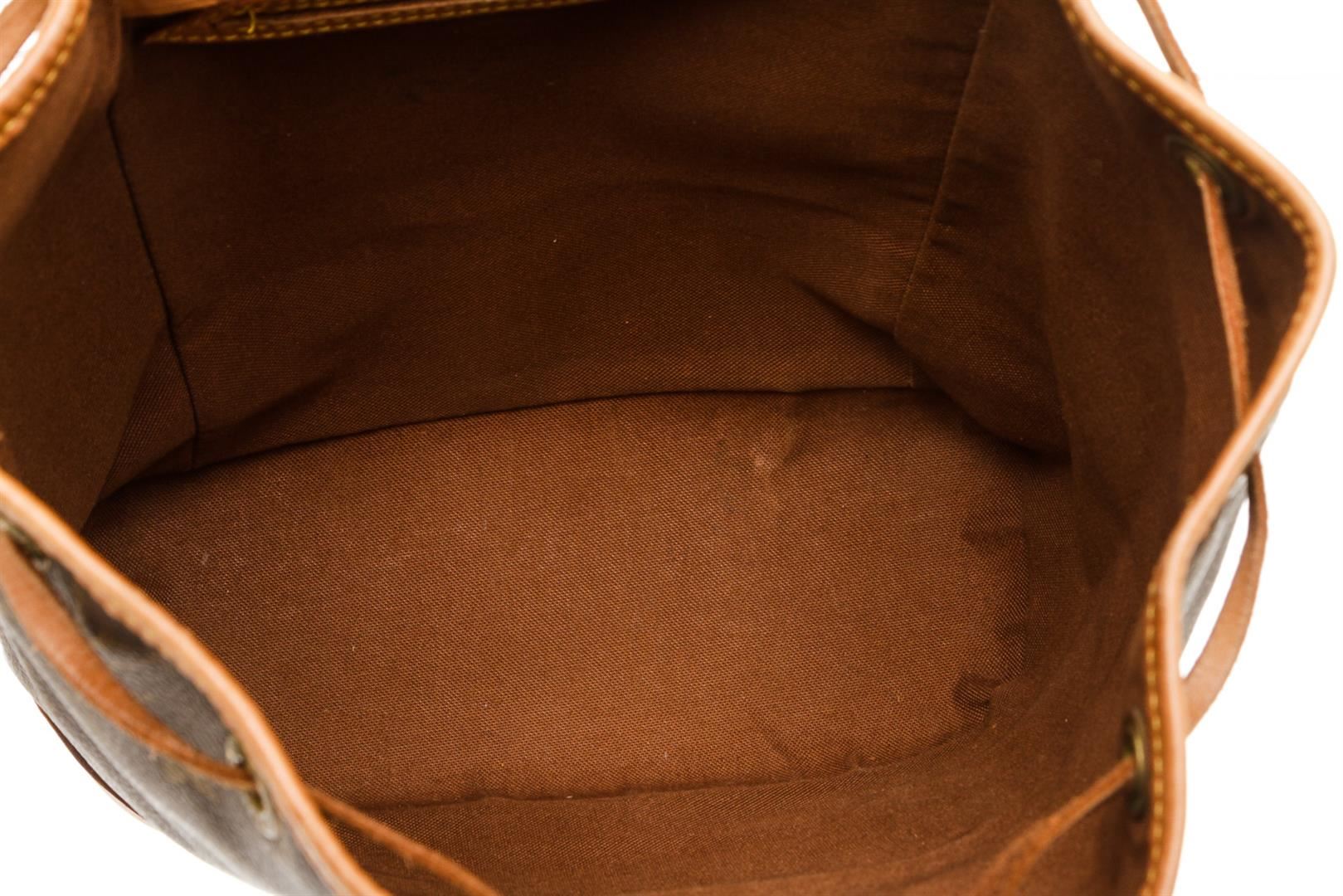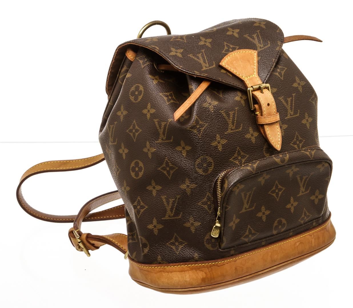 Brown and tan monogram coated canvas Louis Vuitton Montsouris MM with brass hardware, tan vachetta leather trim, dual adjustable shoulder straps, single pocket at exterior with zip closure, brown canvas lining, single slit pocket at interior wall, drawstring closure at top and flap with buckle closure at front.