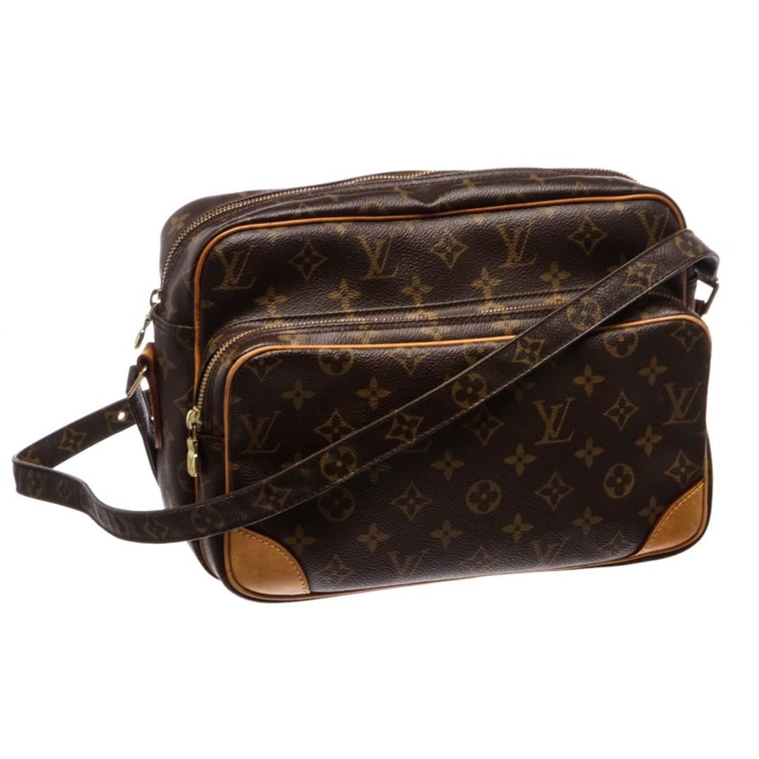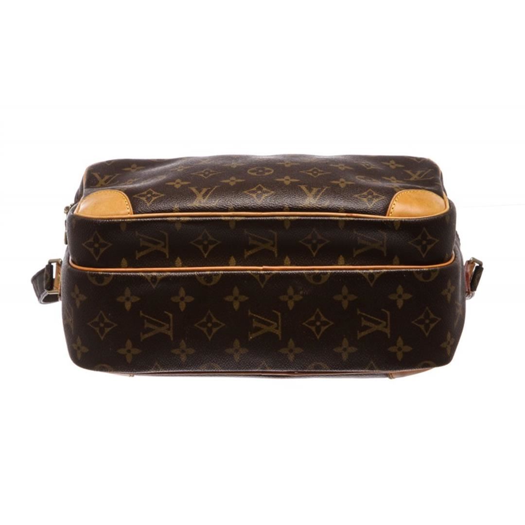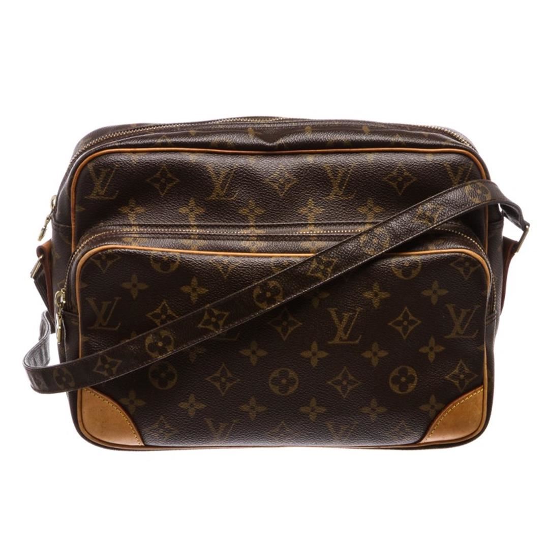 Brown and tan monogram coated canvas Louis Vuitton Nile bag with brass hardware, tan vachetta leather trim, single flat shoulder strap featuring shoulder pad, exterior zip pocket at front, brown Taiga leather lining, single zip pocket at interior wall and zip closure at top. Item is Pre-Owned.