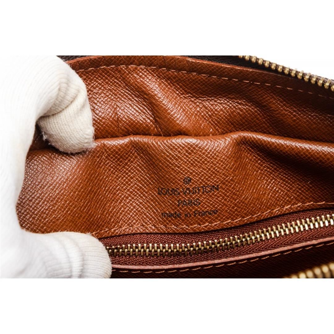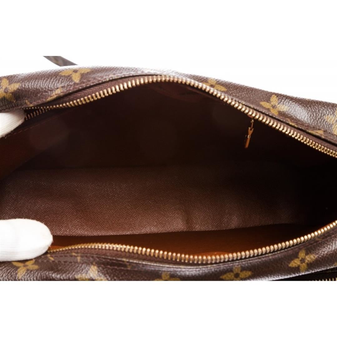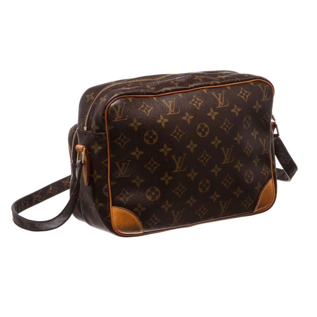 Brown and tan monogram coated canvas Louis Vuitton Nile bag with brass hardware, tan vachetta leather trim, single flat shoulder strap featuring shoulder pad, exterior zip pocket at front, brown Taiga leather lining, single zip pocket at interior wall and zip closure at top. Item is Pre-Owned.