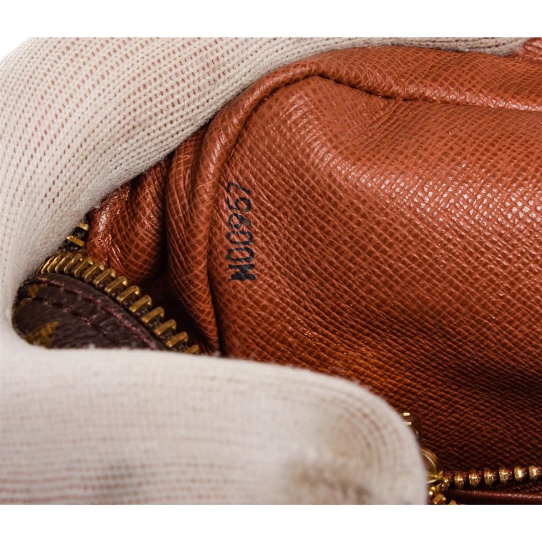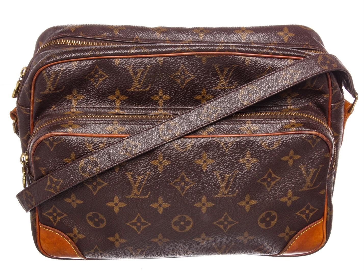 Brown and tan monogram coated canvas Louis Vuitton Nile bag with brass hardware, tan vachetta leather trim, single flat shoulder strap featuring shoulder pad, exterior zip pocket at front, brown Taiga leather lining, single zip pocket at interior wall and zip closure at top.