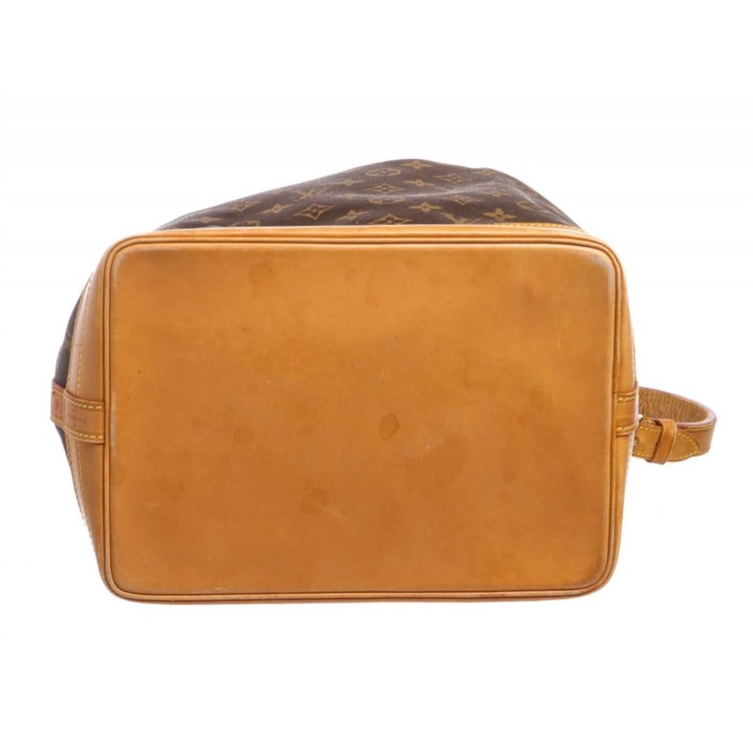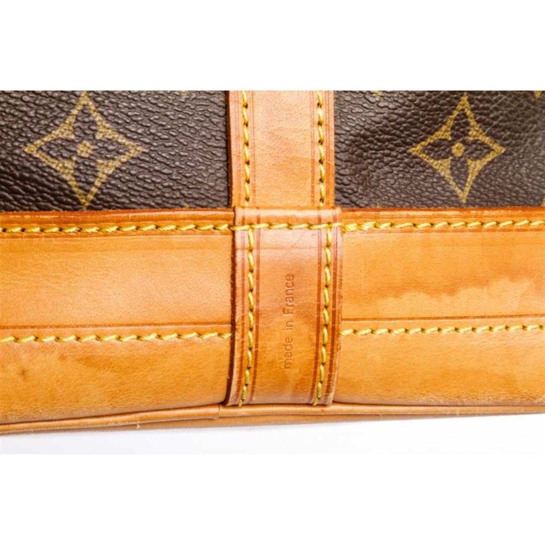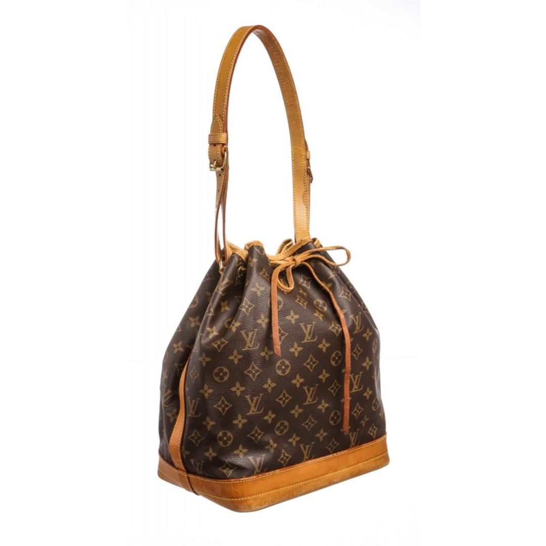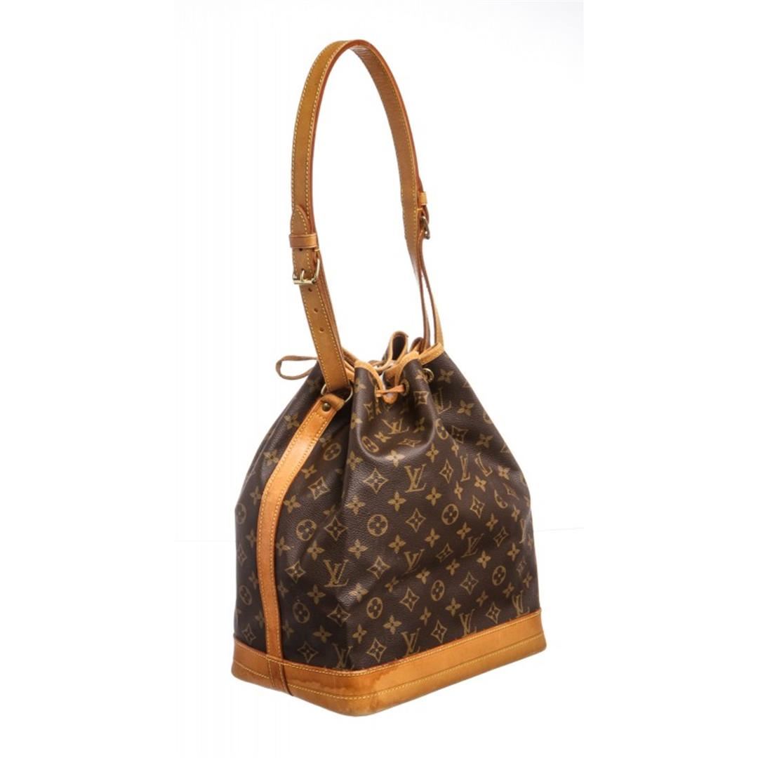 Brown and tan monogram coated canvas Louis Vuitton Noe GM with brass hardware, tan vachetta leather trim, single adjustable flat shoulder strap, brown canvas lining and drawstring closure at top. Item is Pre-Owned.