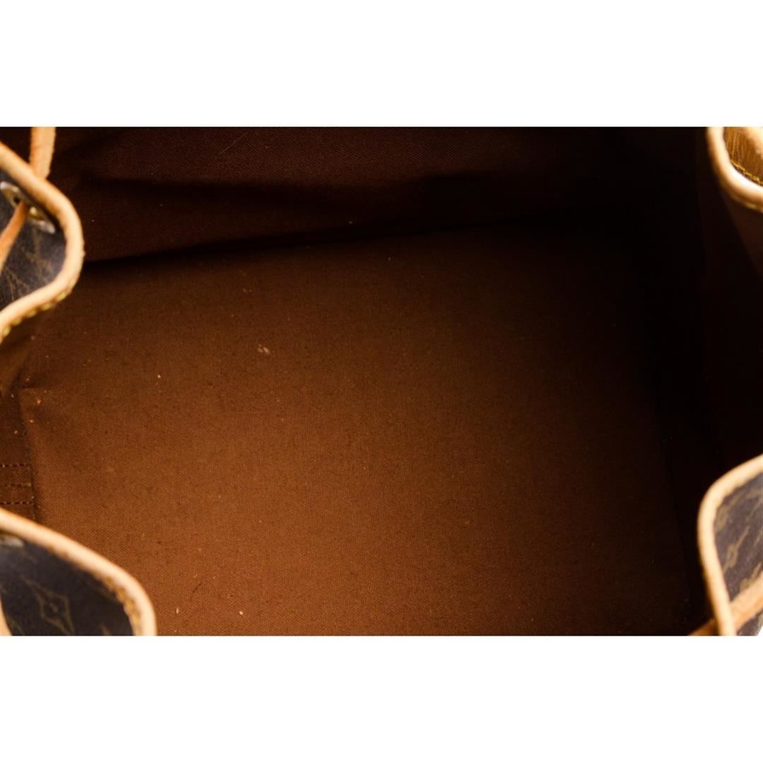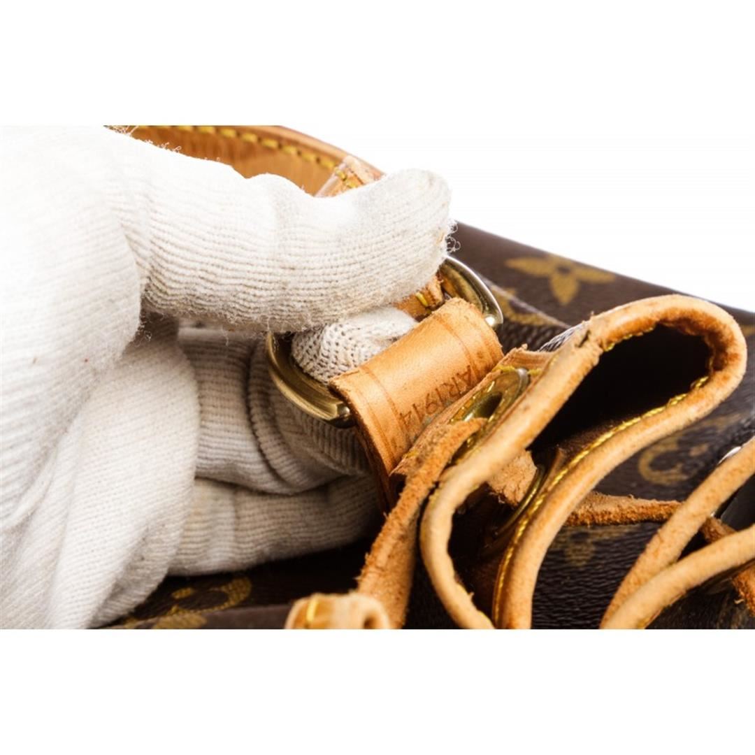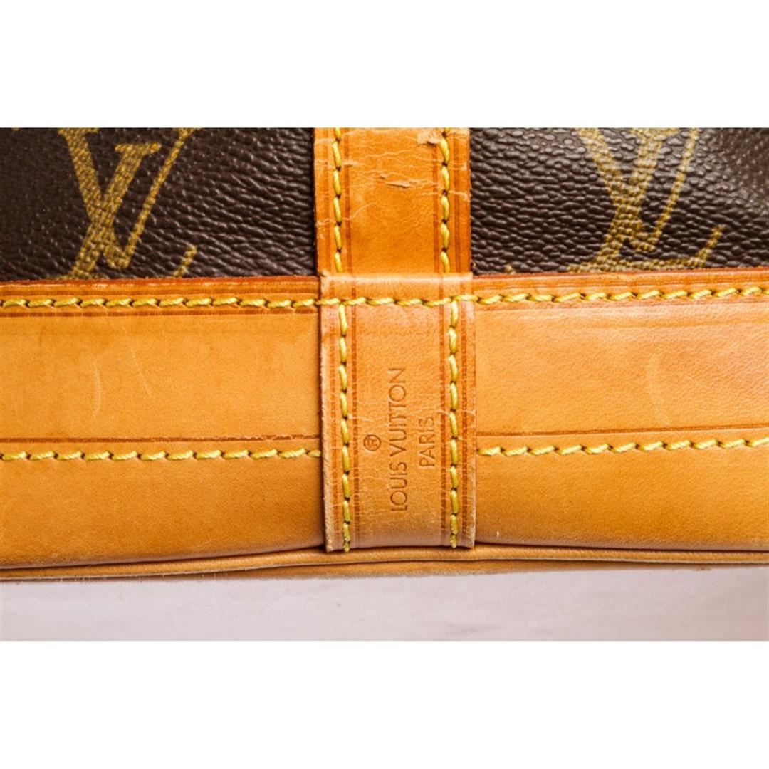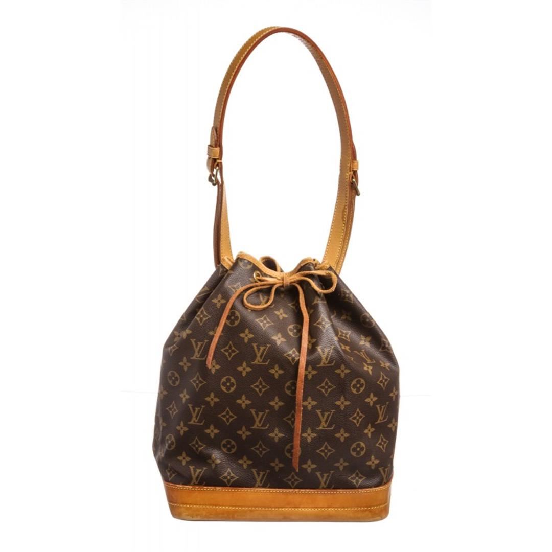 Brown and tan monogram coated canvas Louis Vuitton Noe GM with brass hardware, tan vachetta leather trim, single adjustable flat shoulder strap, brown canvas lining and drawstring closure at top. Item is Pre-Owned.
