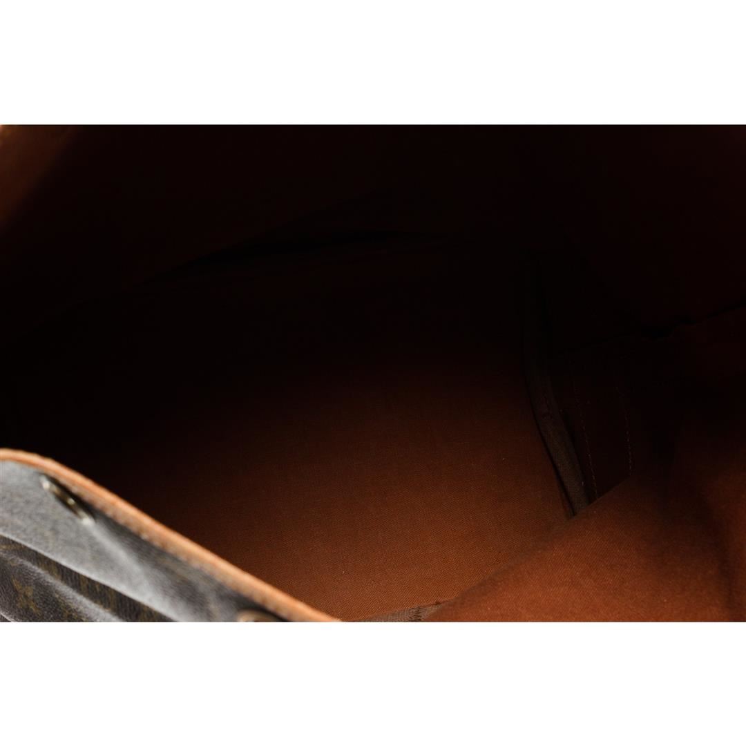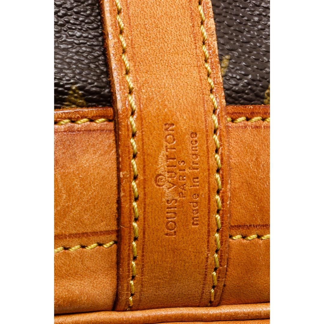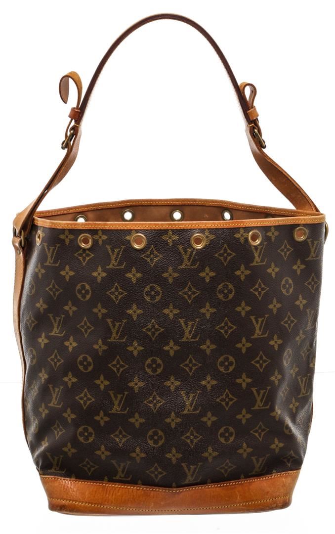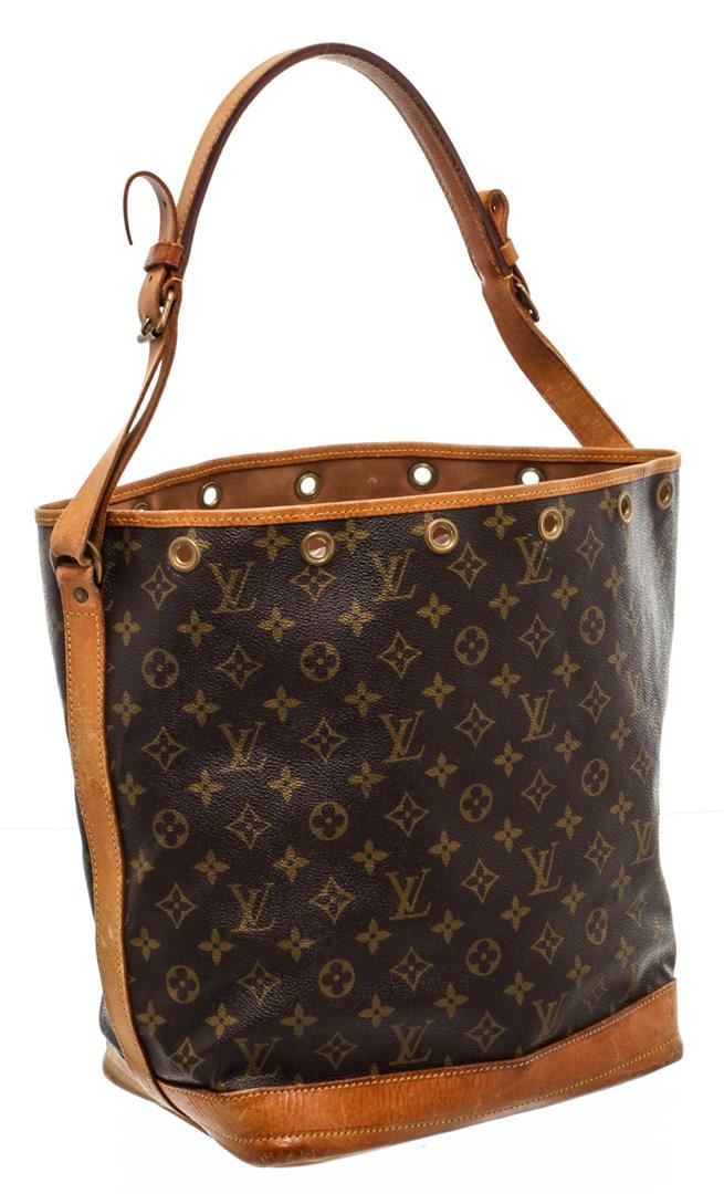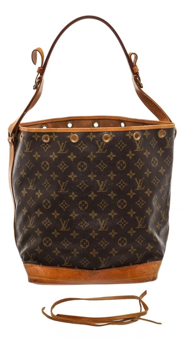 Brown and tan monogram coated canvas Louis Vuitton Noe GM with brass hardware, tan vachetta leather trim, single adjustable flat shoulder strap, brown canvas lining and drawstring closure at top.