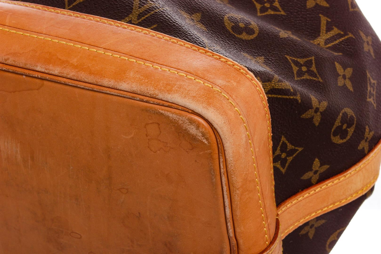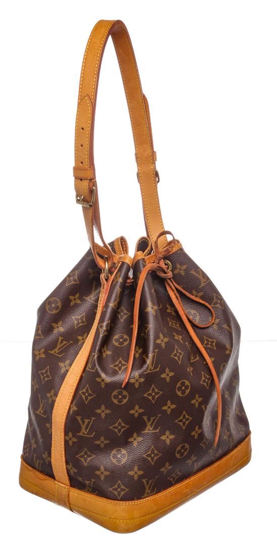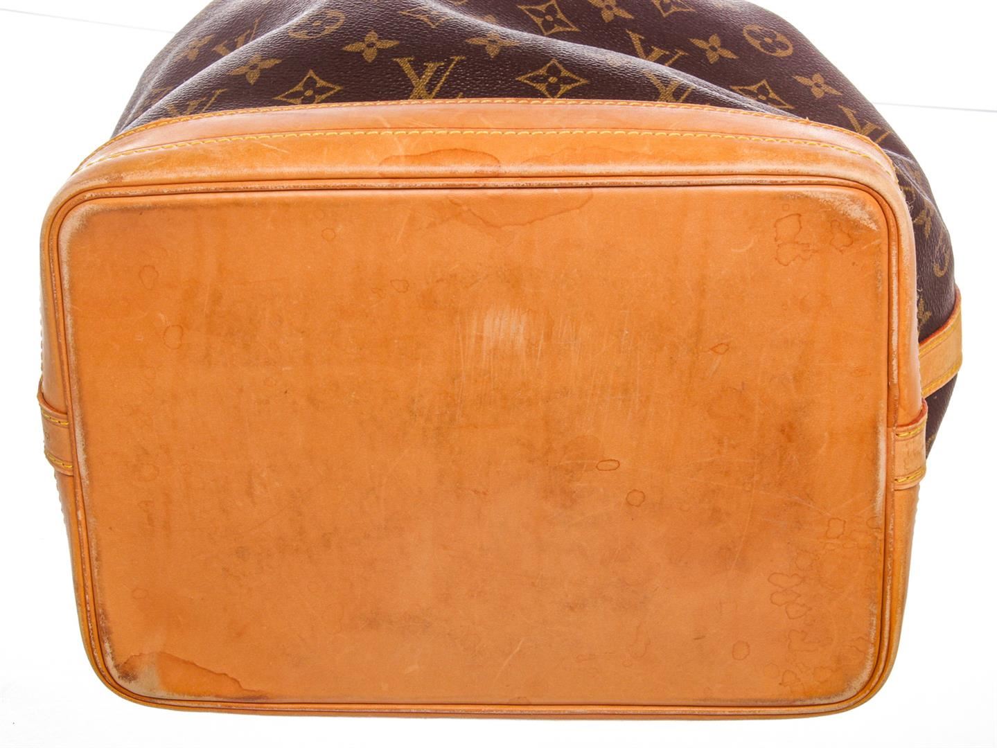 Brown and tan monogram coated canvas Louis Vuitton Noe GM with brass hardware, tan vachetta leather trim, single adjustable flat shoulder strap, brown canvas lining and drawstring closure at top.
