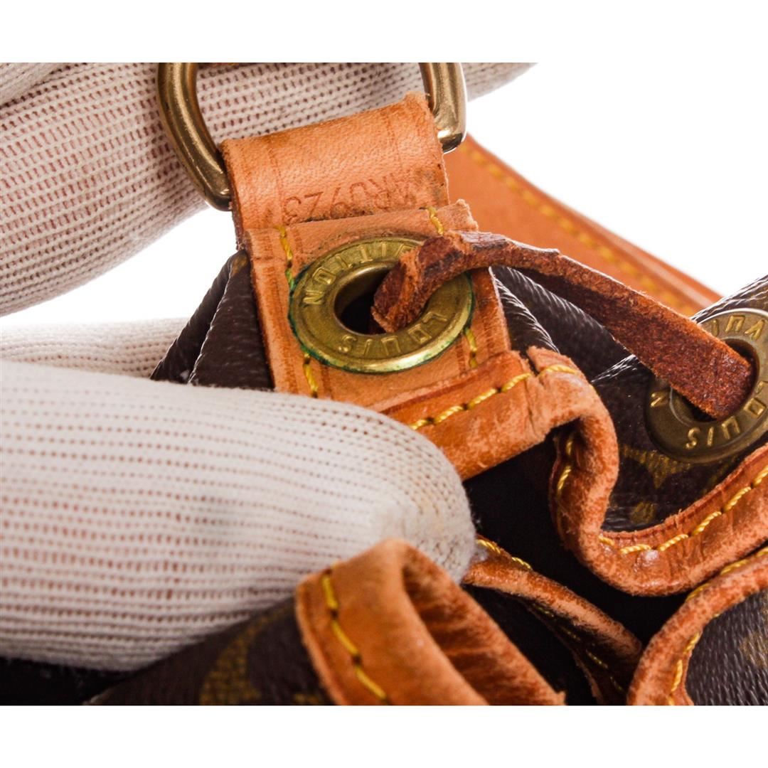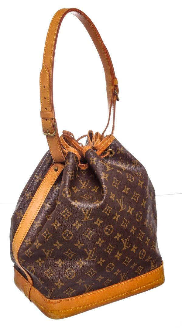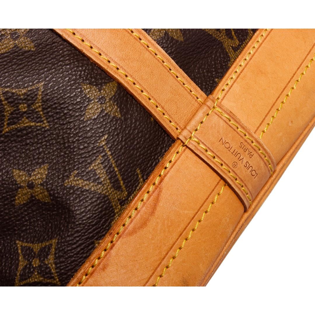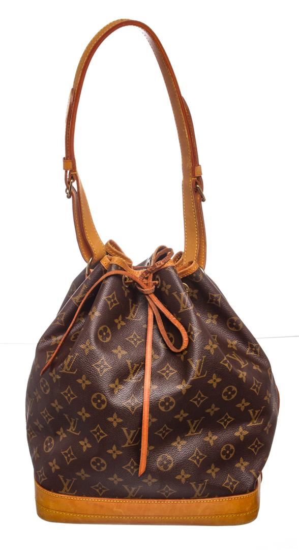 Brown and tan monogram coated canvas Louis Vuitton Noe GM with brass hardware, tan vachetta leather trim, single adjustable flat shoulder strap, brown canvas lining and drawstring closure at top.