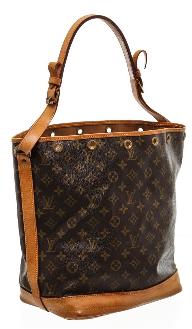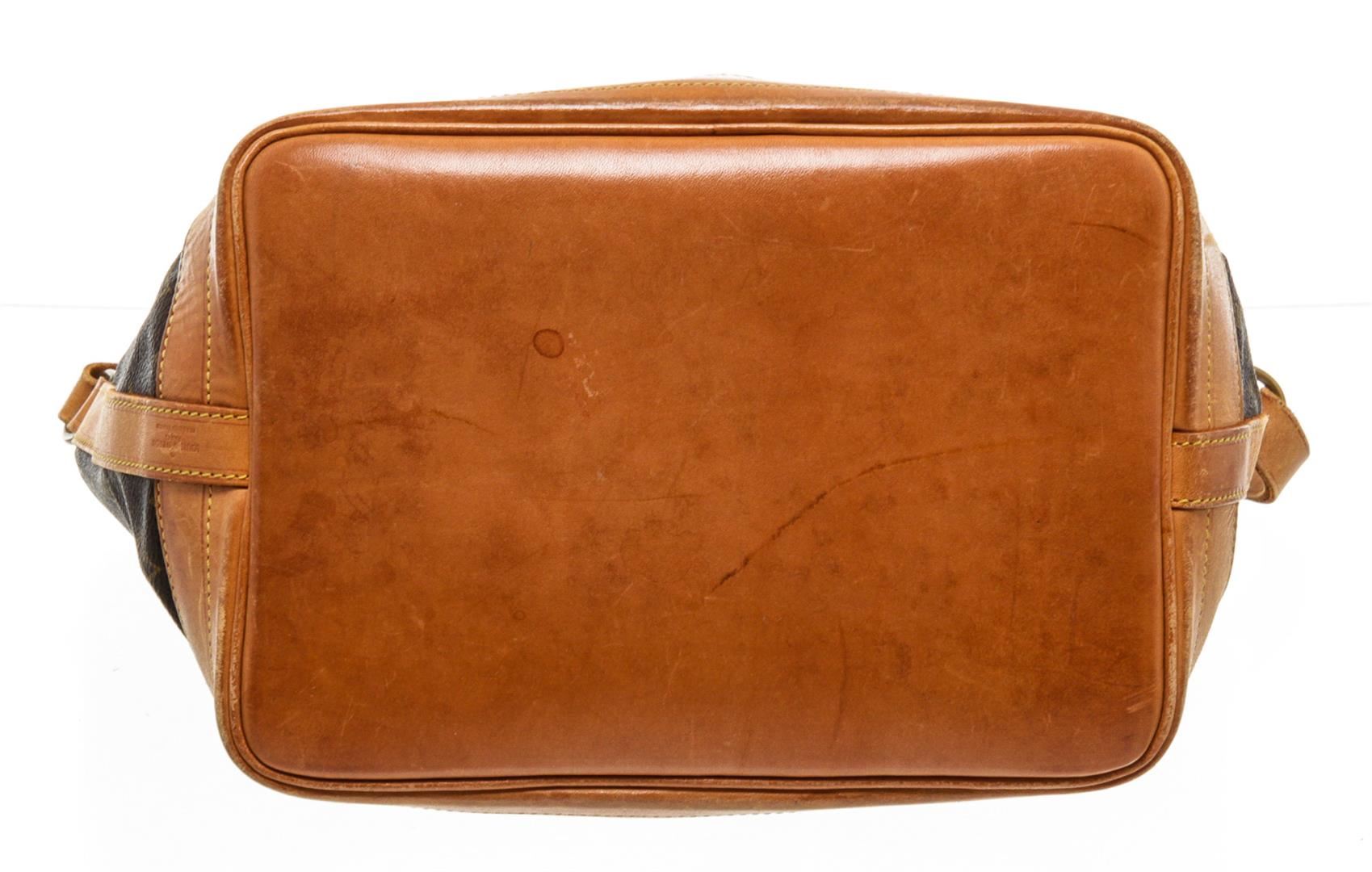 Brown and tan monogram coated canvas Louis Vuitton Noe GM with brass hardware, tan vachetta leather trim, single adjustable flat shoulder strap, brown canvas lining and drawstring closure at top.