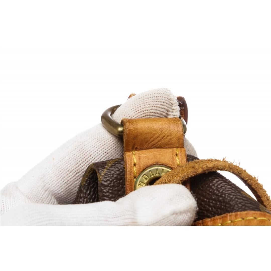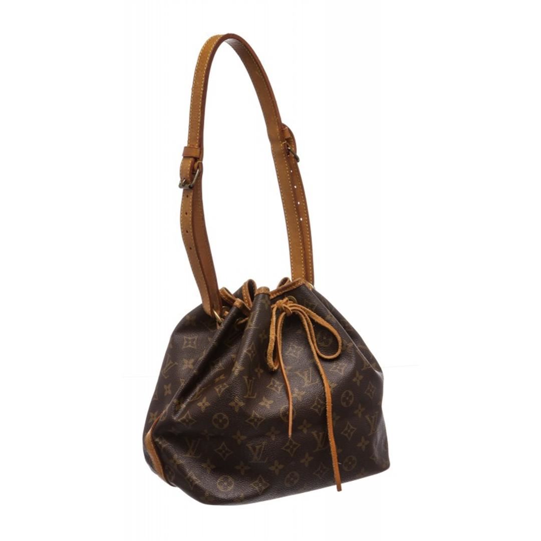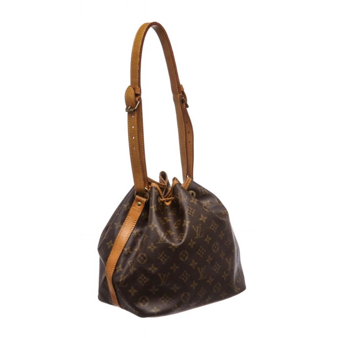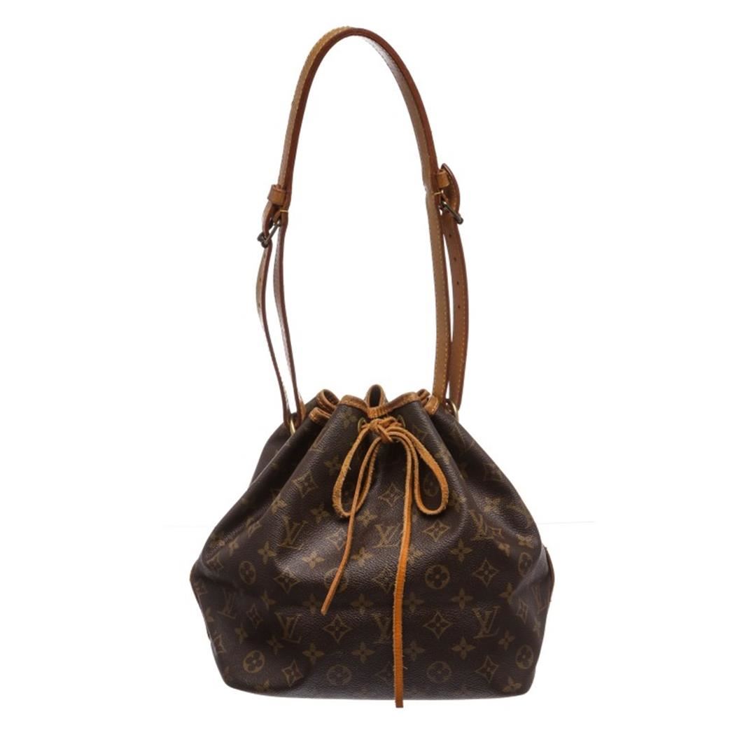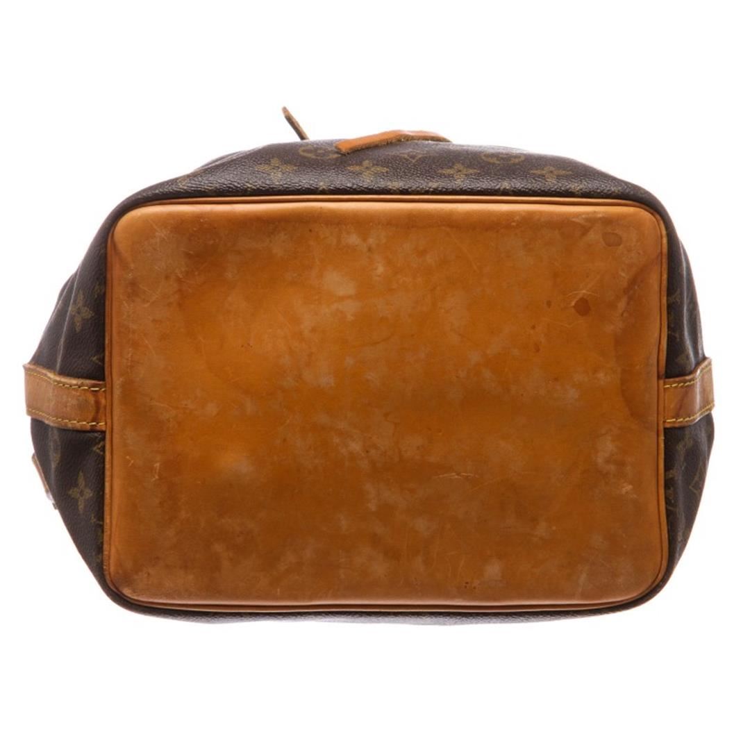 Brown and tan monogram coated canvas Louis Vuitton Noe PM with brass hardware, tan vachetta leather accents, adjustable flat shoulder strap, brown canvas interior and drawstring tie closure at top. Item is Pre-Owned.