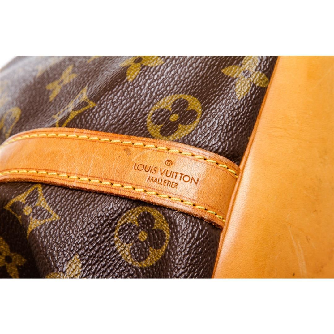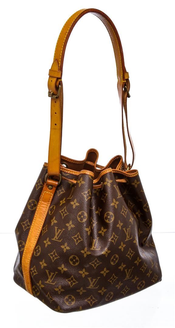 Brown and tan monogram coated canvas Louis Vuitton Noe PM with brass hardware, tan vachetta leather accents, adjustable flat shoulder strap, brown canvas interior and drawstring tie closure at top.