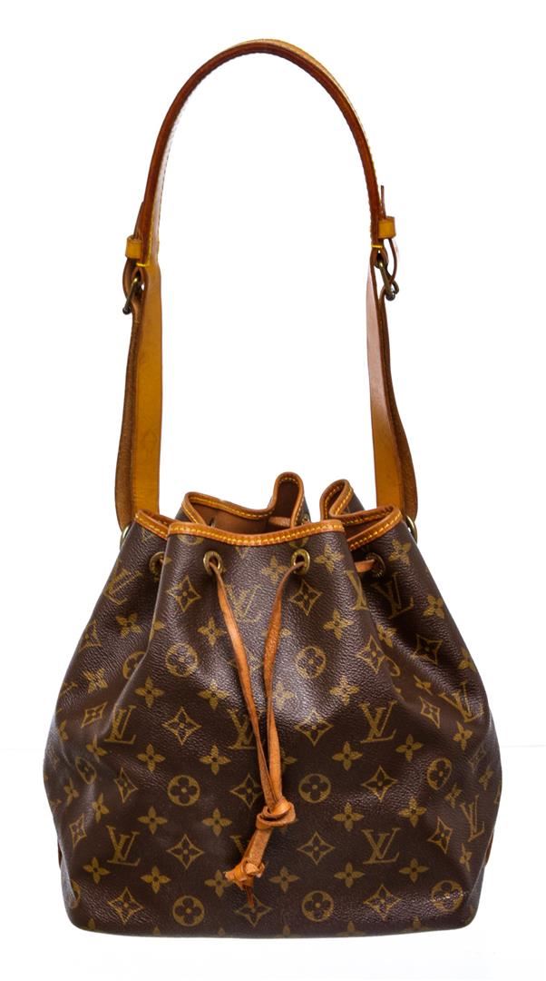 Brown and tan monogram coated canvas Louis Vuitton Noe PM with brass hardware, tan vachetta leather accents, adjustable flat shoulder strap, brown canvas interior and drawstring tie closure at top.