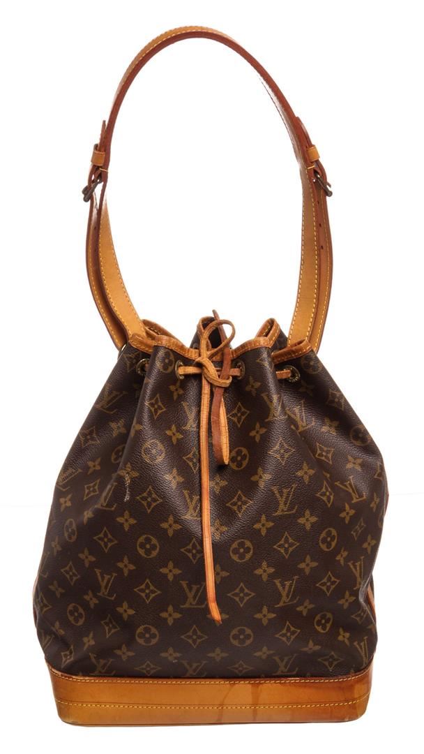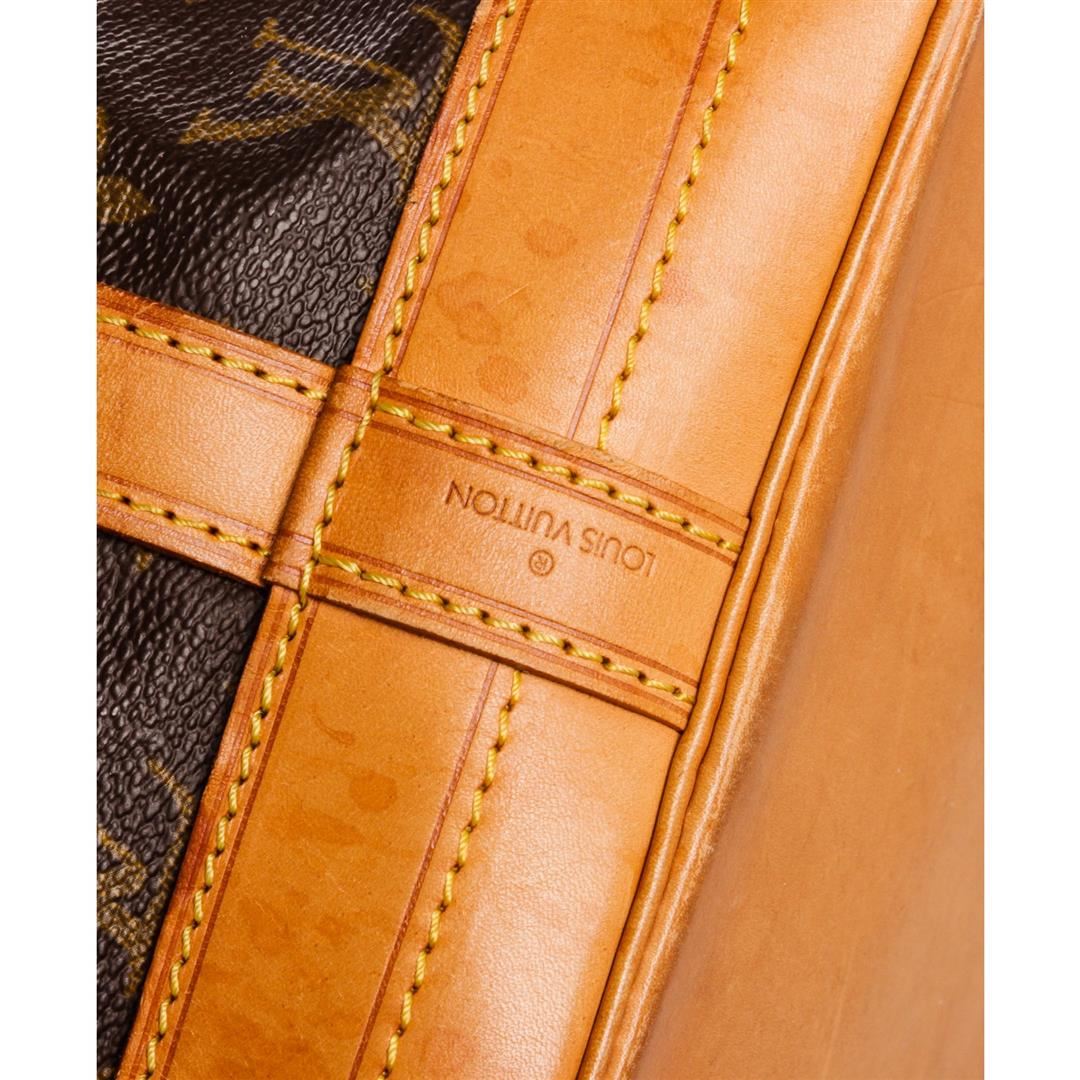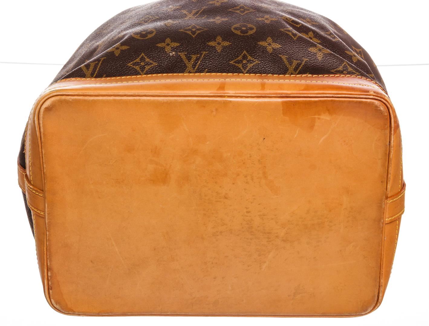 Brown and tan monogram coated canvas Louis Vuitton Noe PM with brass hardware, tan vachetta leather accents, adjustable flat shoulder strap, brown canvas interior and drawstring tie closure at top.