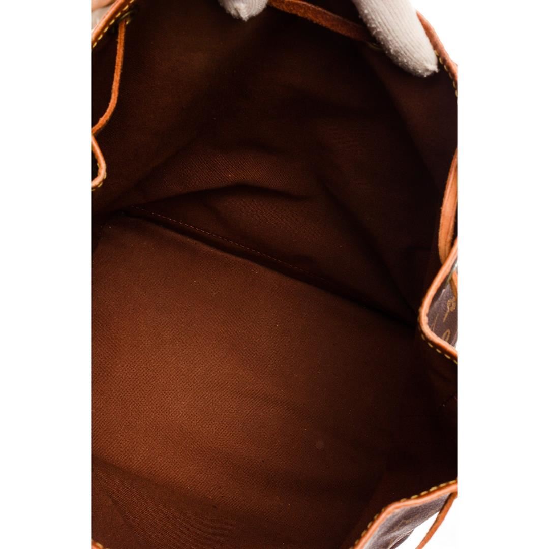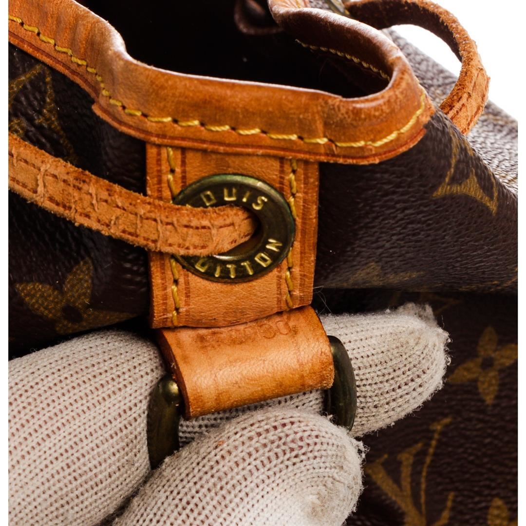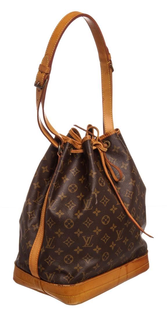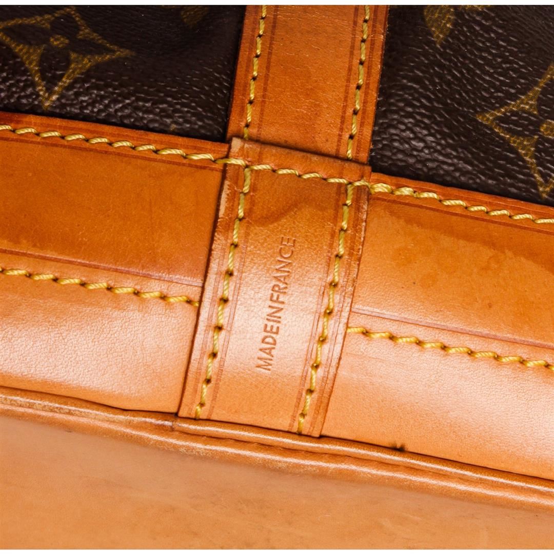 Brown and tan monogram coated canvas Louis Vuitton Noe PM with brass hardware, tan vachetta leather accents, adjustable flat shoulder strap, brown canvas interior and drawstring tie closure at top.