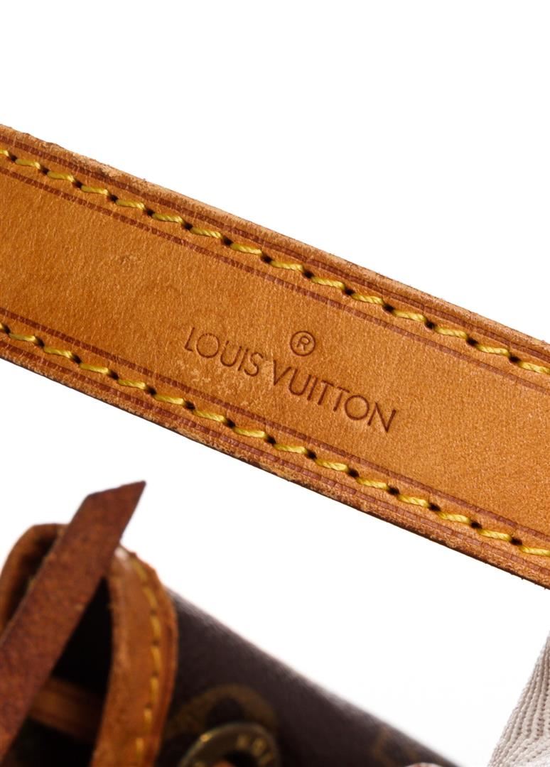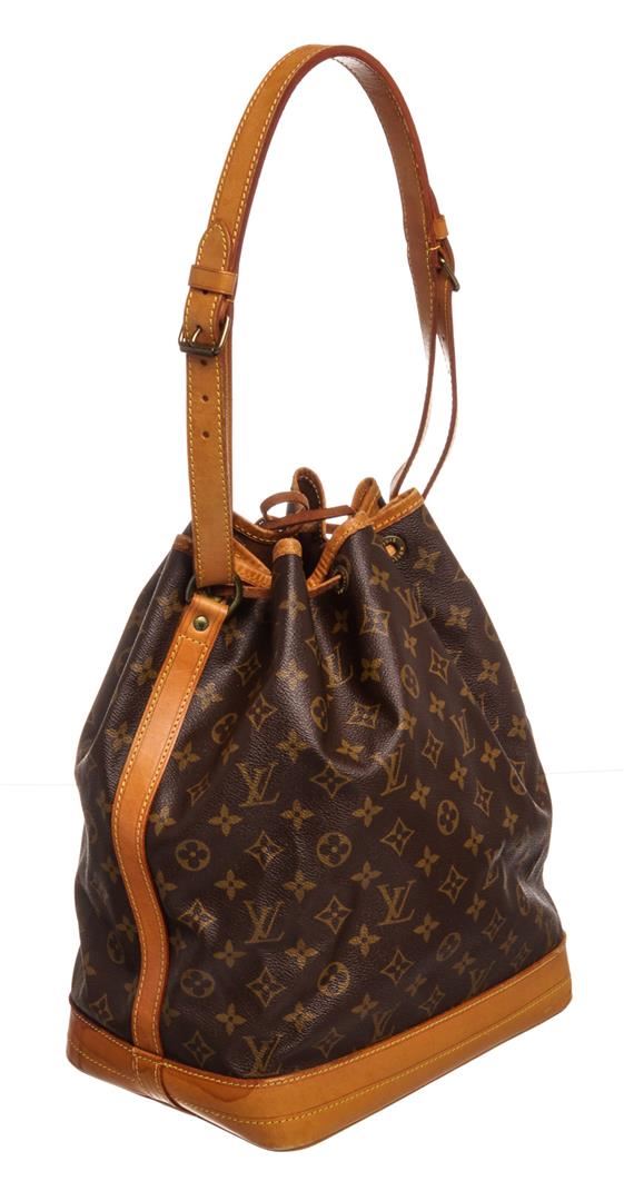 Brown and tan monogram coated canvas Louis Vuitton Noe PM with brass hardware, tan vachetta leather accents, adjustable flat shoulder strap, brown canvas interior and drawstring tie closure at top.