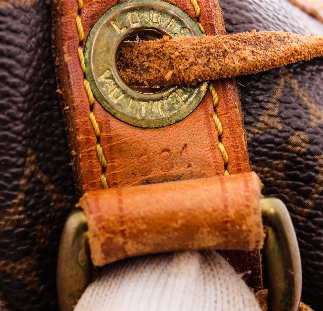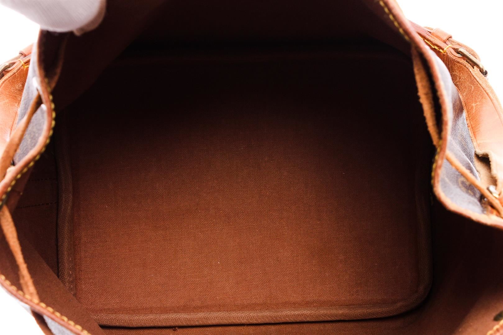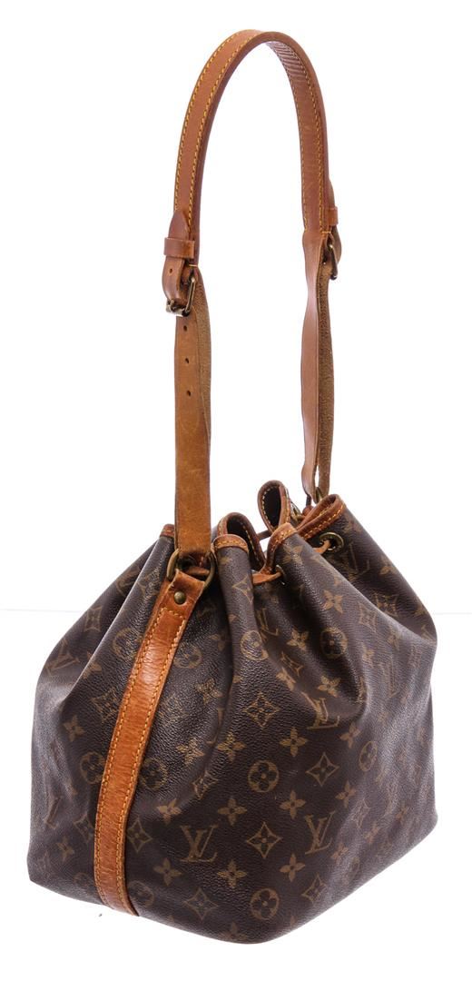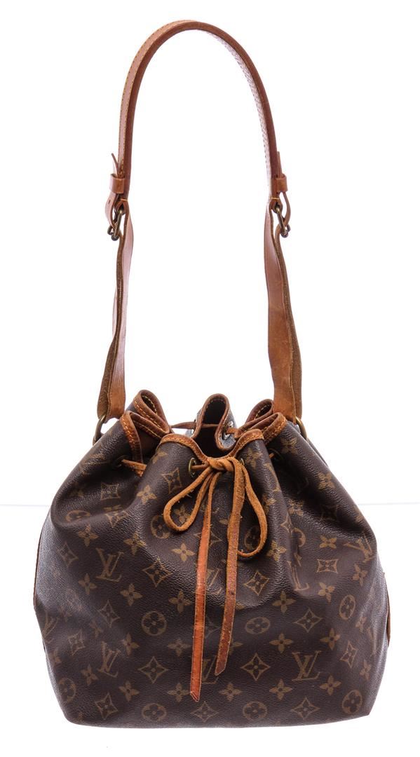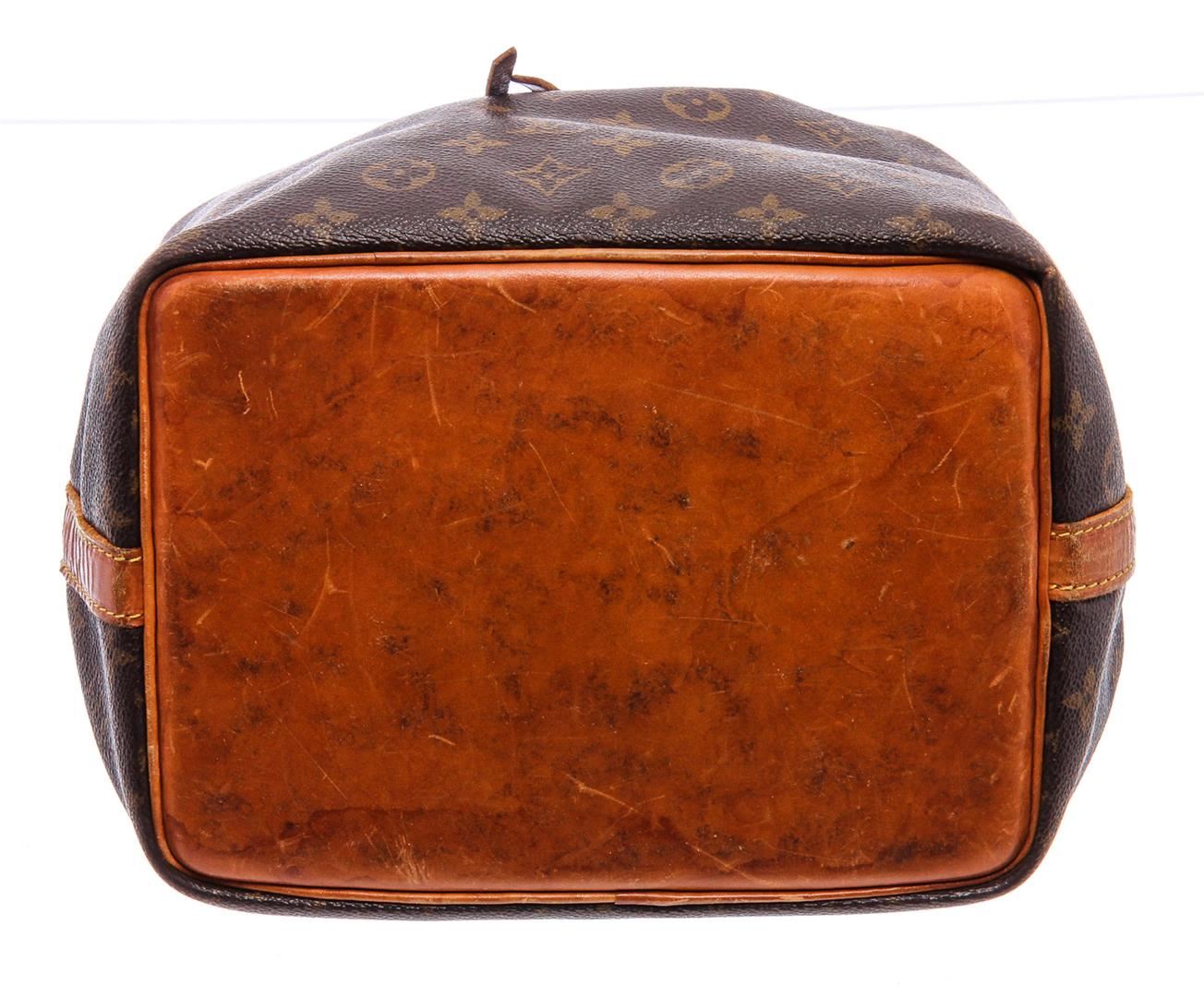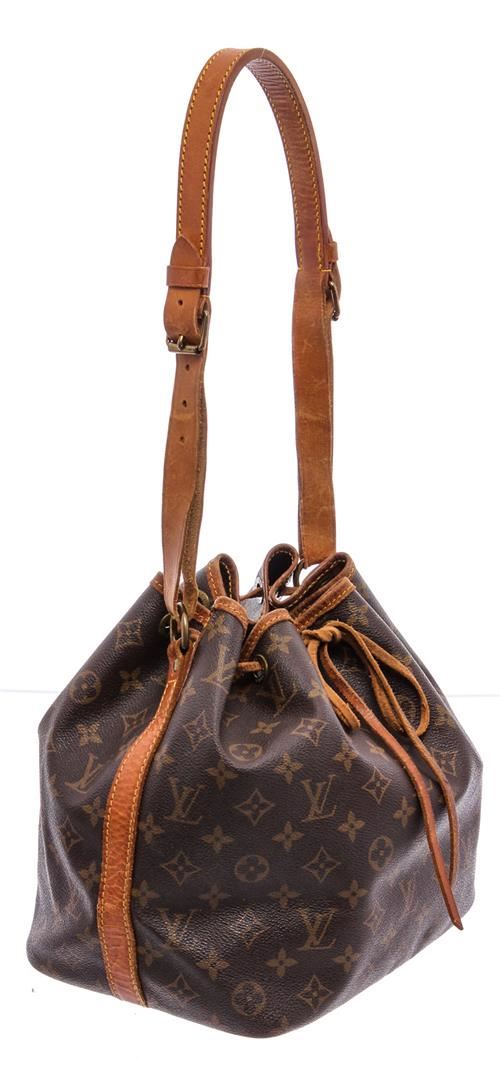 One Louis Vuitton Monogram Canvas Leather Noe PM Drawstring Shoulder Bag. Brown and tan monogram coated canvas Louis Vuitton Noe PM with brass hardware, tan vachetta leather accents, adjustable flat shoulder strap, brown canvas interior and drawstring tie closure at top.