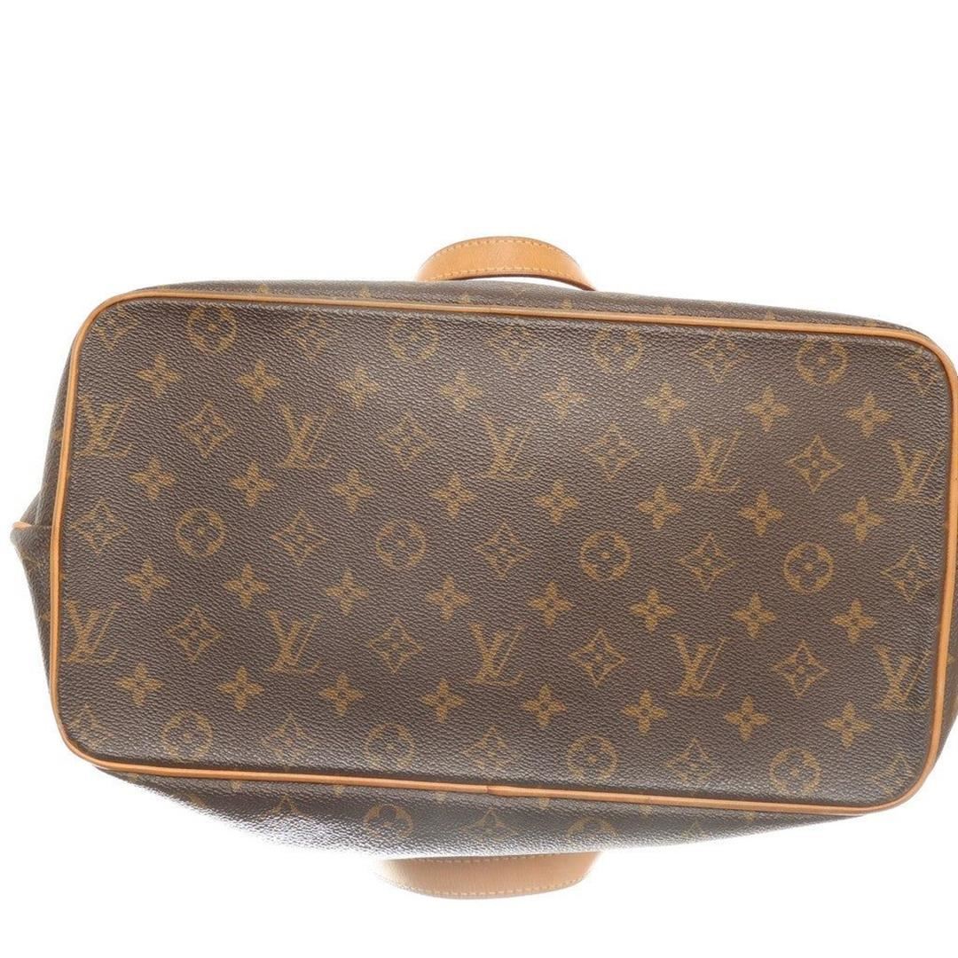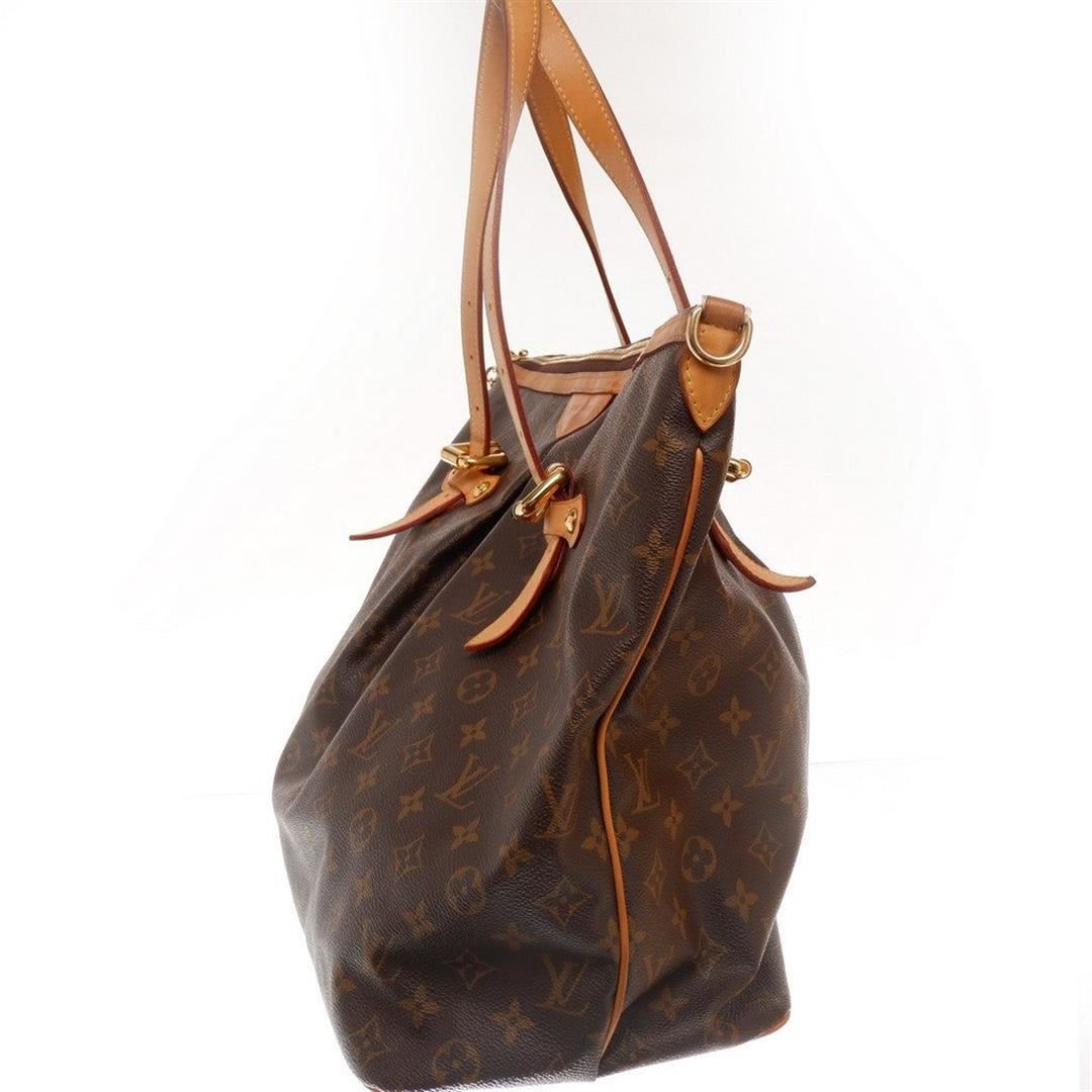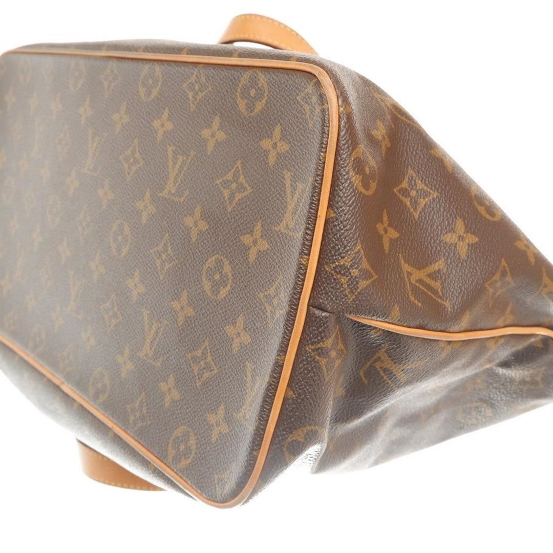 Brown and tan monogram coated canvas Louis Vuitton Palermo GM with gold-tone hardware, tan vachetta leather trim, dual flat adjustable top handles, and pleated detail at exterior, brown woven lining, three interior slit pockets and zip closure at top, opt
