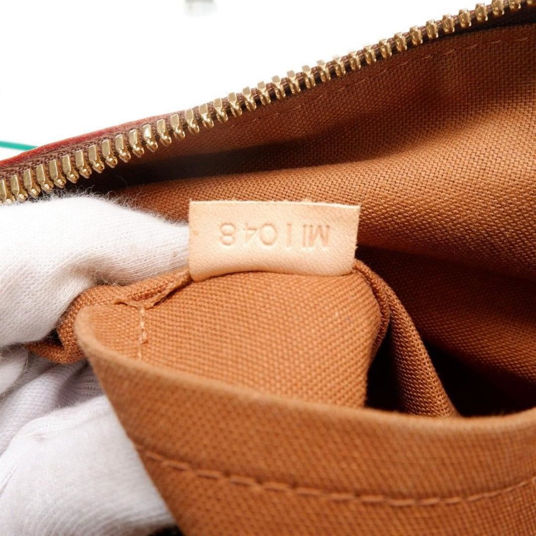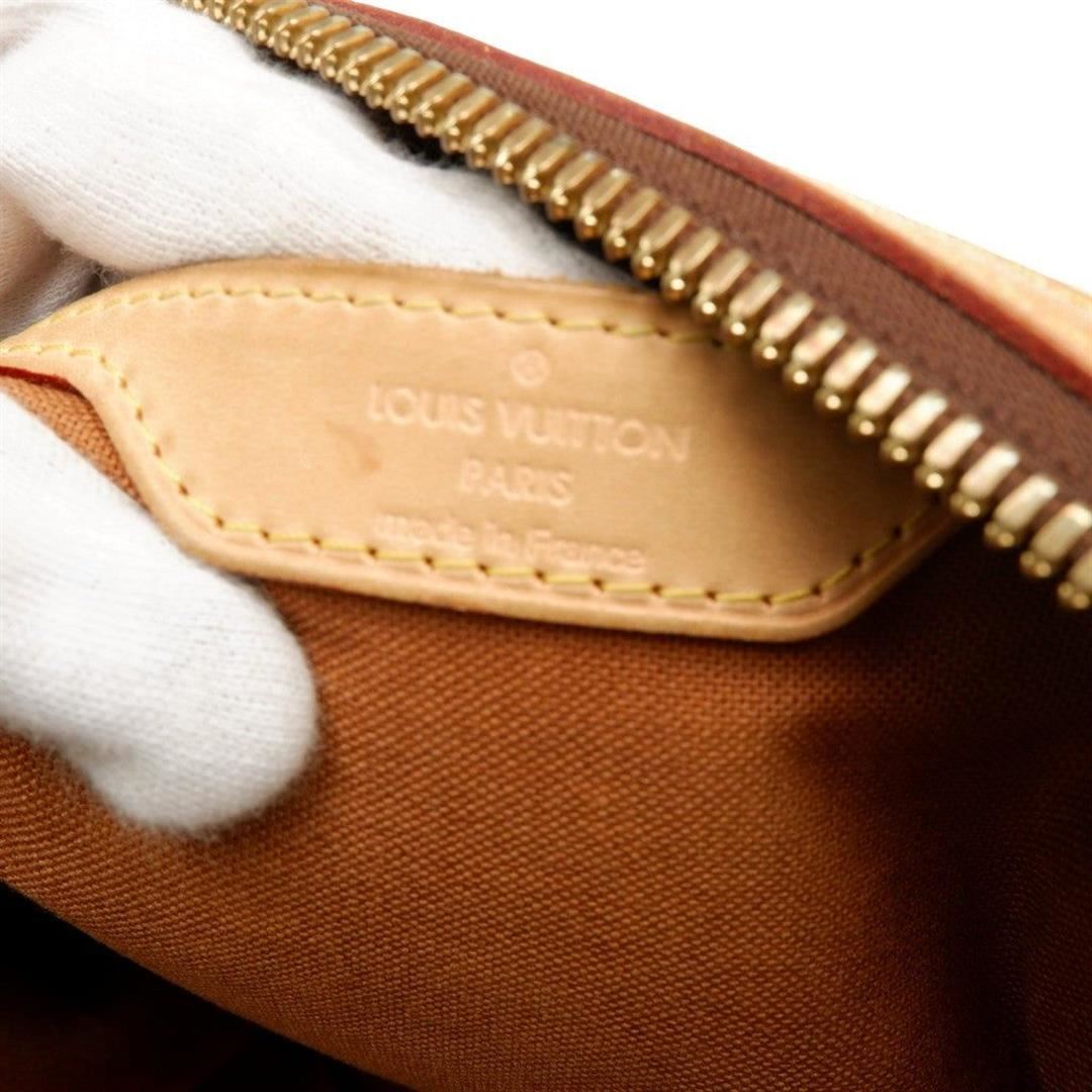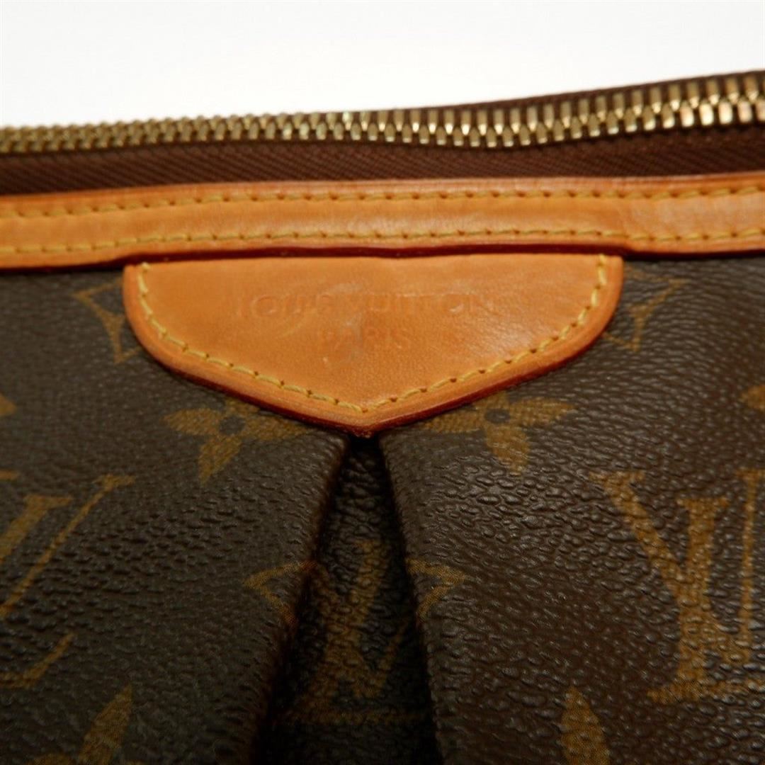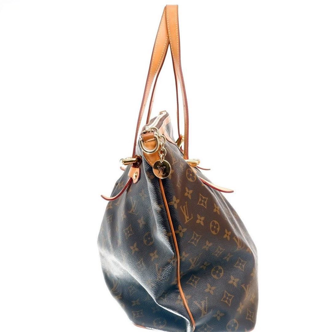 Brown and tan monogram coated canvas Louis Vuitton Palermo GM with gold-tone hardware, tan vachetta leather trim, dual flat adjustable top handles, and pleated detail at exterior, brown woven lining, three interior slit pockets and zip closure at top, opt