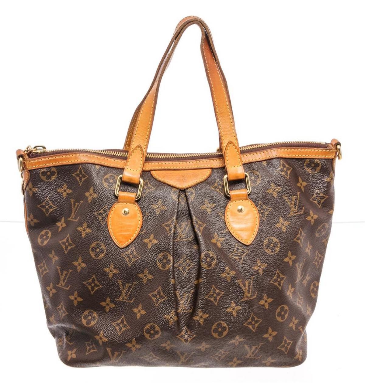 Brown and tan monogram coated canvas Louis Vuitton Palermo PM with brass hardware, dual flat top handles, tan vachetta leather trim, embossed logo at front face, pleated accents at exterior, brown canvas lining, three slit pockets at interior walls and zip closure at top.