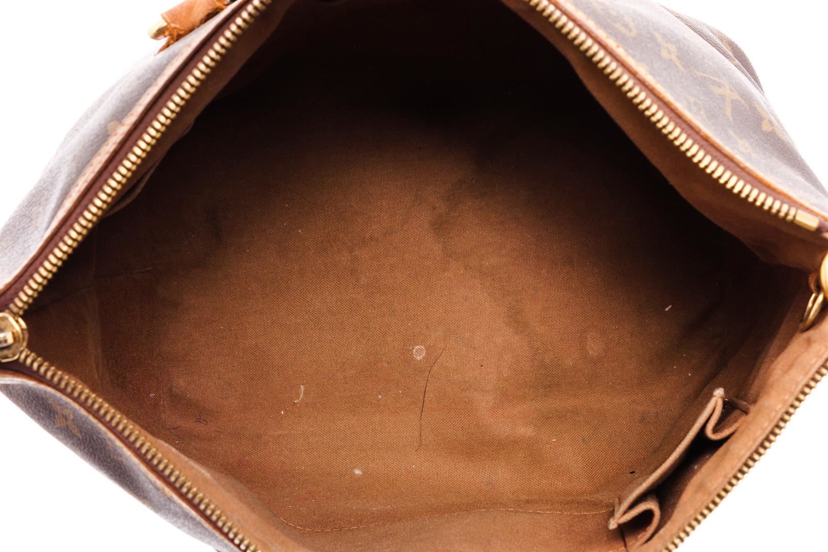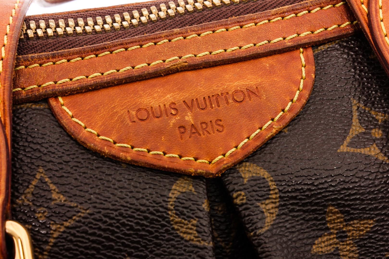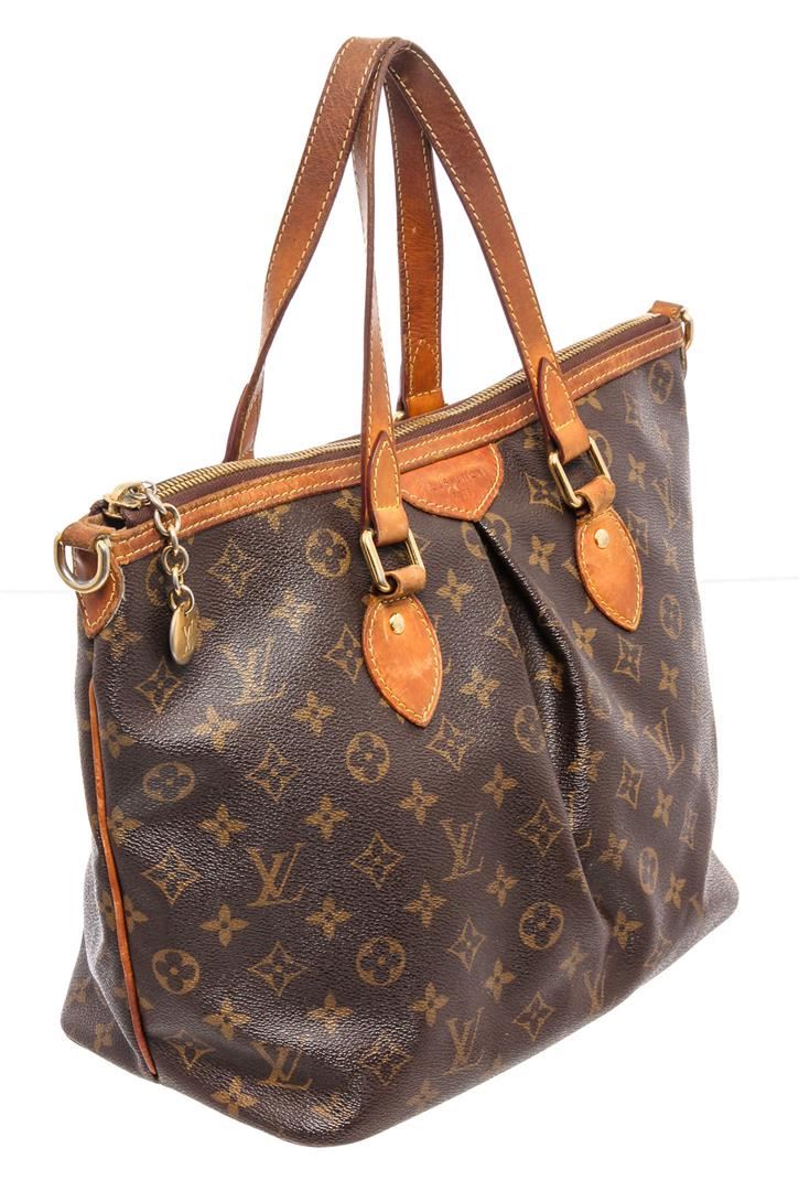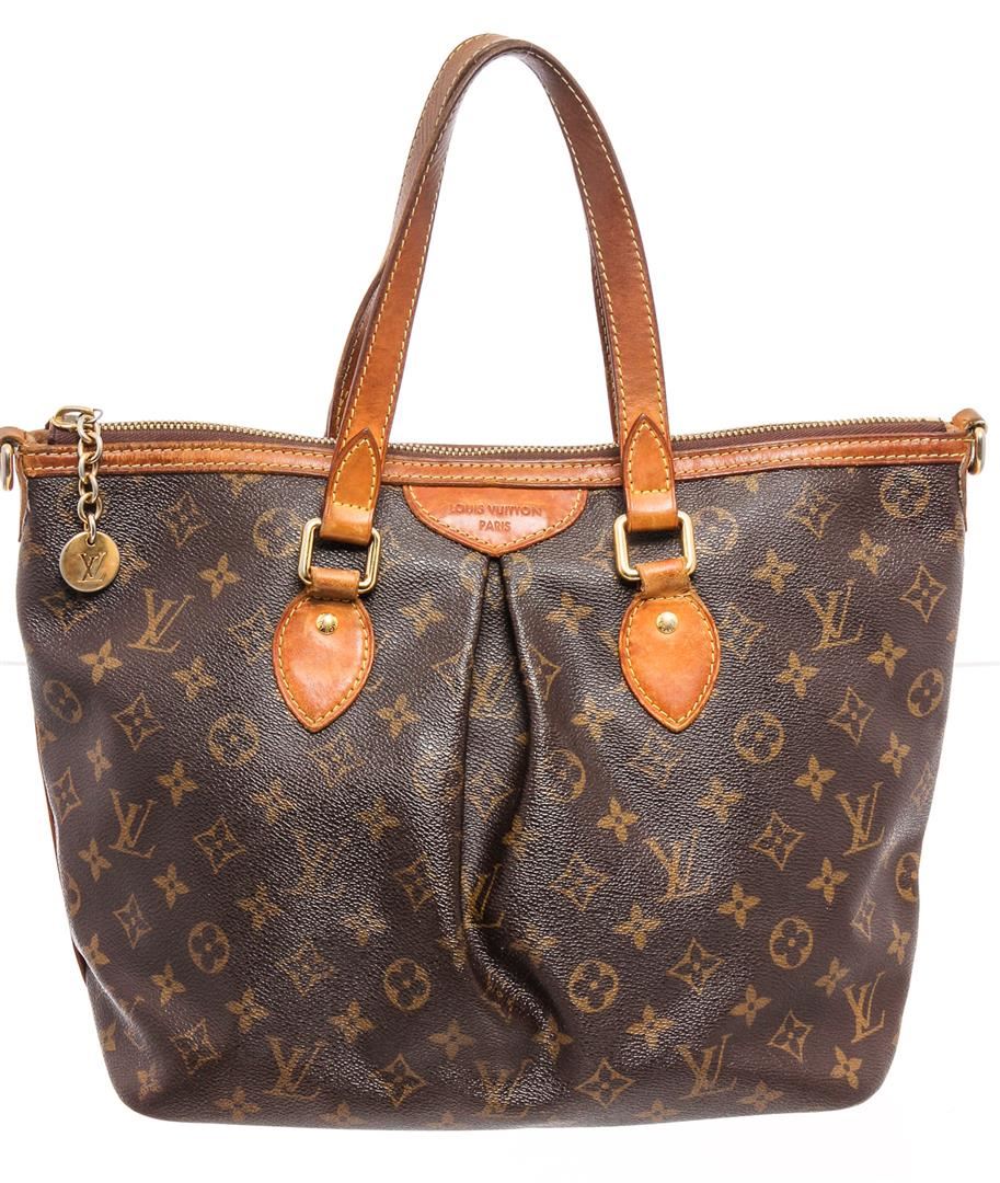 Brown and tan monogram coated canvas Louis Vuitton Palermo PM with brass hardware, dual flat top handles, tan vachetta leather trim, embossed logo at front face, pleated accents at exterior, brown canvas lining, three slit pockets at interior walls and zip closure at top.