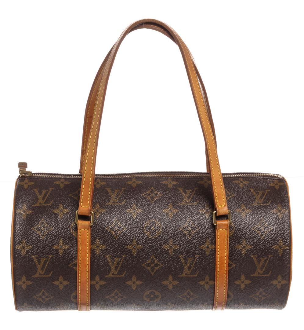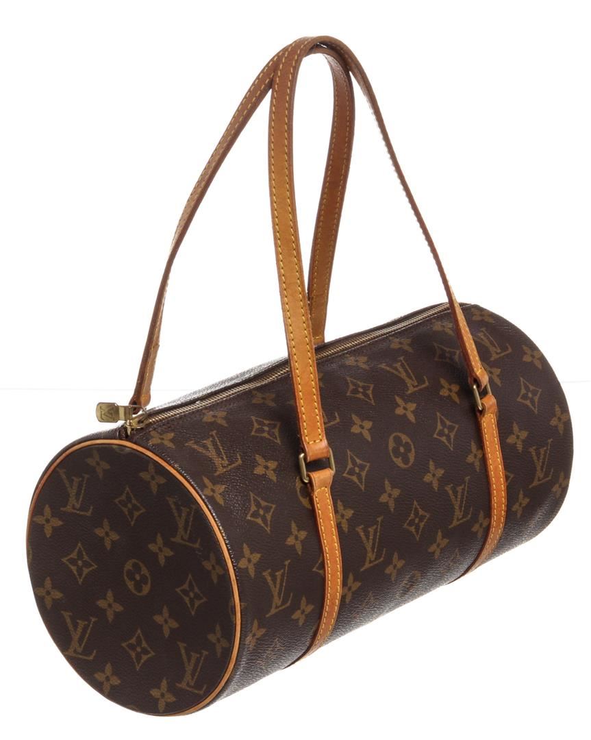 Brown and tan monogram coated canvas Louis Vuitton Papillon 30 with brass hardware, tan vachetta leather trim, dual flat handles, brown Taiga leather interior and zip closure at top.