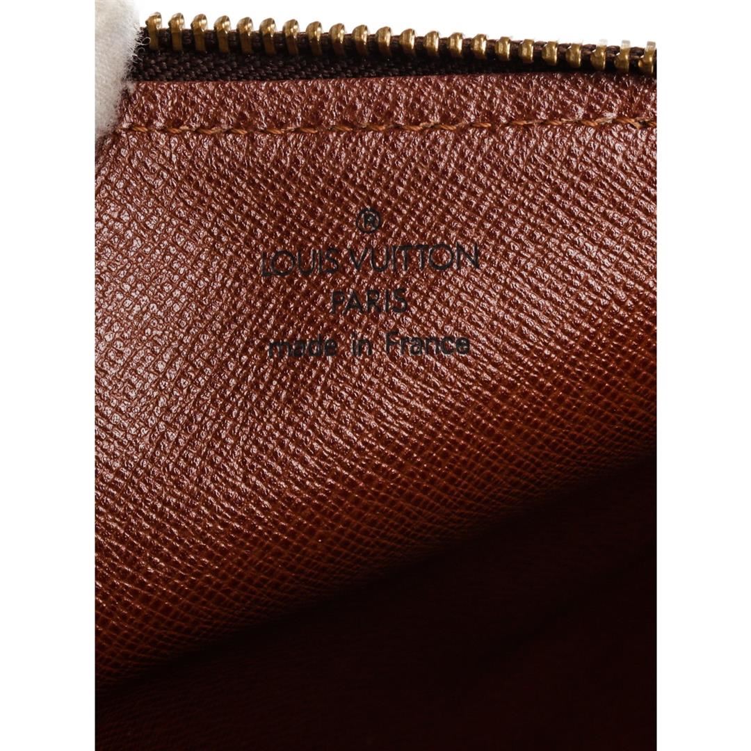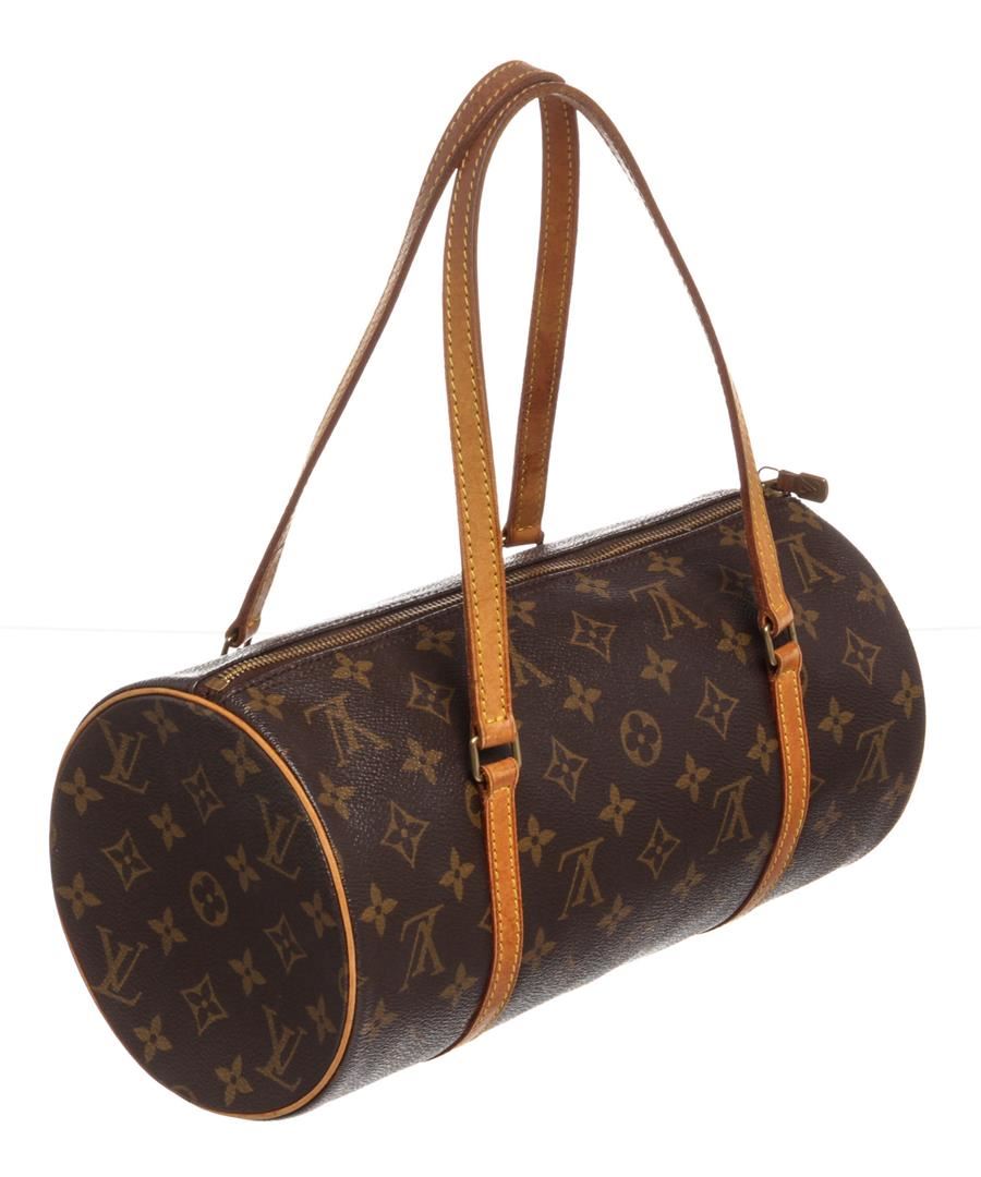 Brown and tan monogram coated canvas Louis Vuitton Papillon 30 with brass hardware, tan vachetta leather trim, dual flat handles, brown Taiga leather interior and zip closure at top.