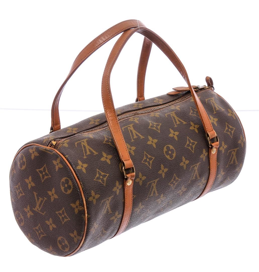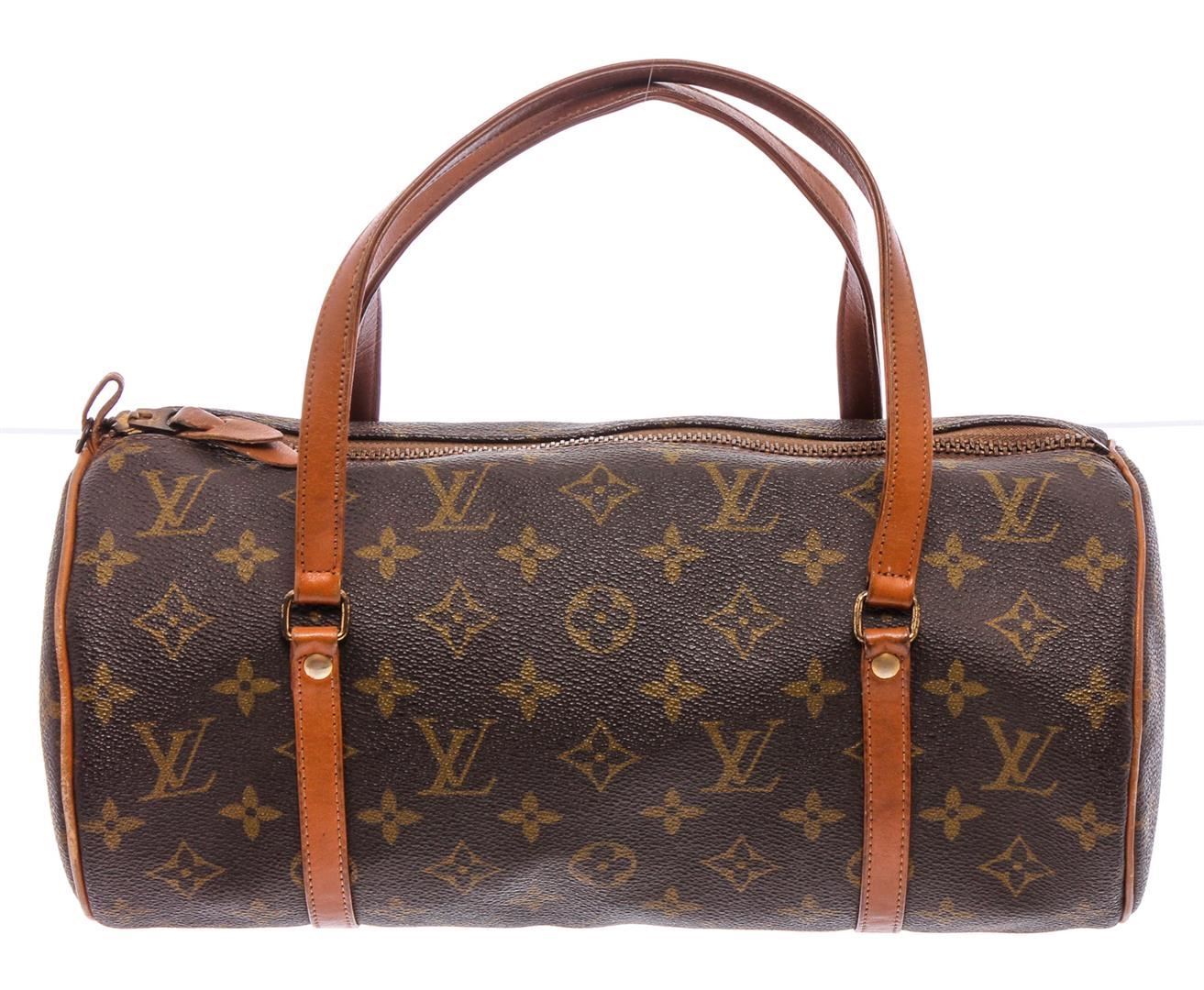 One Louis Vuitton Monogram Canvas Leather Papillon 30 cm Shoulder Bag. Brown and tan monogram coated canvas Louis Vuitton Papillon with brass hardware, tan vachetta leather trim, dual flat handles, brown Taiga leather interior and zip closure at top.