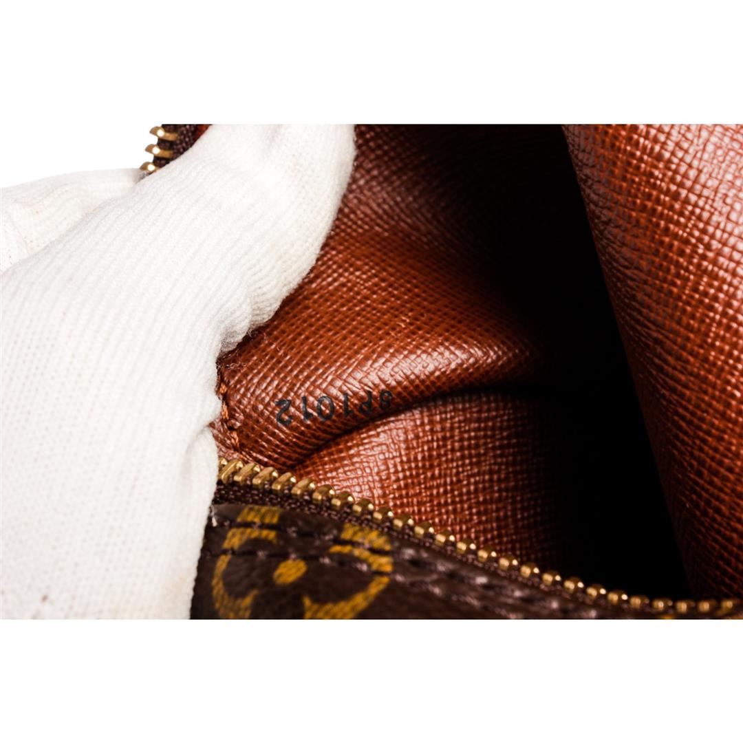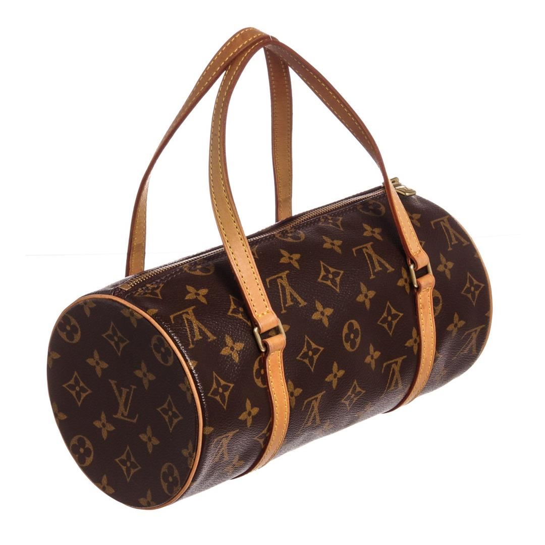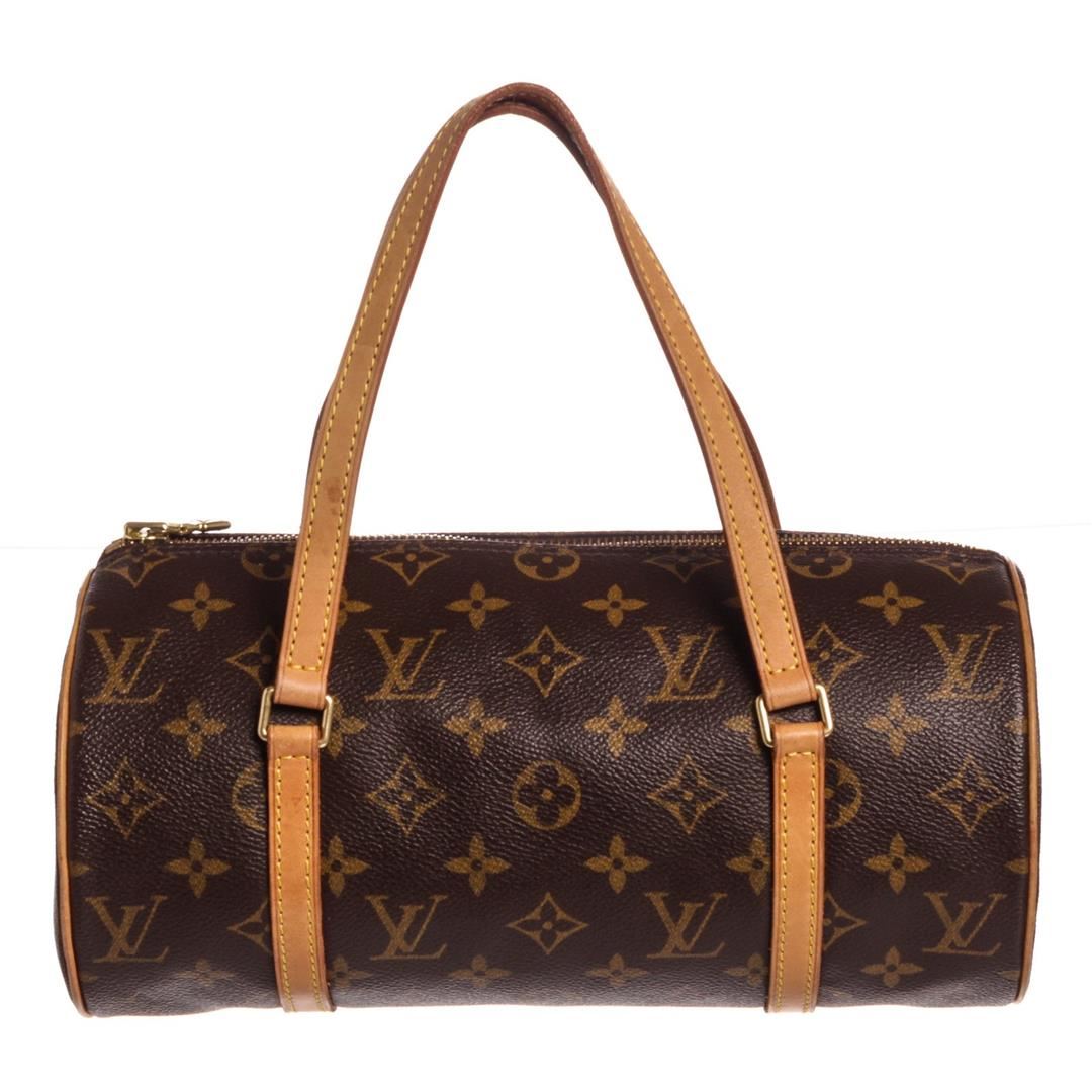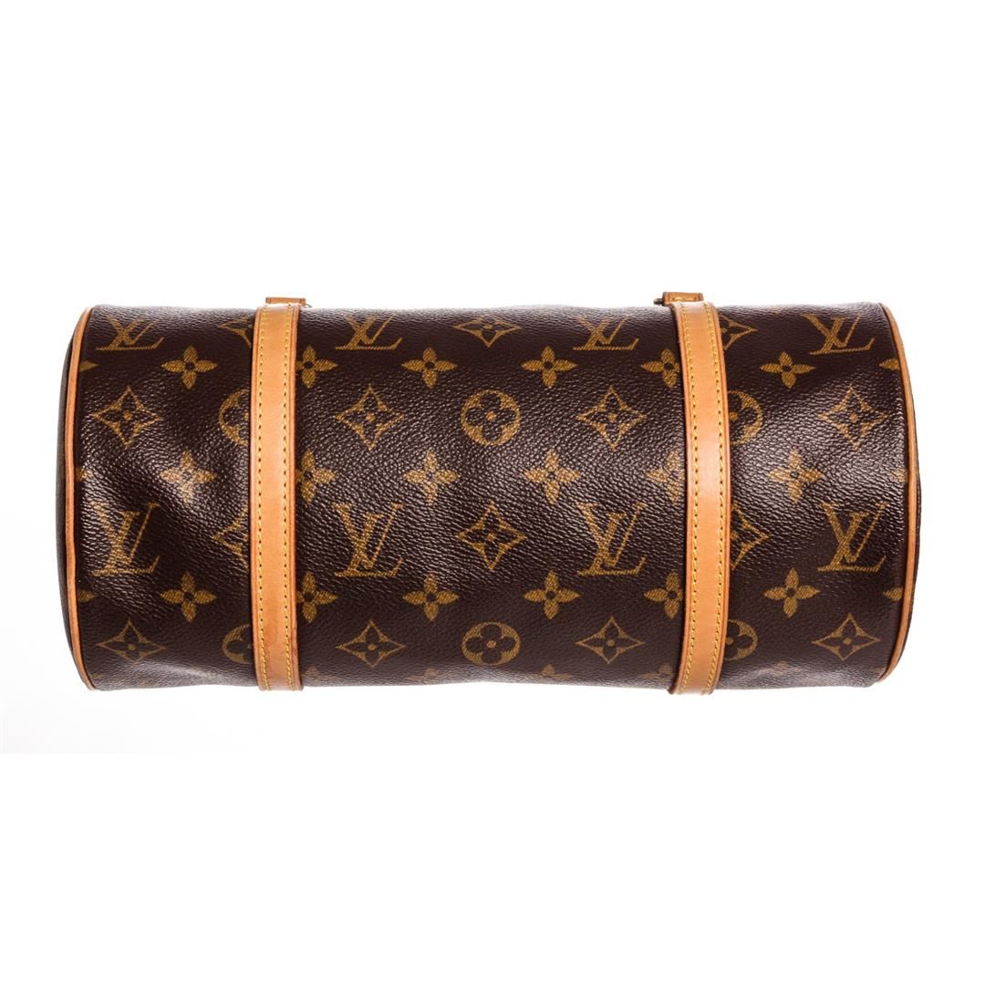 Brown and tan monogram coated canvas Louis Vuitton Papillon with brass hardware, dual flat top handles, tan vachetta leather trim throughout, brown coated lining and zip closure at top. Dimensions = 10"x5"x5.25"xBag Drop:6"/26cmx12.7cmx13.3cmxBag Drop:15.2cm. Item is pre-owned.