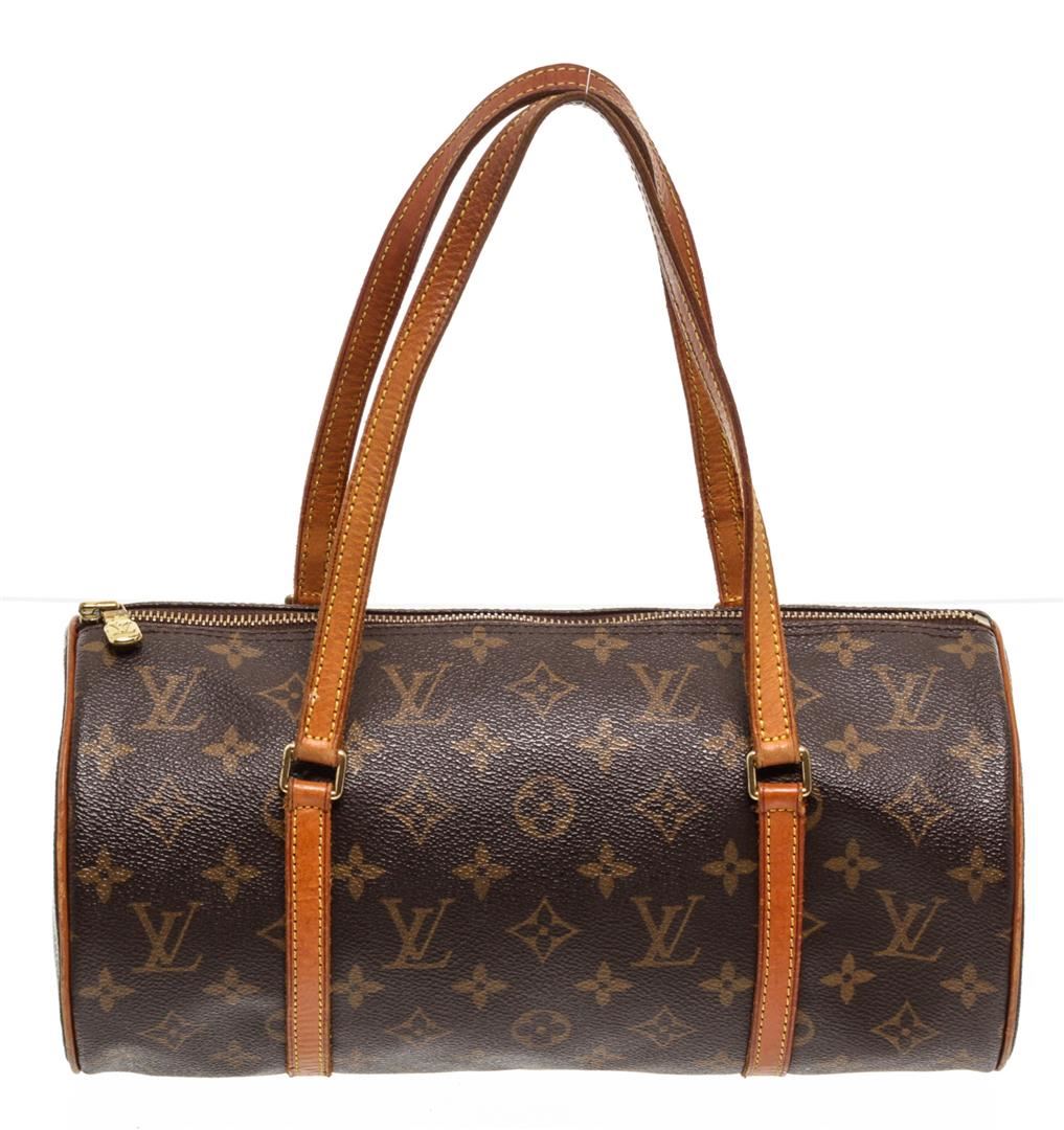 Brown and tan monogram coated canvas Louis Vuitton Papillon with brass hardware, dual flat top handles, tan vachetta leather trim throughout, brown coated lining and zip closure at top.