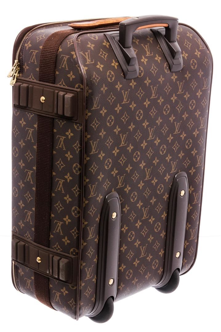 Brown and tan monogram coated canvas Louis Vuitton Pégase 50 with brass hardware, tan vachetta leather trim, single flat top handle, retractable pull handle at top, single exterior zip pocket, dual wheels and protective feet at base, brown nylon lining, compression flaps at interior with velcro closures, dual interior zip pockets and two-way zip closure at exterior.