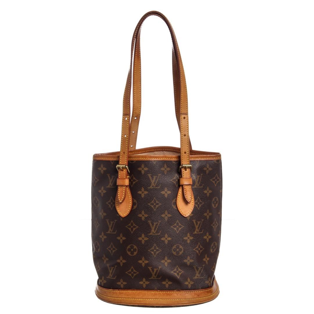 Brown and tan monogram coated canvas Louis Vuitton Petit Bucket bag with brass hardware, tan vachetta leather accents throughout, dual adjustable shoulder straps, beige coated lining, dual pockets at interior walls; one with zip closure and open top.
