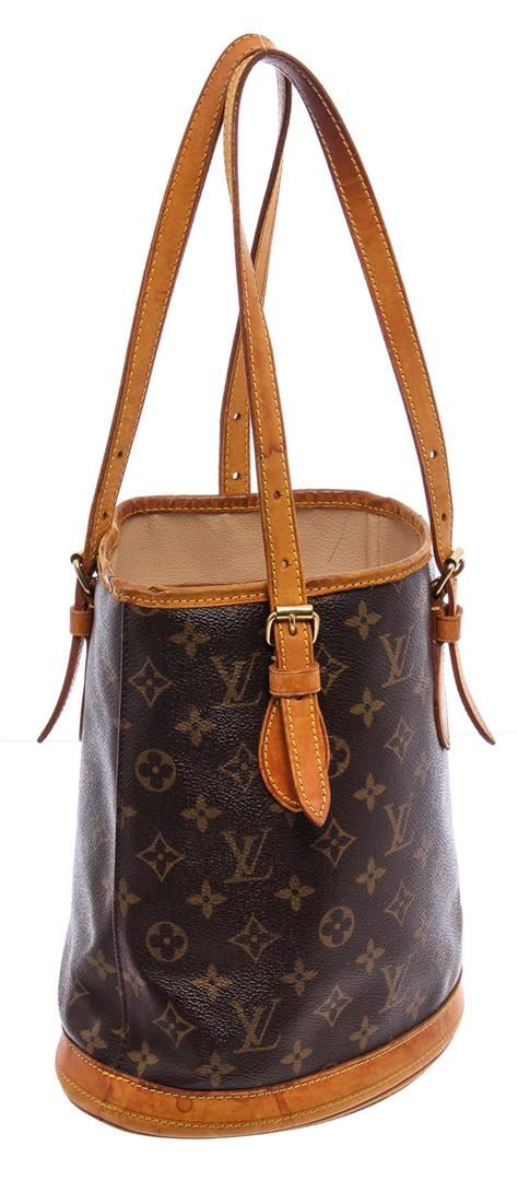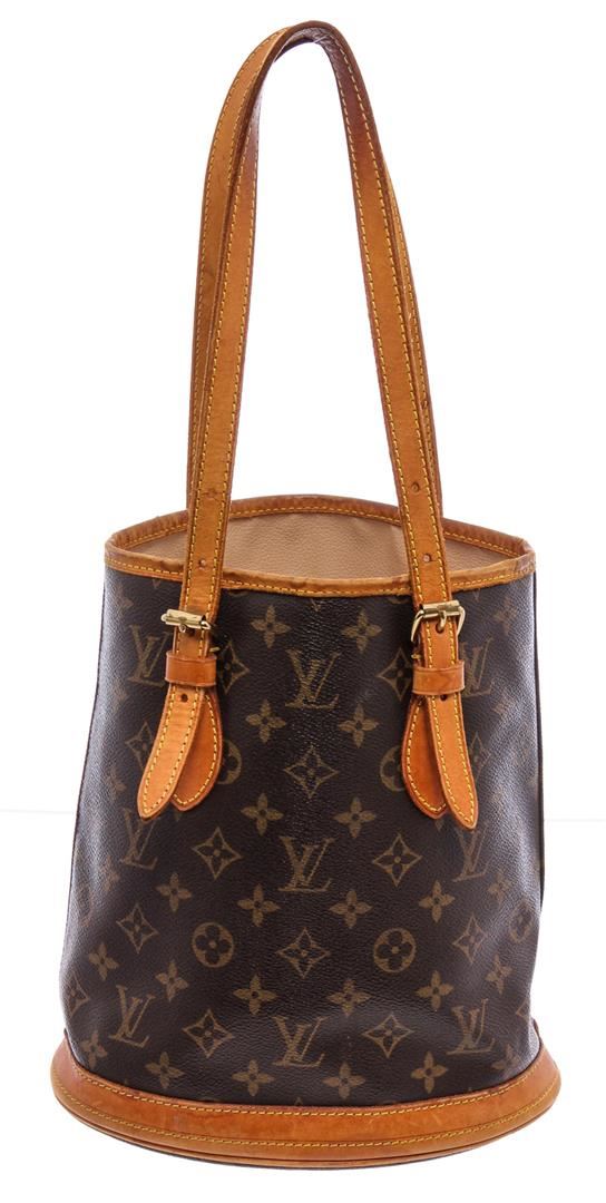One Louis Vuitton Monogram Canvas Leather Petit Bucket PM Bag. Brown and tan monogram coated canvas Louis Vuitton Petit Bucket bag with brass hardware, tan vachetta leather accents throughout, dual adjustable shoulder straps, beige coated lining, dual pockets at interior walls; one with zip closure and open top.
