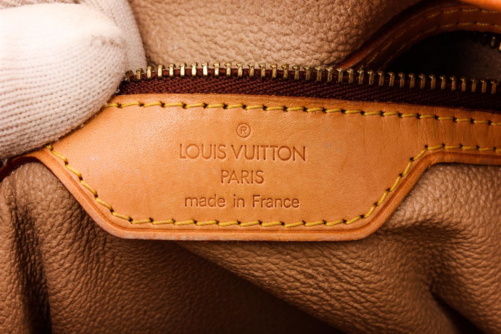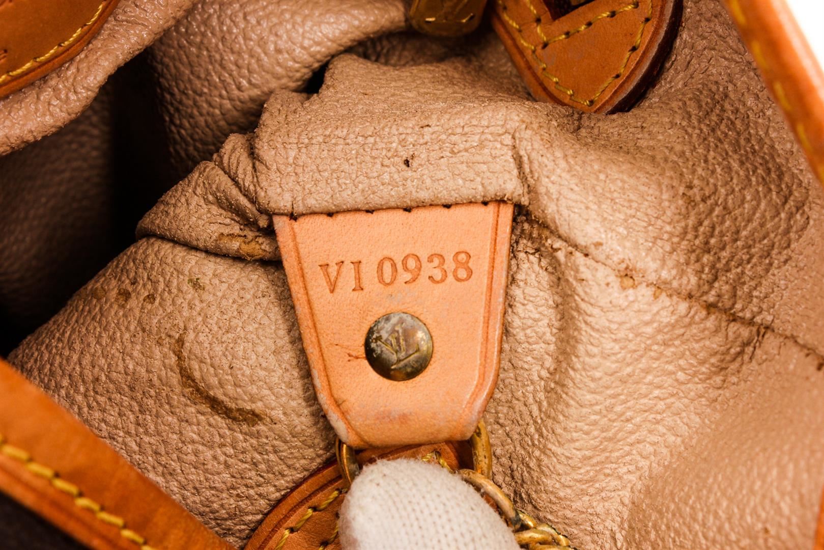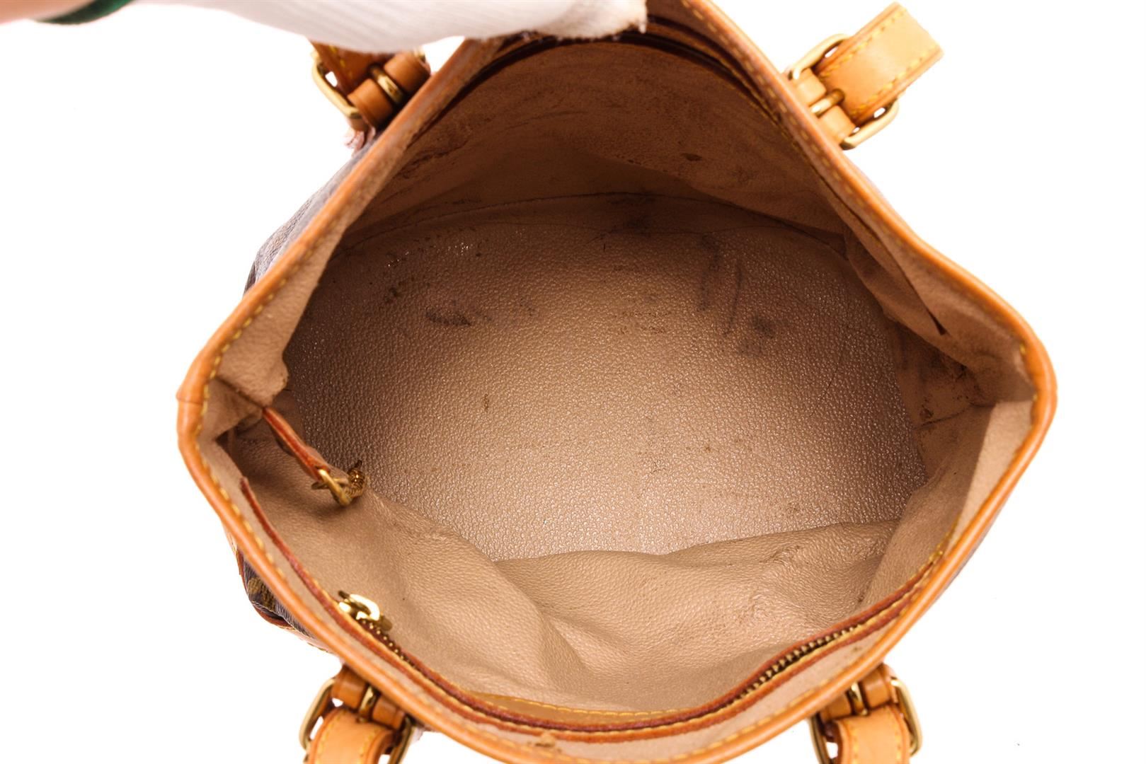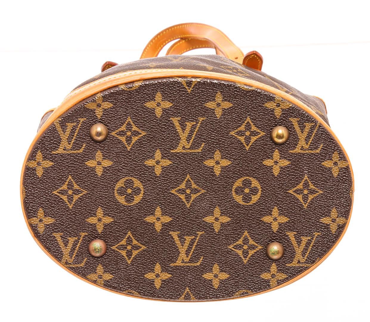Brown and tan monogram coated canvas Louis Vuitton Petit Bucket bag with brass hardware, tan vachetta leather accents throughout, dual adjustable shoulder straps, beige coated lining, dual pockets at interior walls; one with zip closure and open top