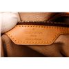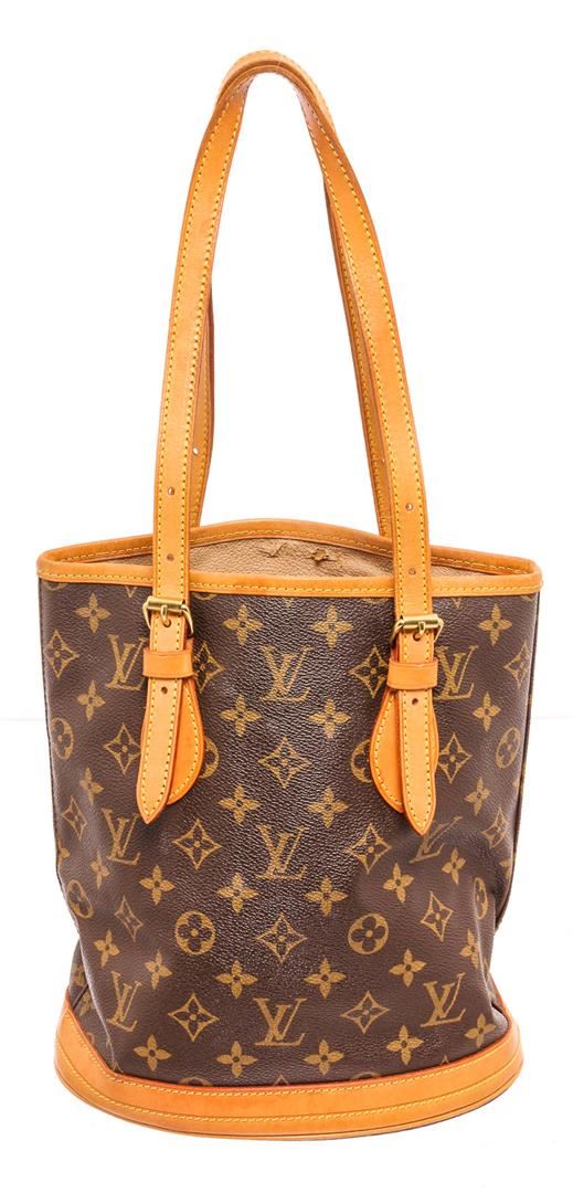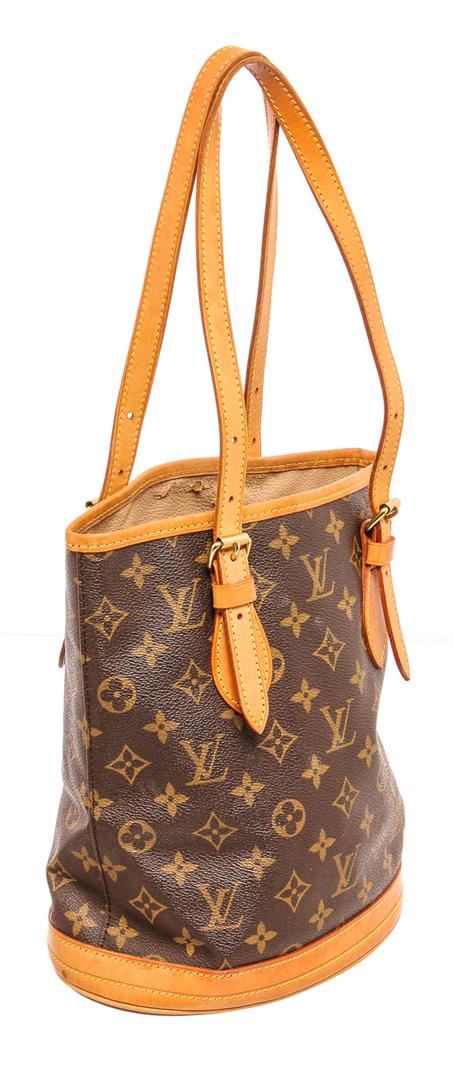 Brown and tan monogram coated canvas Louis Vuitton Petit Bucket bag with brass hardware, tan vachetta leather accents throughout, dual adjustable shoulder straps, beige coated lining, dual pockets at interior walls; one with zip closure and open top