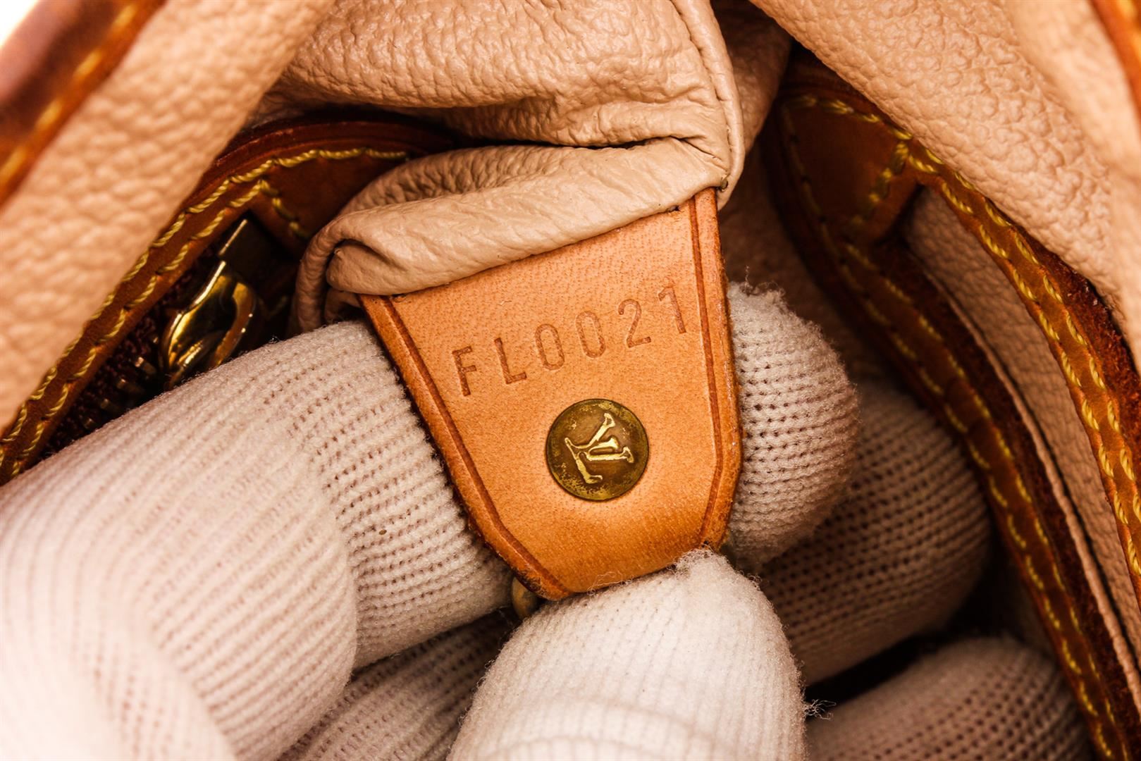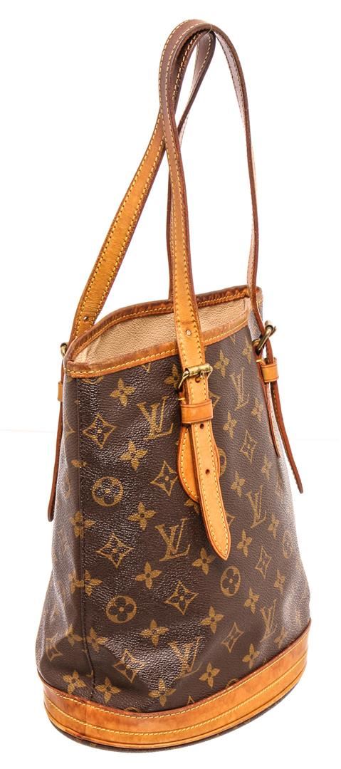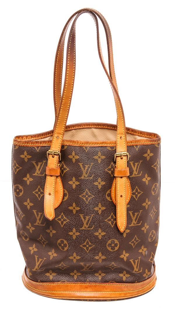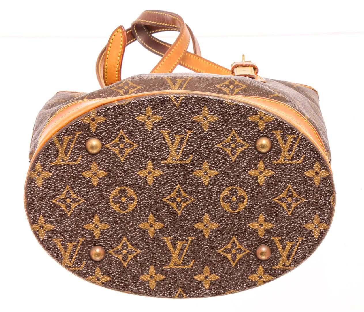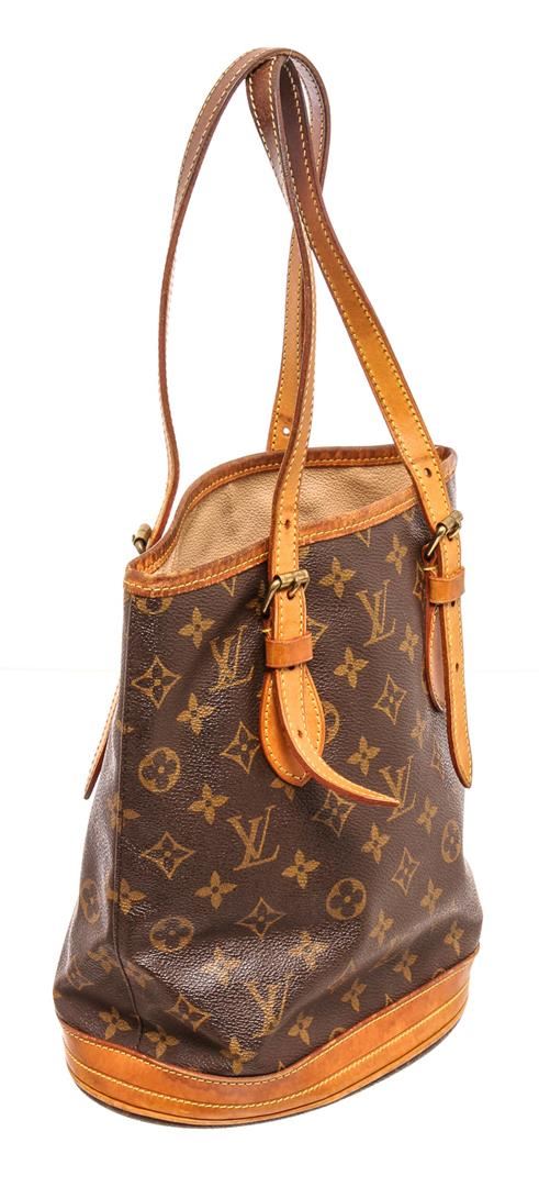 Brown and tan monogram coated canvas Louis Vuitton Petit Bucket bag with brass hardware, tan vachetta leather accents throughout, dual adjustable shoulder straps, beige coated lining, dual pockets at interior walls; one with zip closure and open top.
